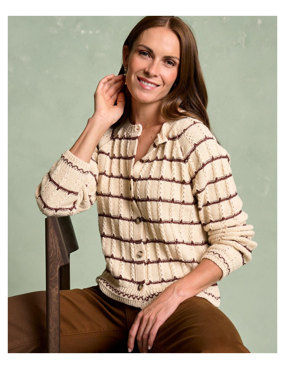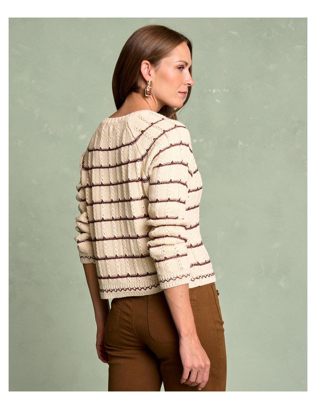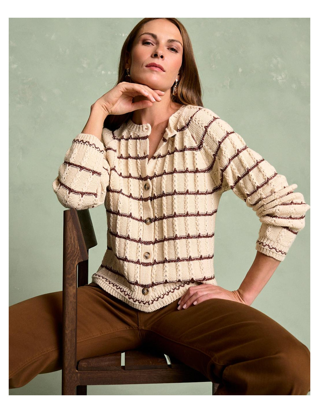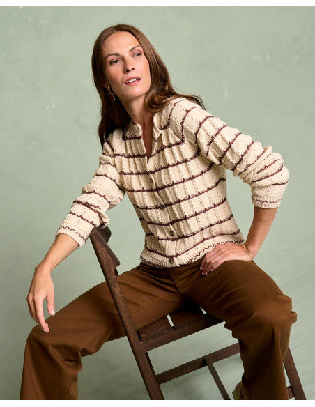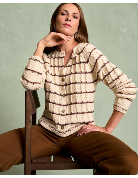 <p><span style="font-size: 10pt; font-family: Arial;">Cárdigan de punto en color crudo con un diseño de rayas, corte holgado y mangas largas ligeramente abullonadas que se ajustan en los puños.</span></p>