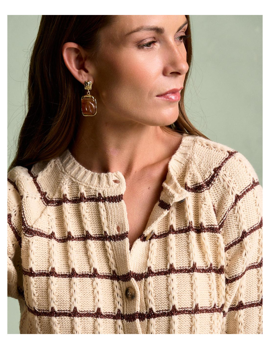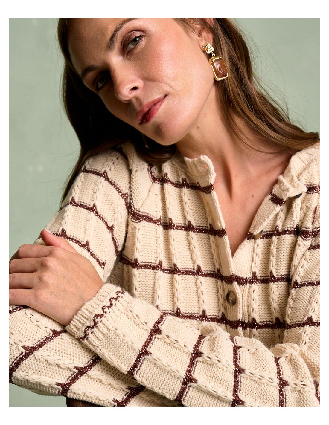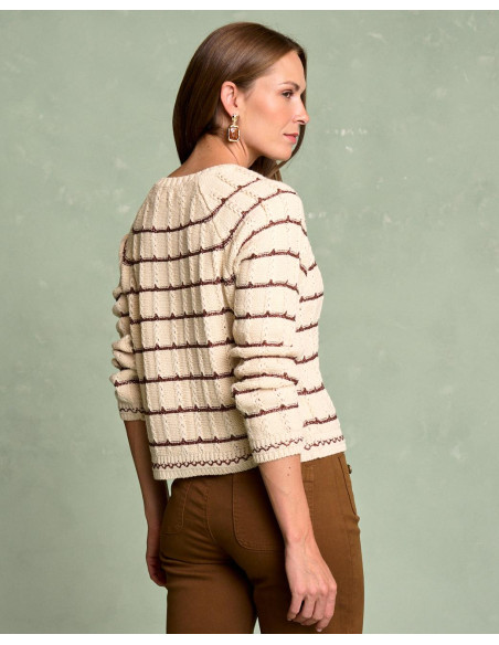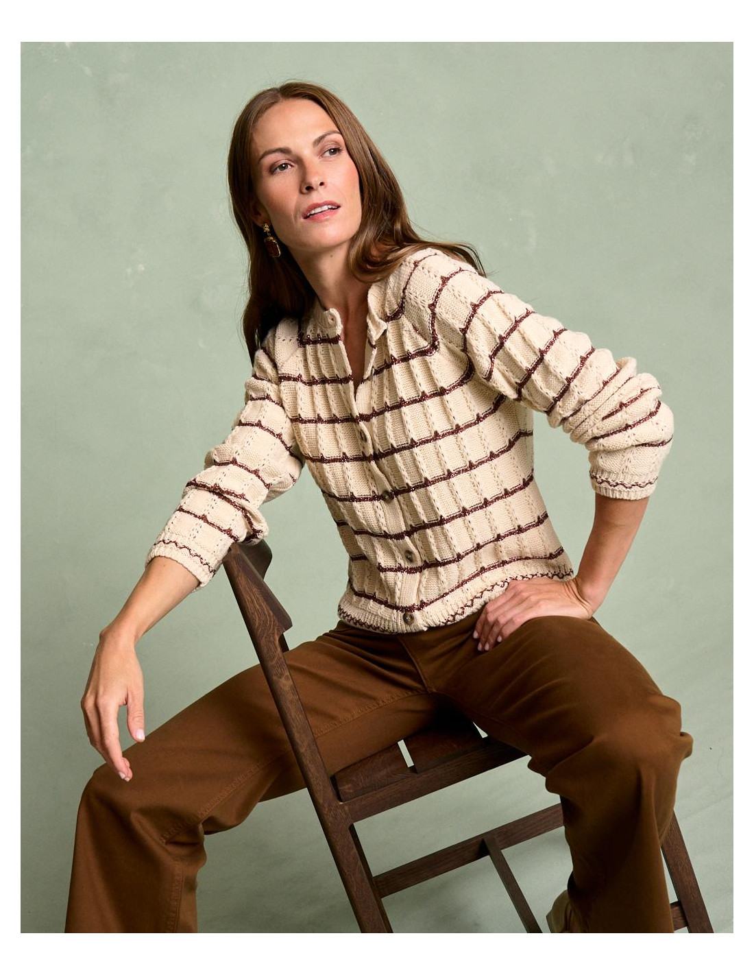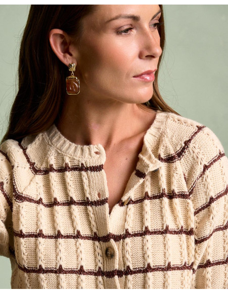 <p><span style="font-size: 10pt; font-family: Arial;">Cárdigan de punto en color crudo con un diseño de rayas, corte holgado y mangas largas ligeramente abullonadas que se ajustan en los puños.</span></p>