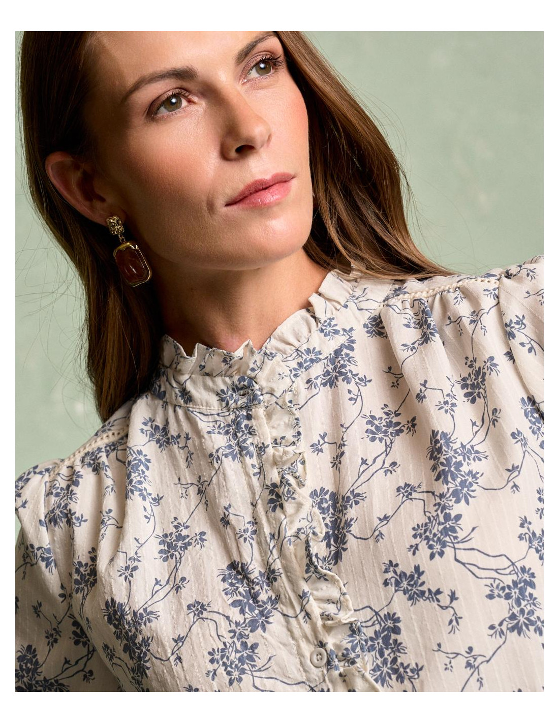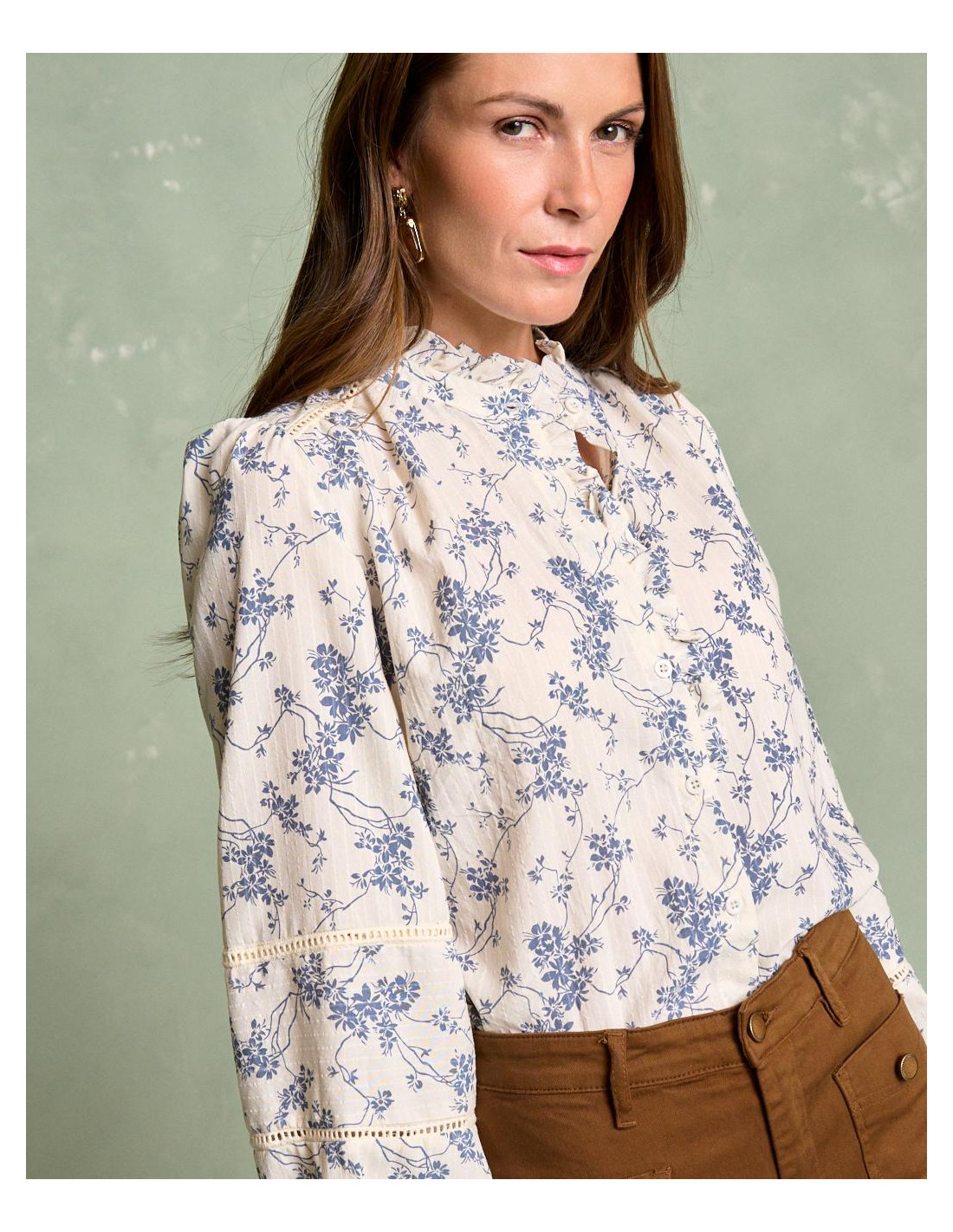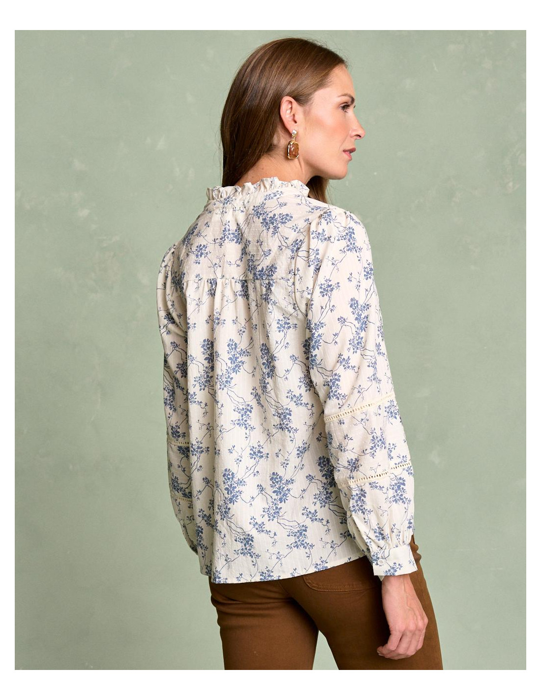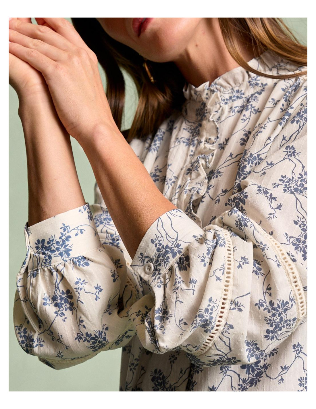 <p><span style="font-size: 10pt; font-family: Arial;">Blusa con un delicado estampado floral en tonos azules, diseñada con frunces sutiles en los hombros. Cuenta con cierre de botones y mangas largas abullonadas, que se ajustan en los puños.</span></p>