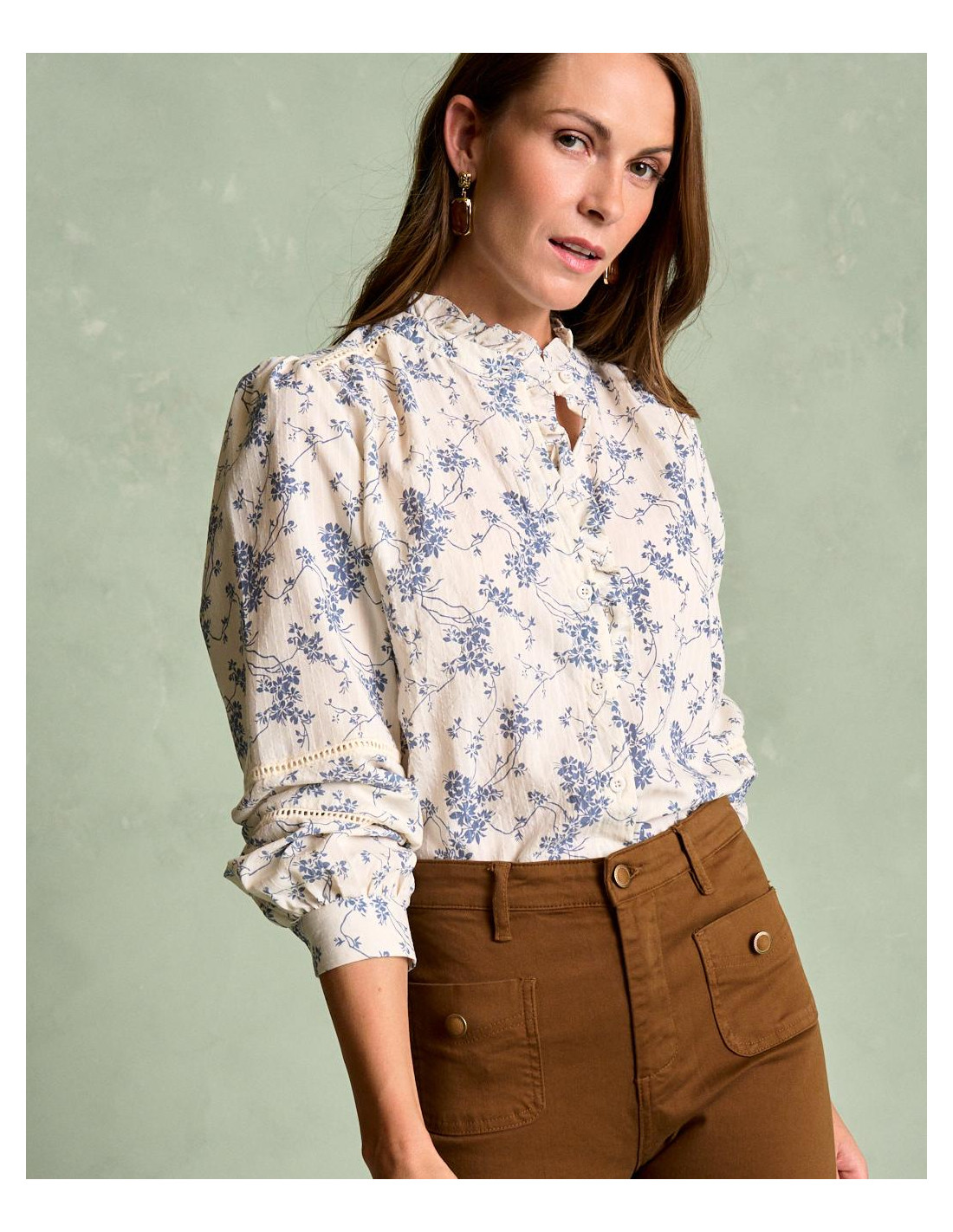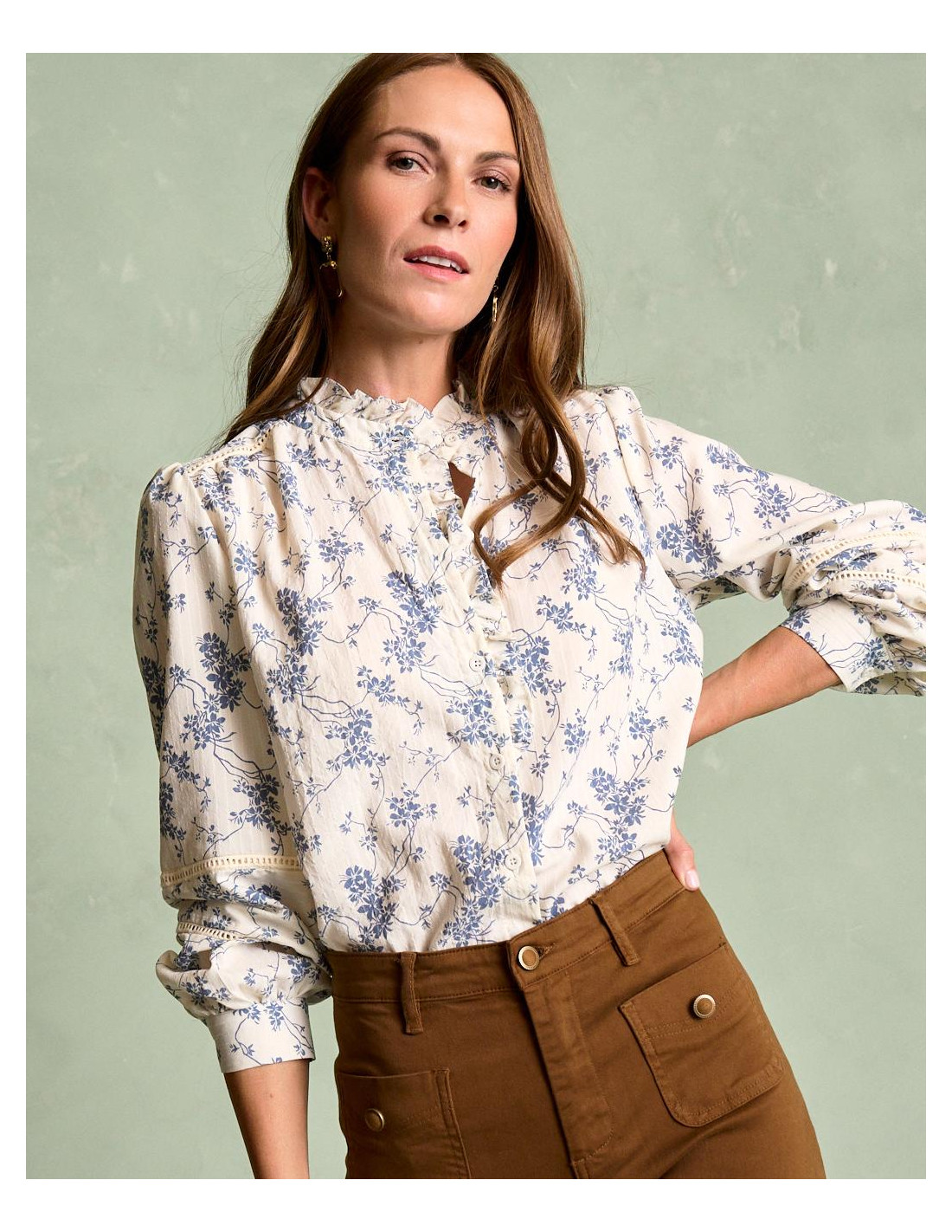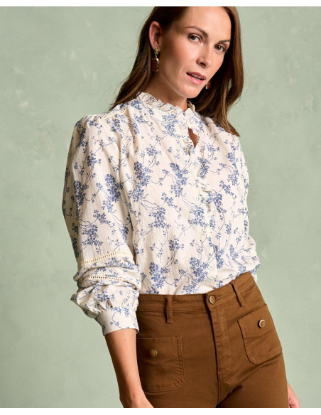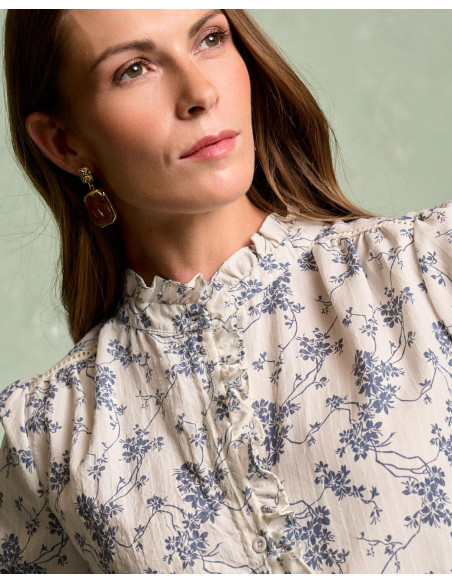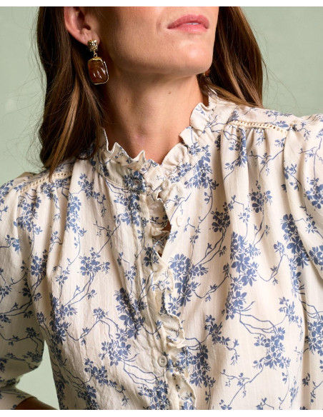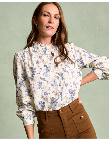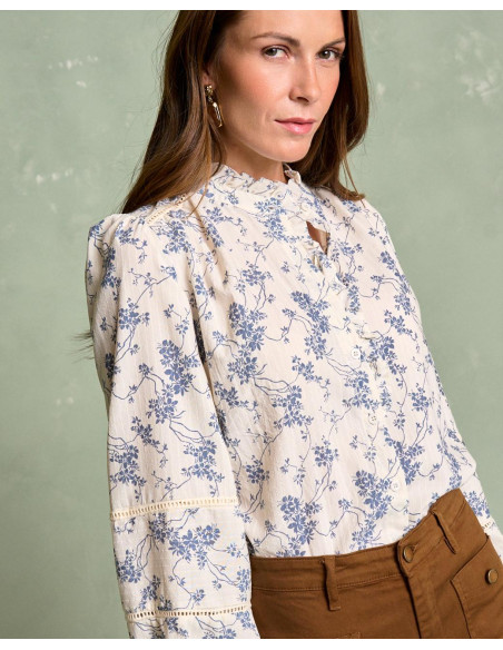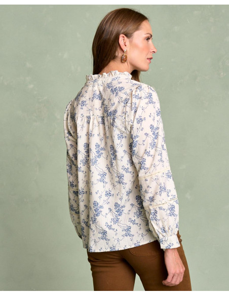 <p><span style="font-size: 10pt; font-family: Arial;">Blusa con un delicado estampado floral en tonos azules, diseñada con frunces sutiles en los hombros. Cuenta con cierre de botones y mangas largas abullonadas, que se ajustan en los puños.</span></p>