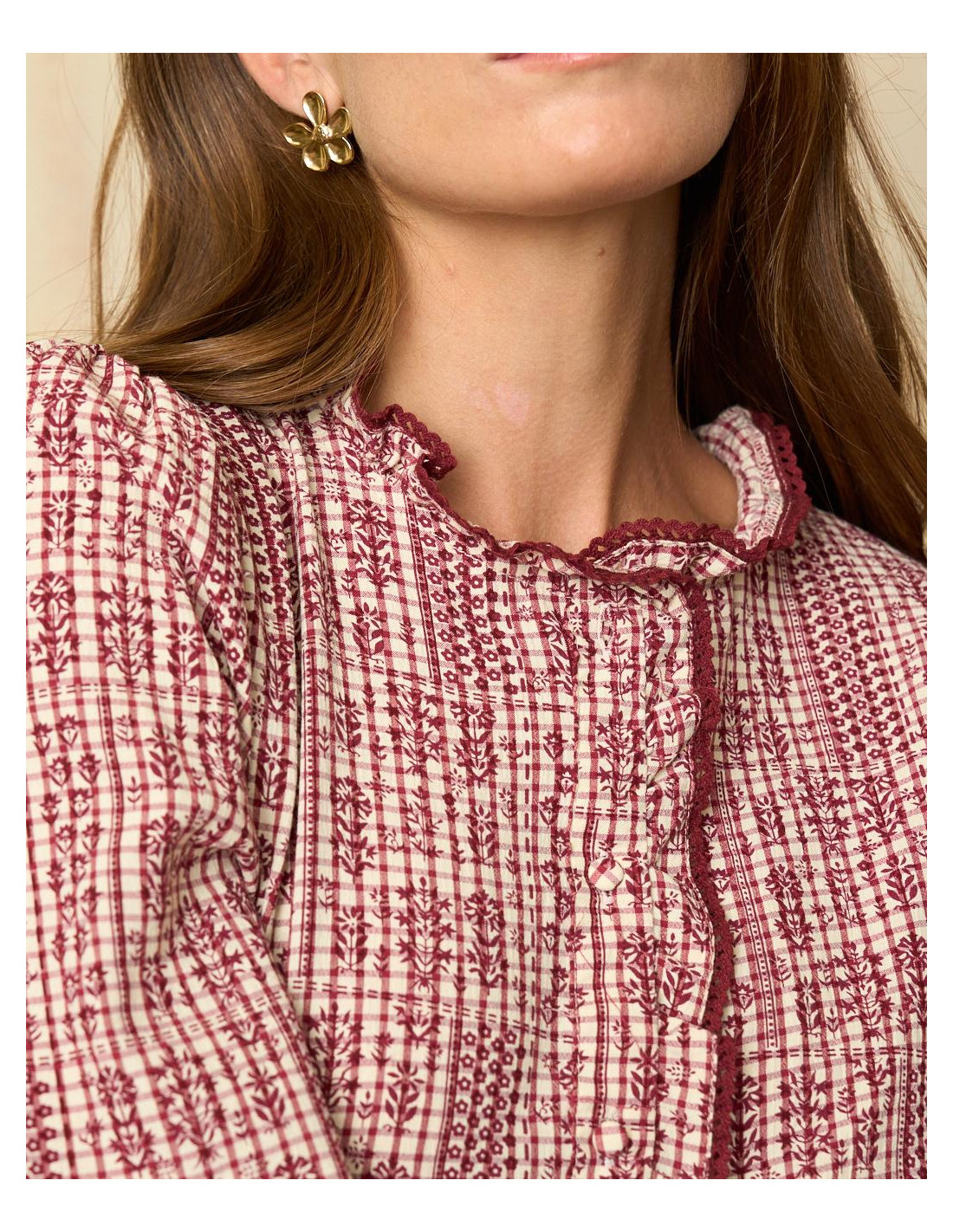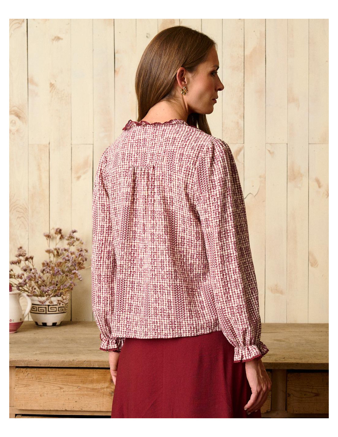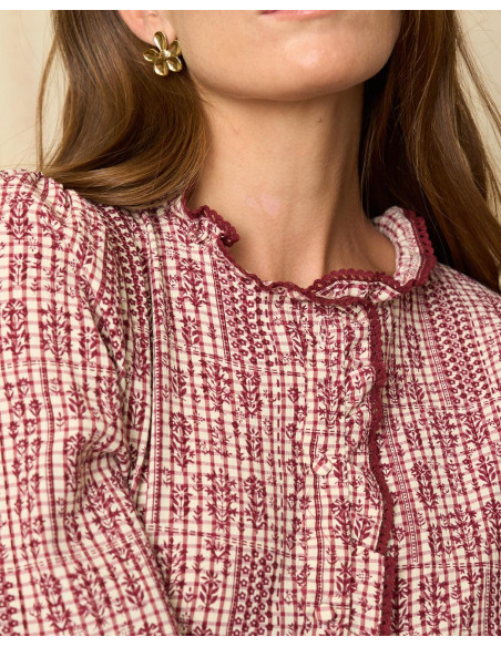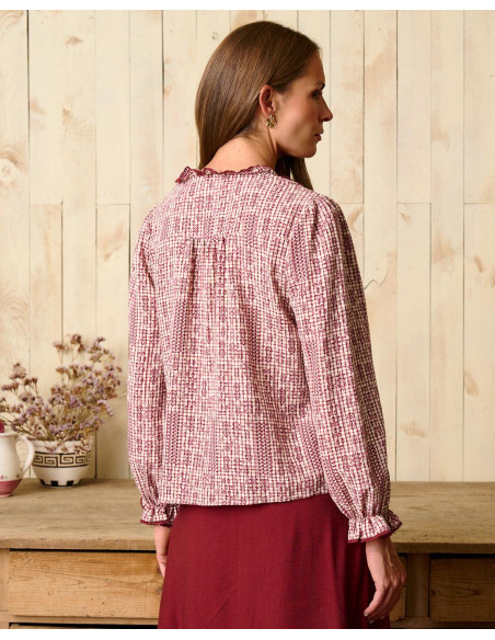 <p><span style="font-size: 10pt; font-family: Arial;">Blusa con estampado en tonos burdeos y crudo. Presenta un cuello subido con volantes, así como mangas amplias que se ajustan en el puño con elástico para mayor comodidad.</span></p>