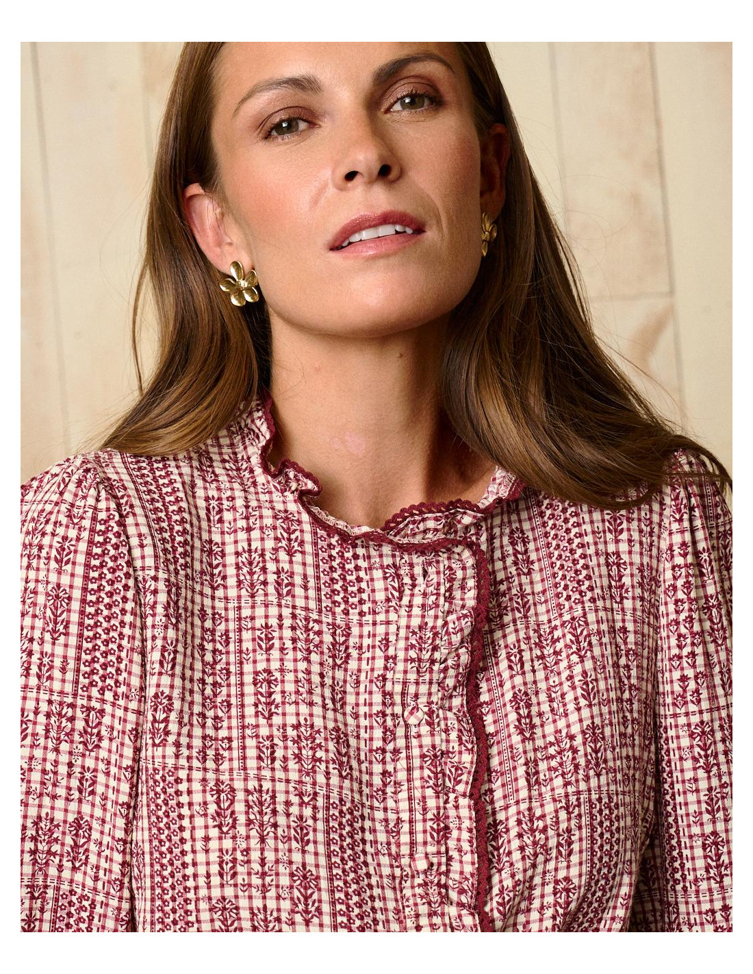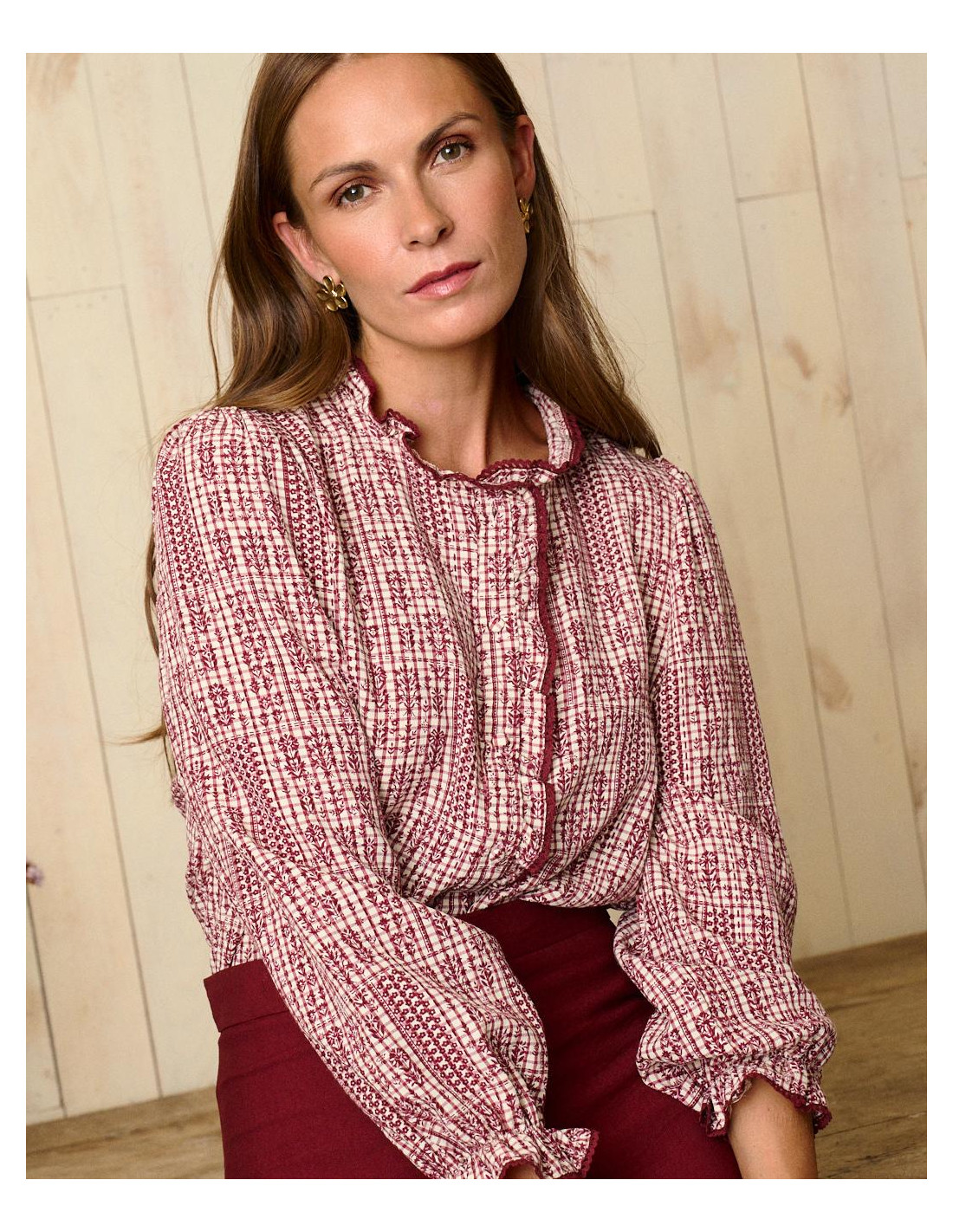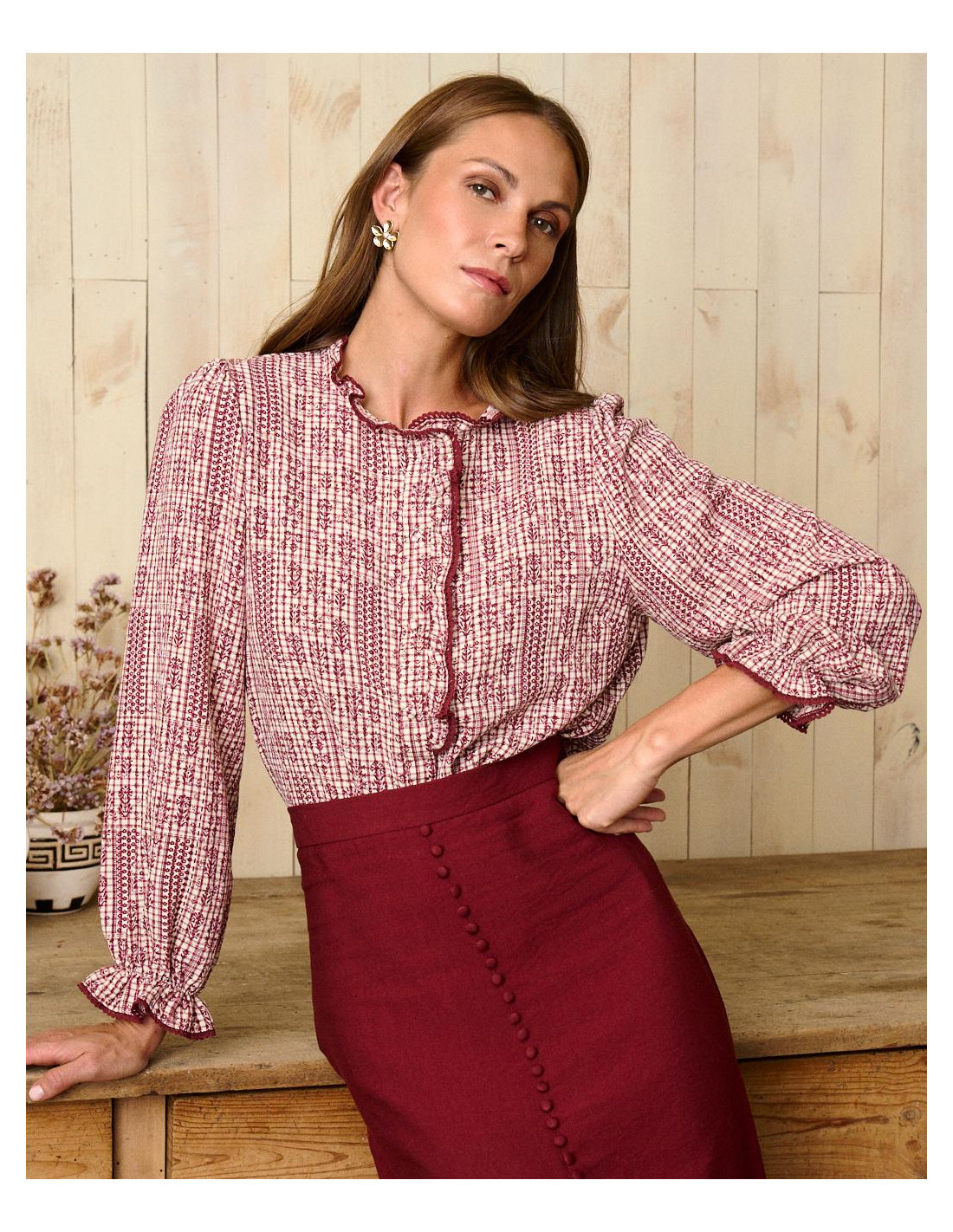 <p><span style="font-size: 10pt; font-family: Arial;">Blusa con estampado en tonos burdeos y crudo. Presenta un cuello subido con volantes, así como mangas amplias que se ajustan en el puño con elástico para mayor comodidad.</span></p>