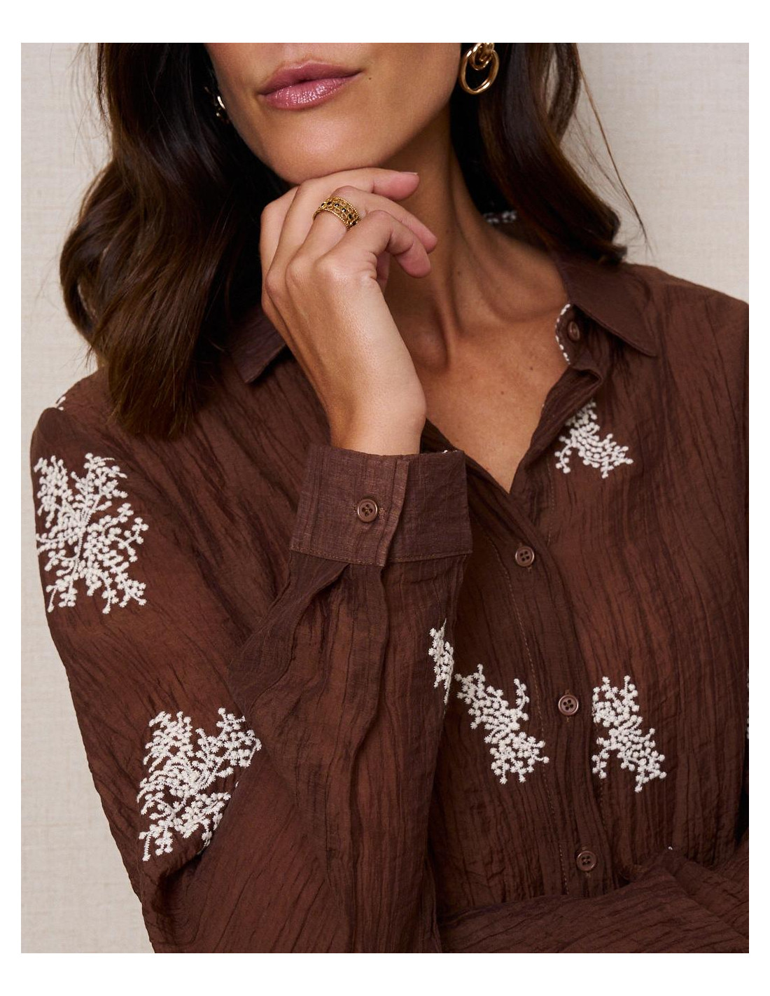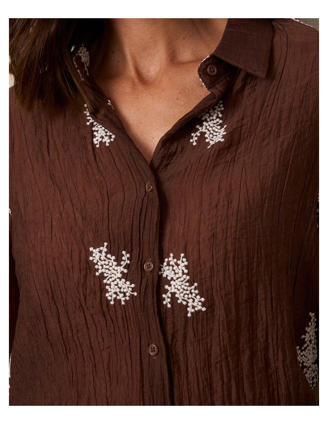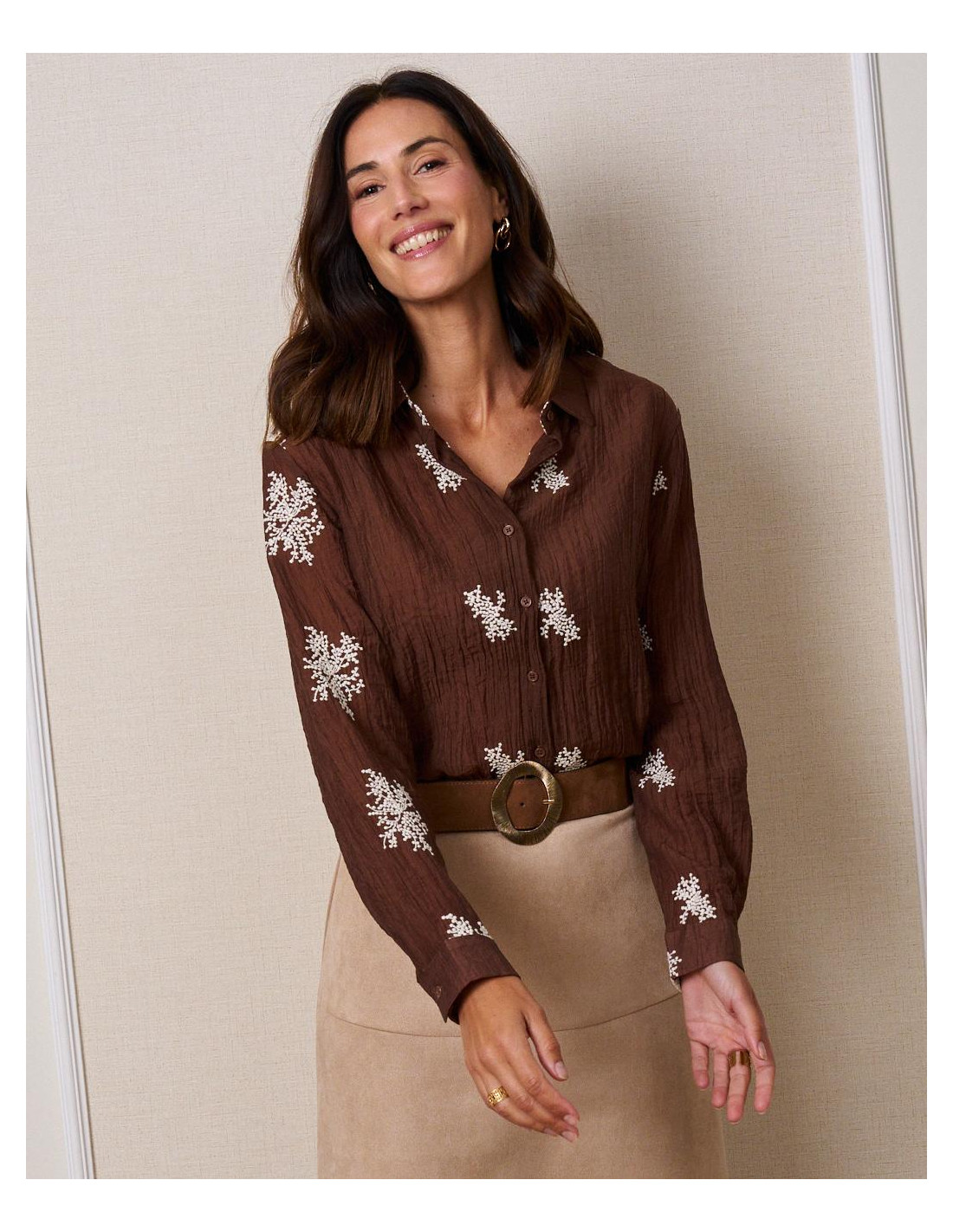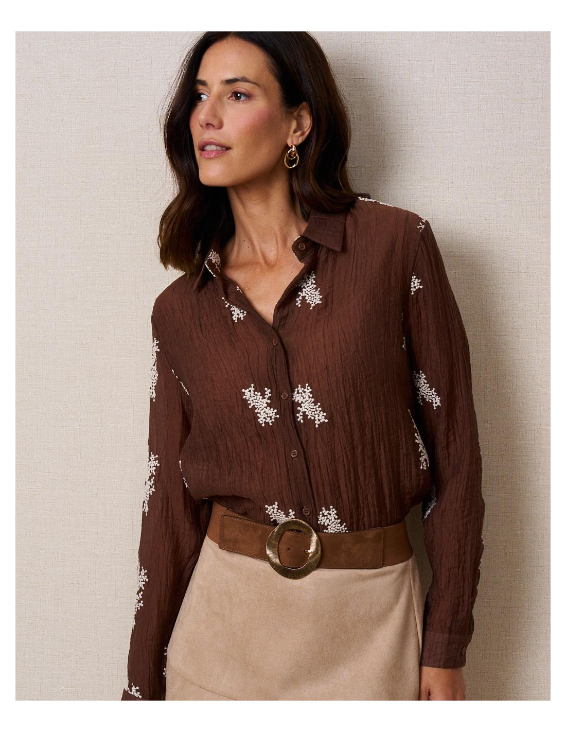 <p><span style="font-size: 10pt; font-family: Arial;">Camisa abotonada de manga larga, en color marrón chocolate estampada con bordados florales en blanco. Diseño con puños también abotonados, que aporta un aire romántico y femenino.</span></p> <p><span style="font-size: 10pt; font-family: Arial;">Perfecta para combinar con faldas o pantalones.</span></p>