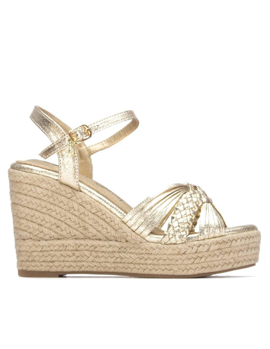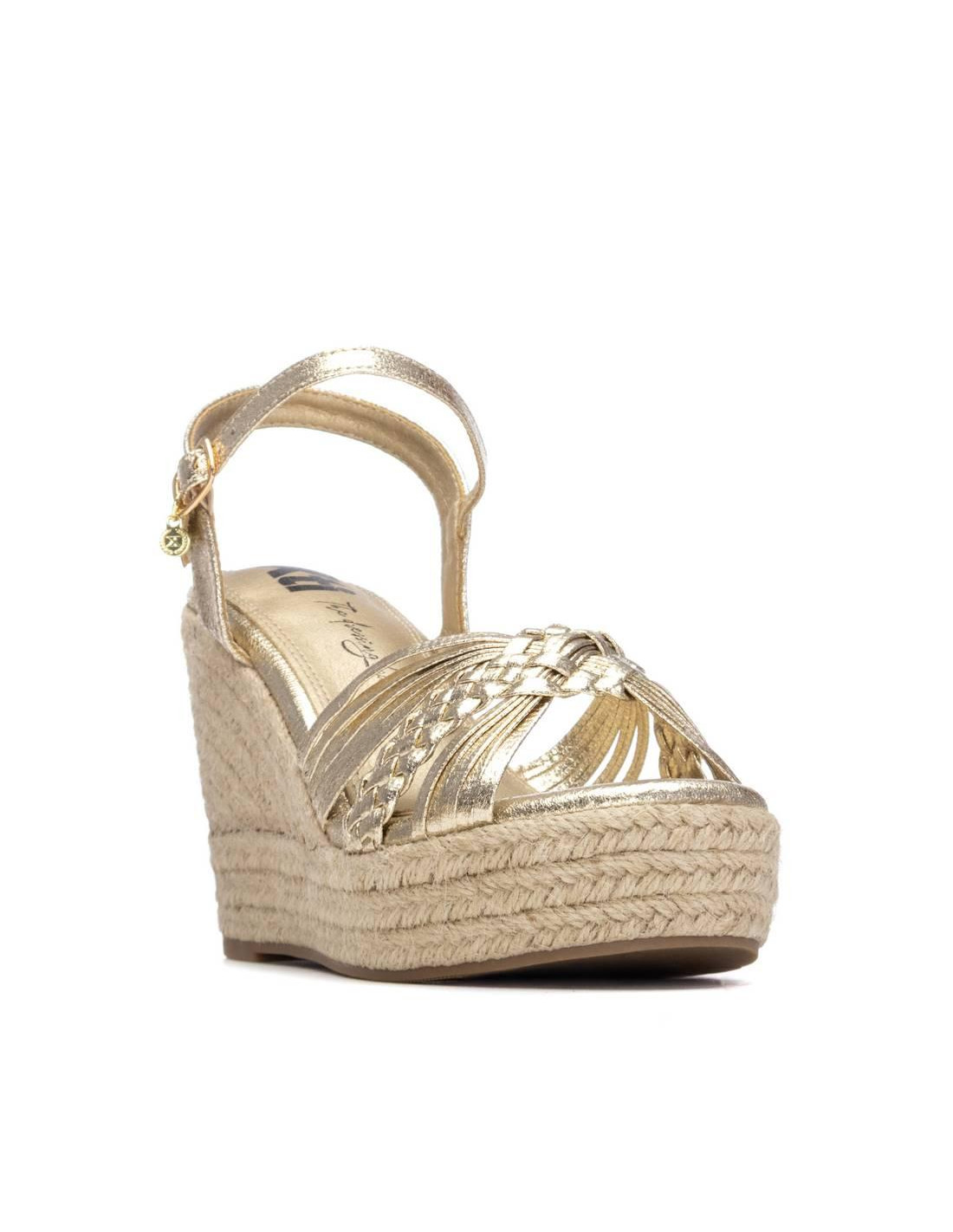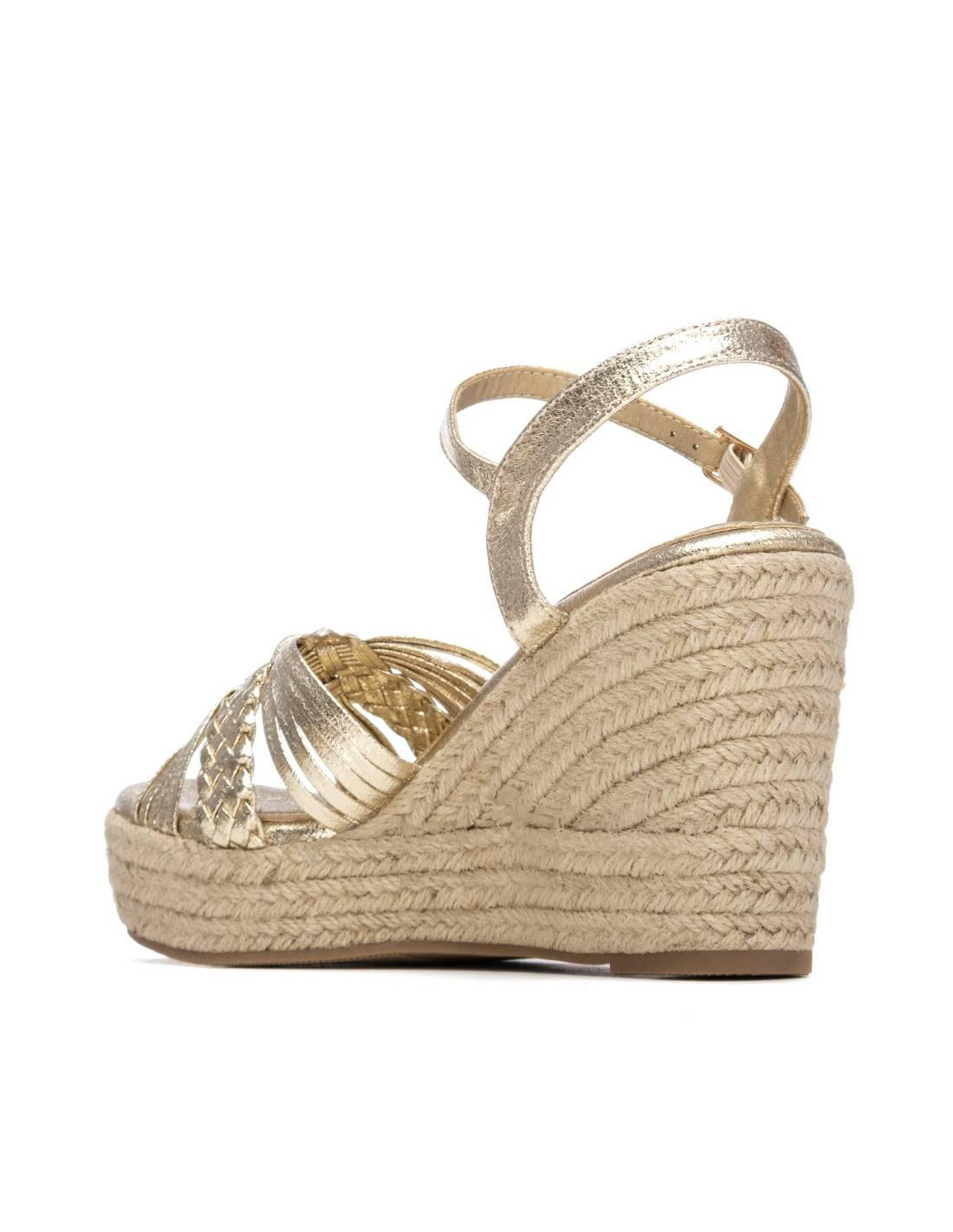 Alpargata de cuña alta con agarre de plsera y tiras en color oro. MODELO 145420 COLOR ORO