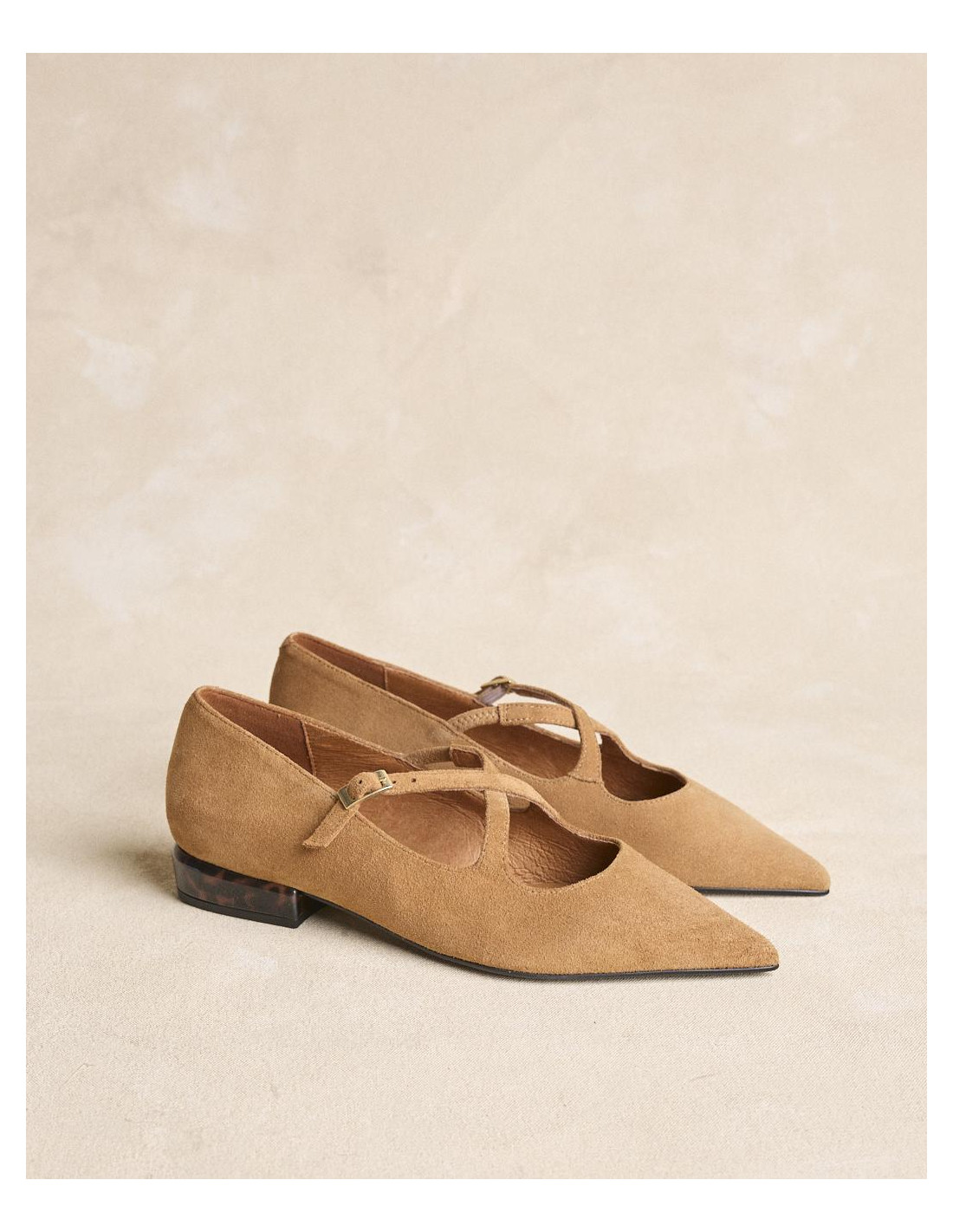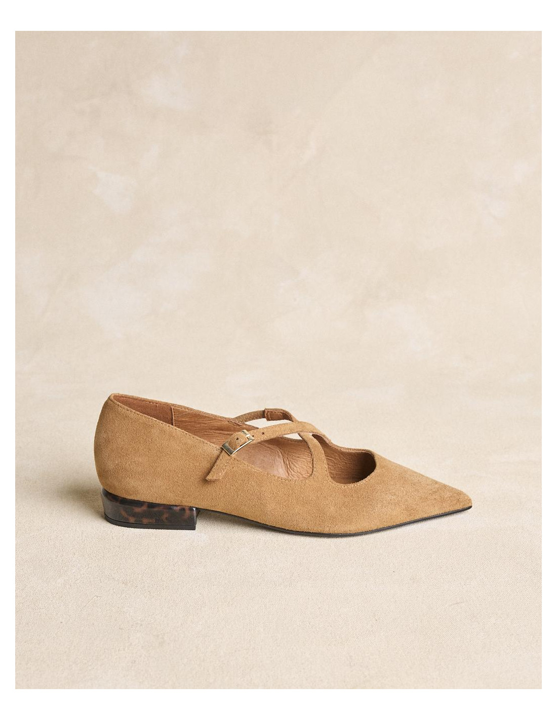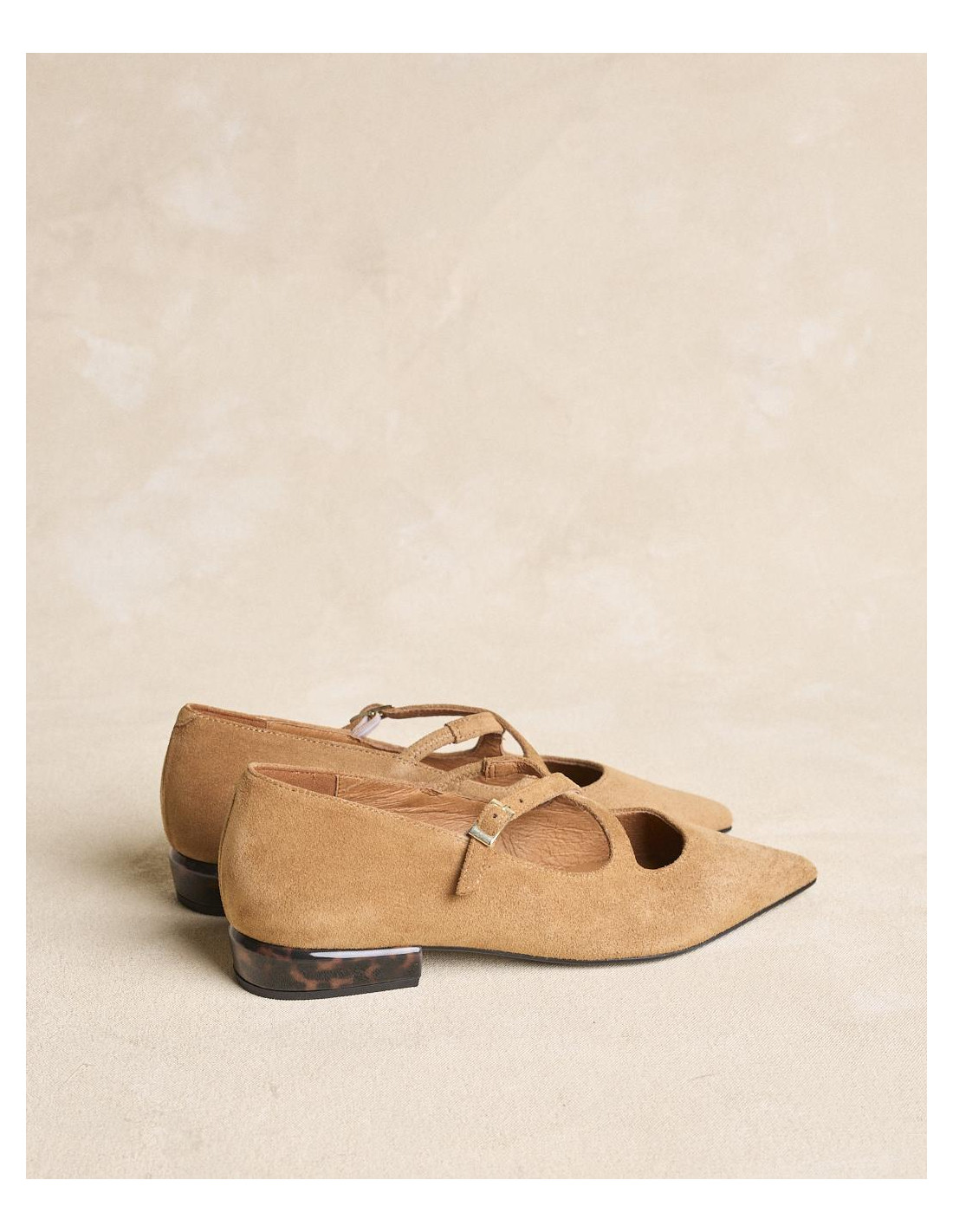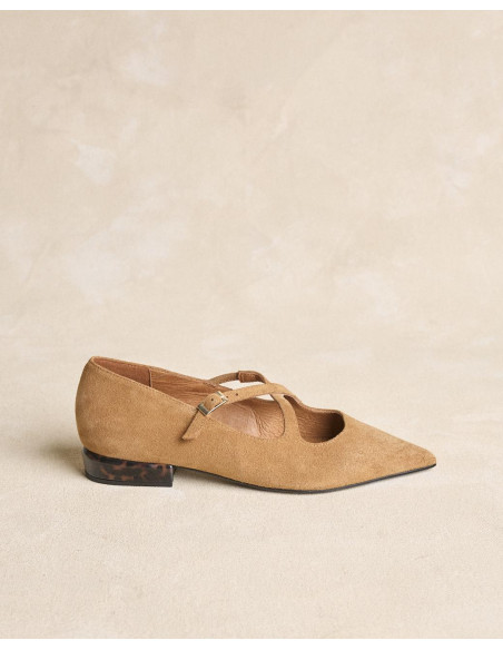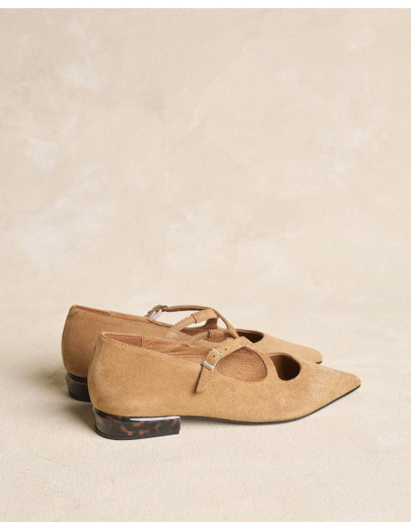 <p><span style="font-size: 10pt; font-family: Arial;">Bailarinas de ante en color beige con puntera fina. Diseño con tiras cruzadas en el empeine que aportan sujeción, tacón bajo cuadrado para mayor comodidad en el día a día.</span></p>