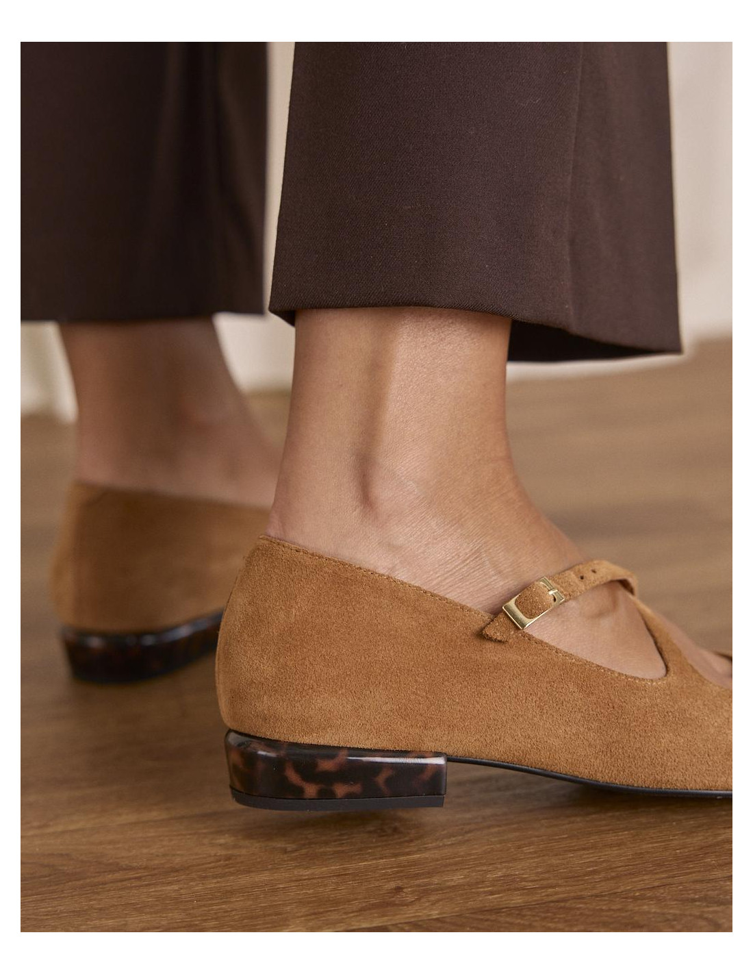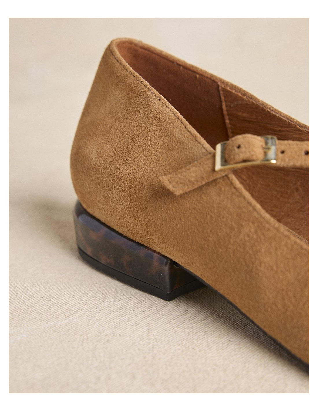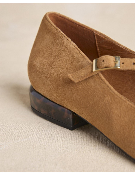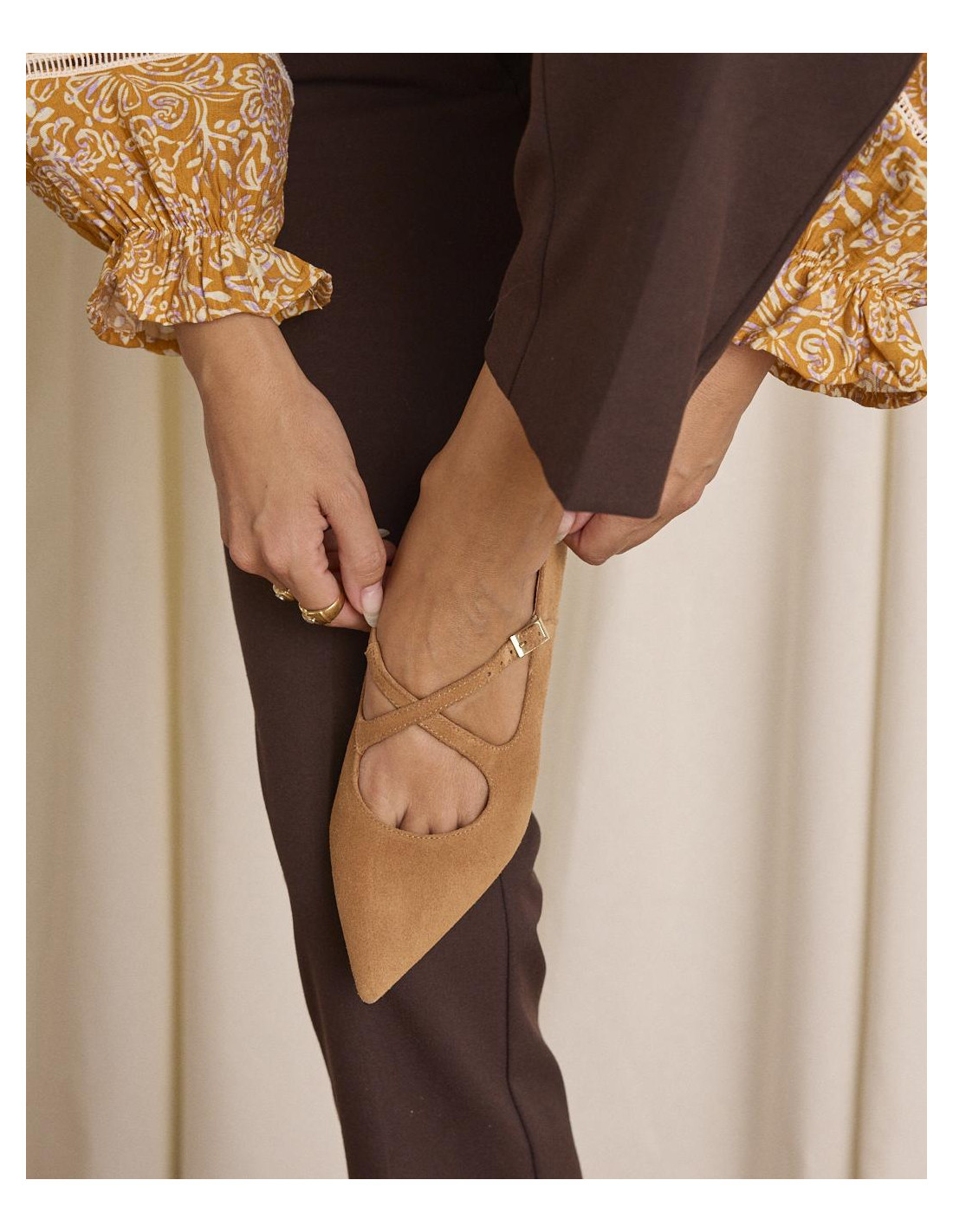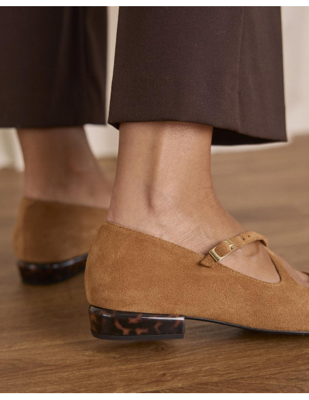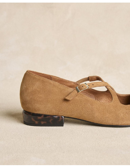 <p><span style="font-size: 10pt; font-family: Arial;">Bailarinas de ante en color beige con puntera fina. Diseño con tiras cruzadas en el empeine que aportan sujeción, tacón bajo cuadrado para mayor comodidad en el día a día.</span></p>