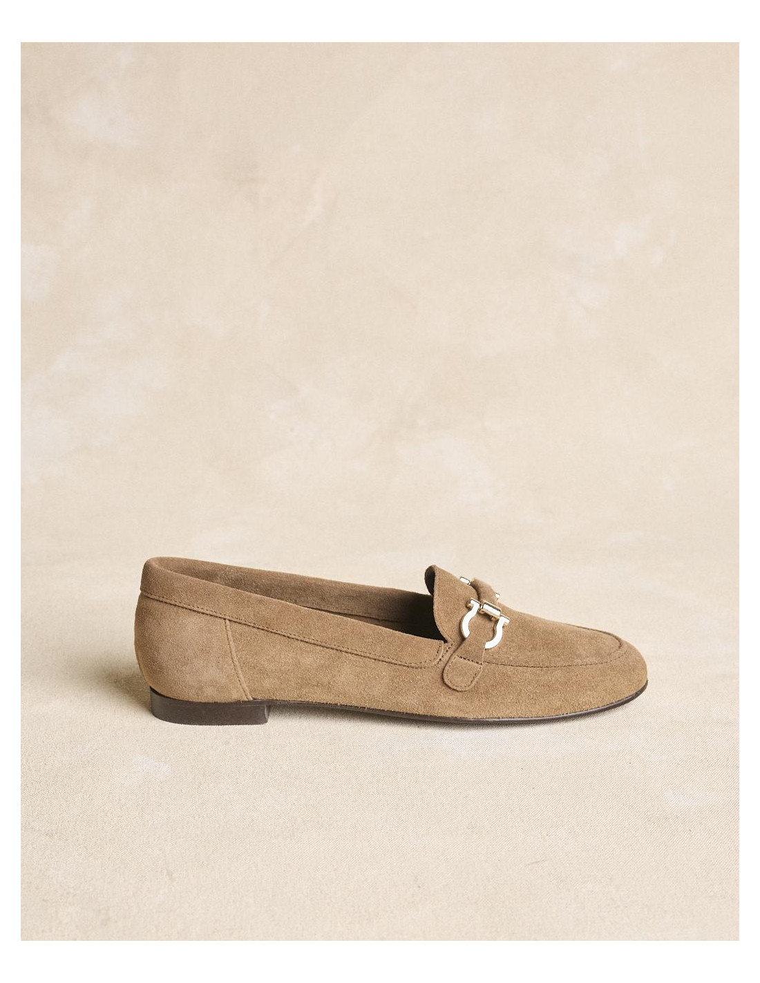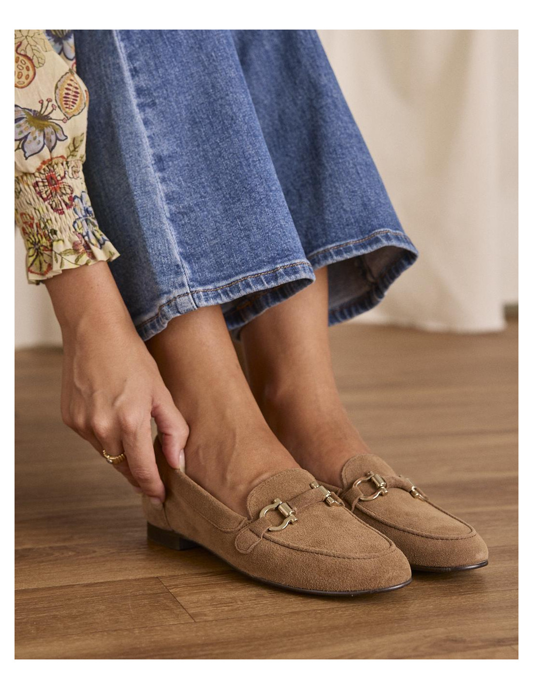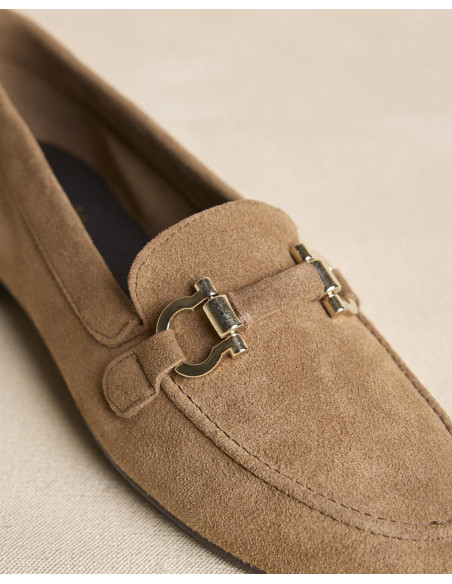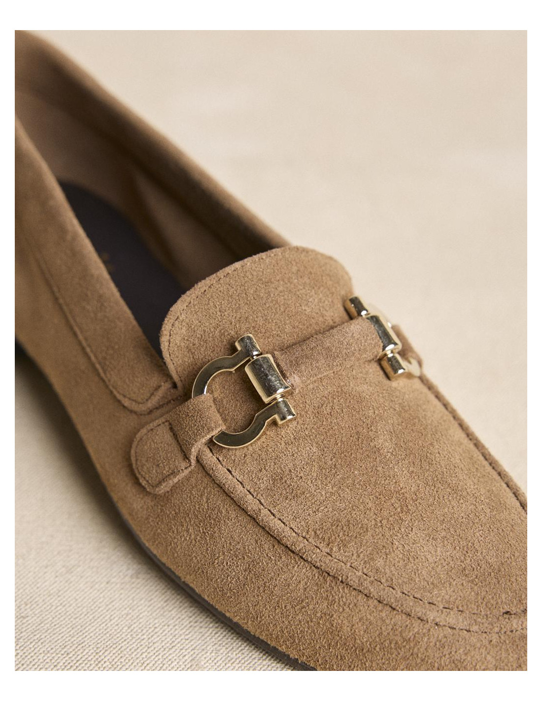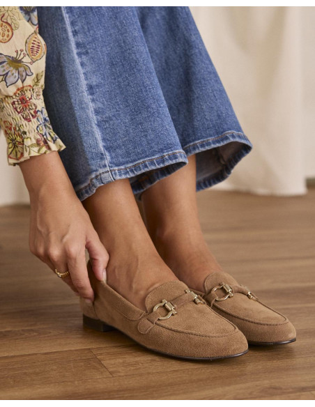 <p><span style="font-size: 10pt; font-family: Arial;">Mocasín de ante en color camel con detalle de estribo metálico en el empeine. Diseño clásico con puntera redondeada y suela plana.</span></p>