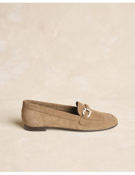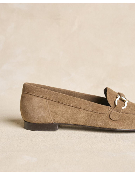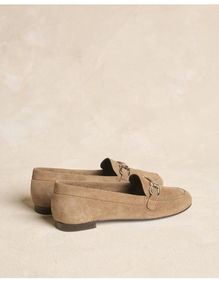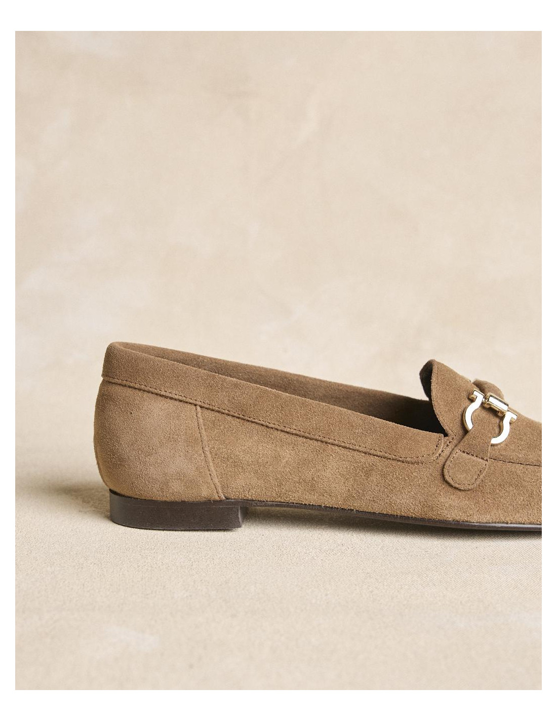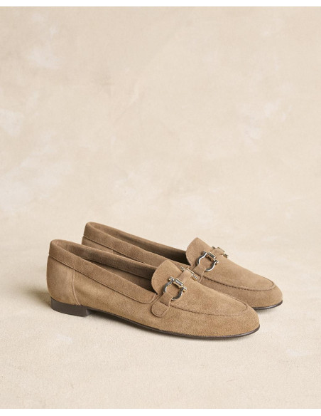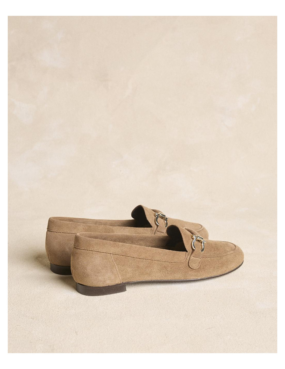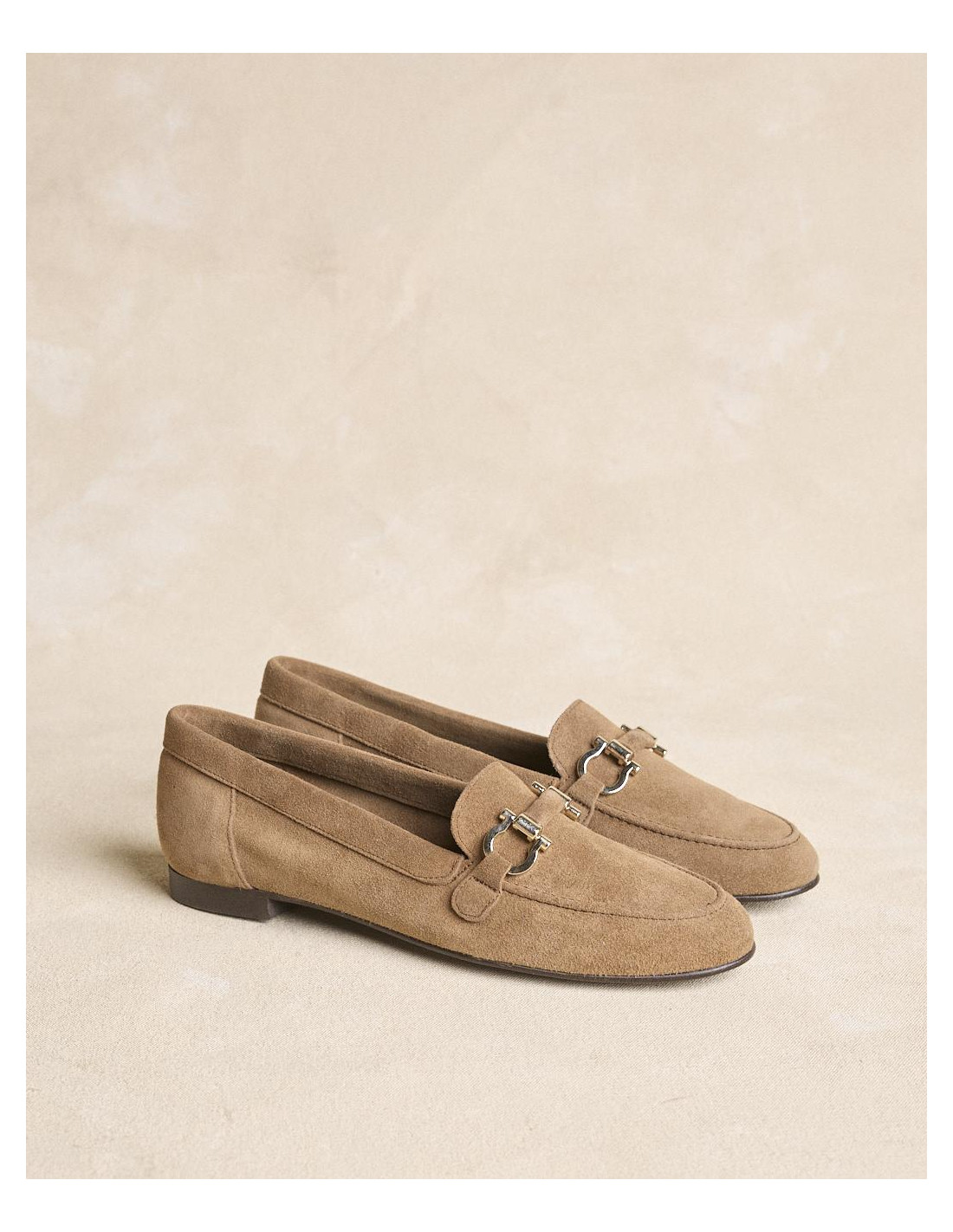 <p><span style="font-size: 10pt; font-family: Arial;">Mocasín de ante en color camel con detalle de estribo metálico en el empeine. Diseño clásico con puntera redondeada y suela plana.</span></p>