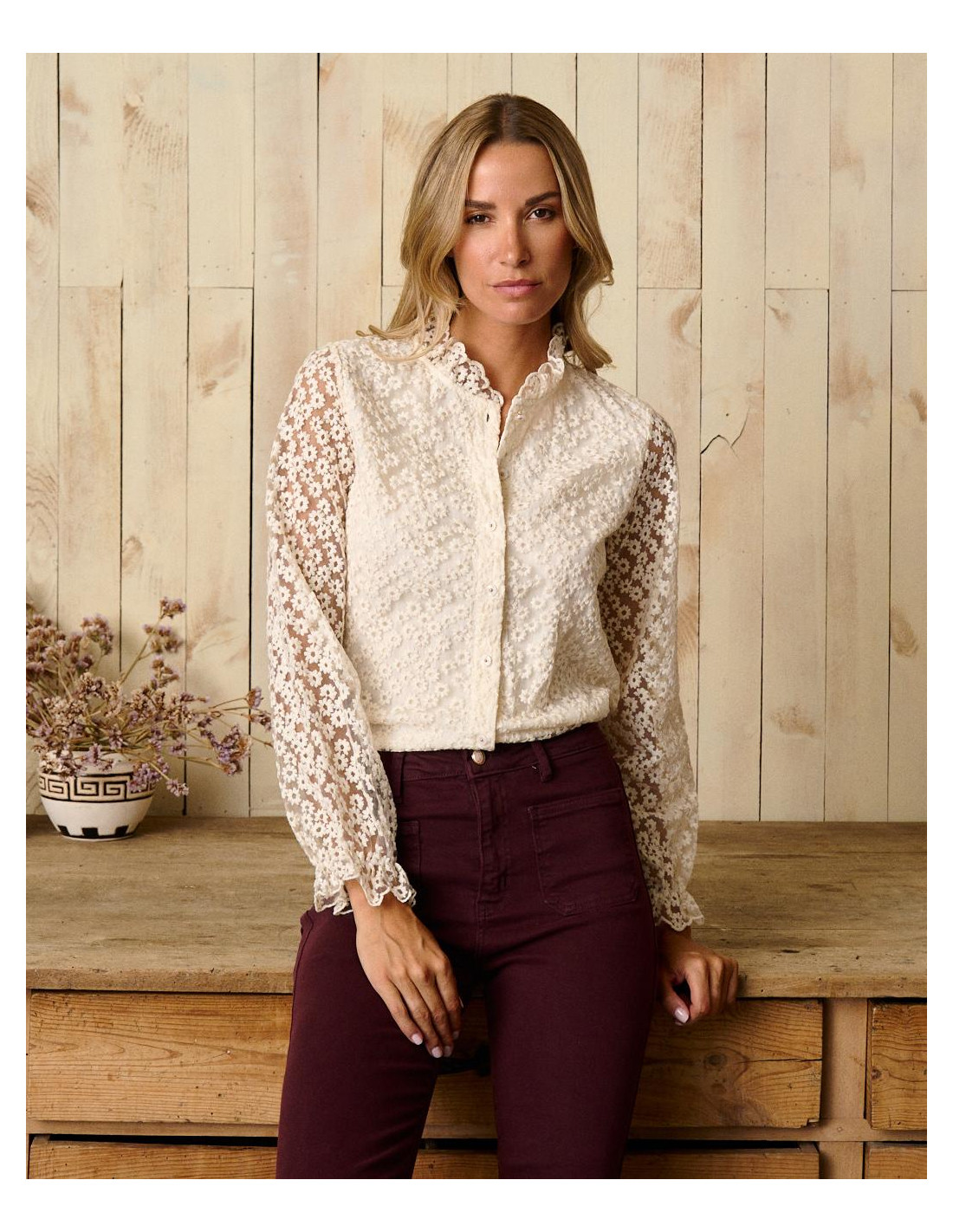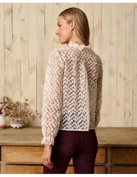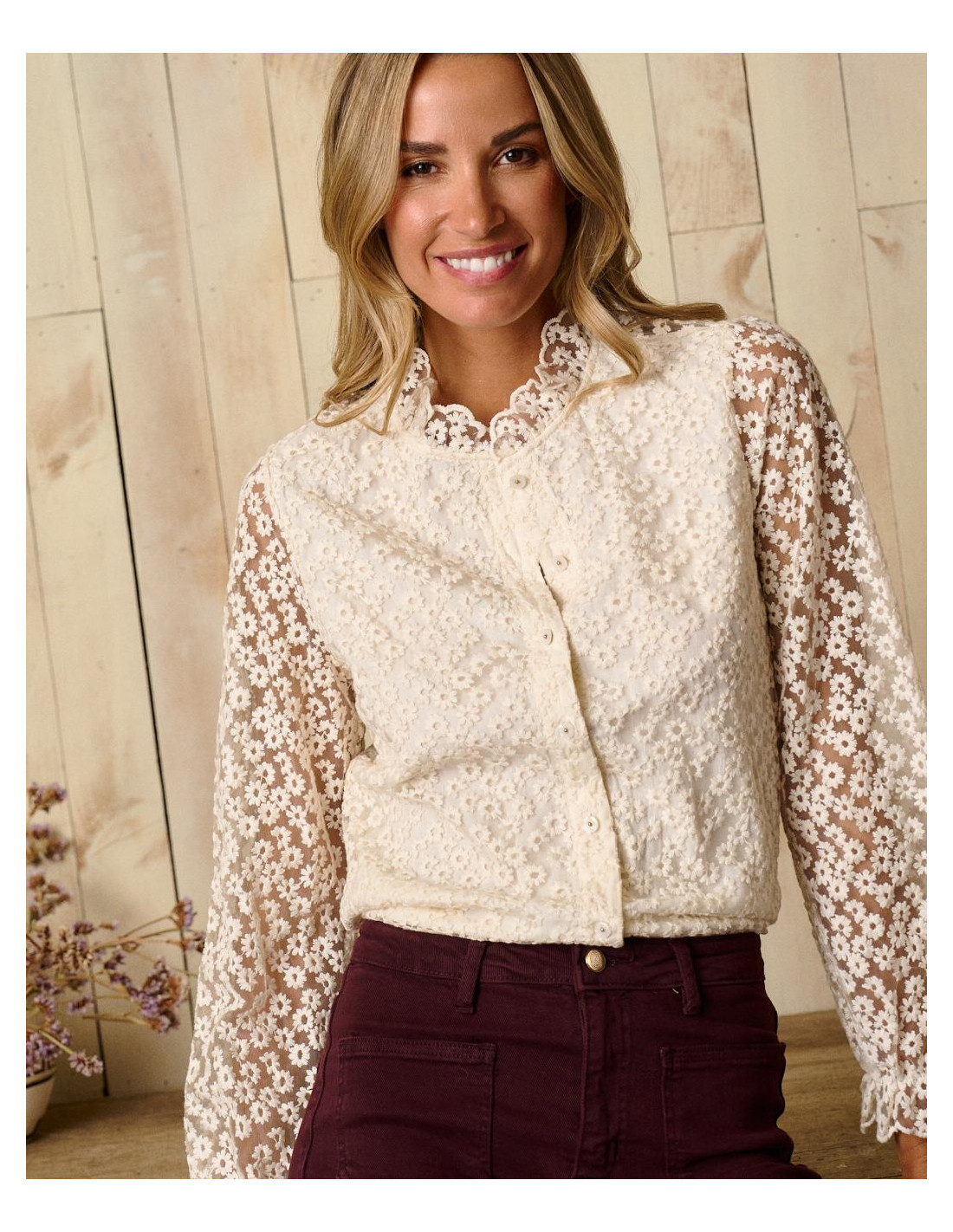 <p><span style="font-size: 10pt; font-family: Arial;">Blusa de gasa semitransparente en color crudo con un delicado estampado floral. Su diseño cuenta con un cuello alto de volantes, cierre de botones y mangas largas con puños fruncidos, ofreciendo un ajuste cómodo y versátil para cualquier ocasión.</span></p>