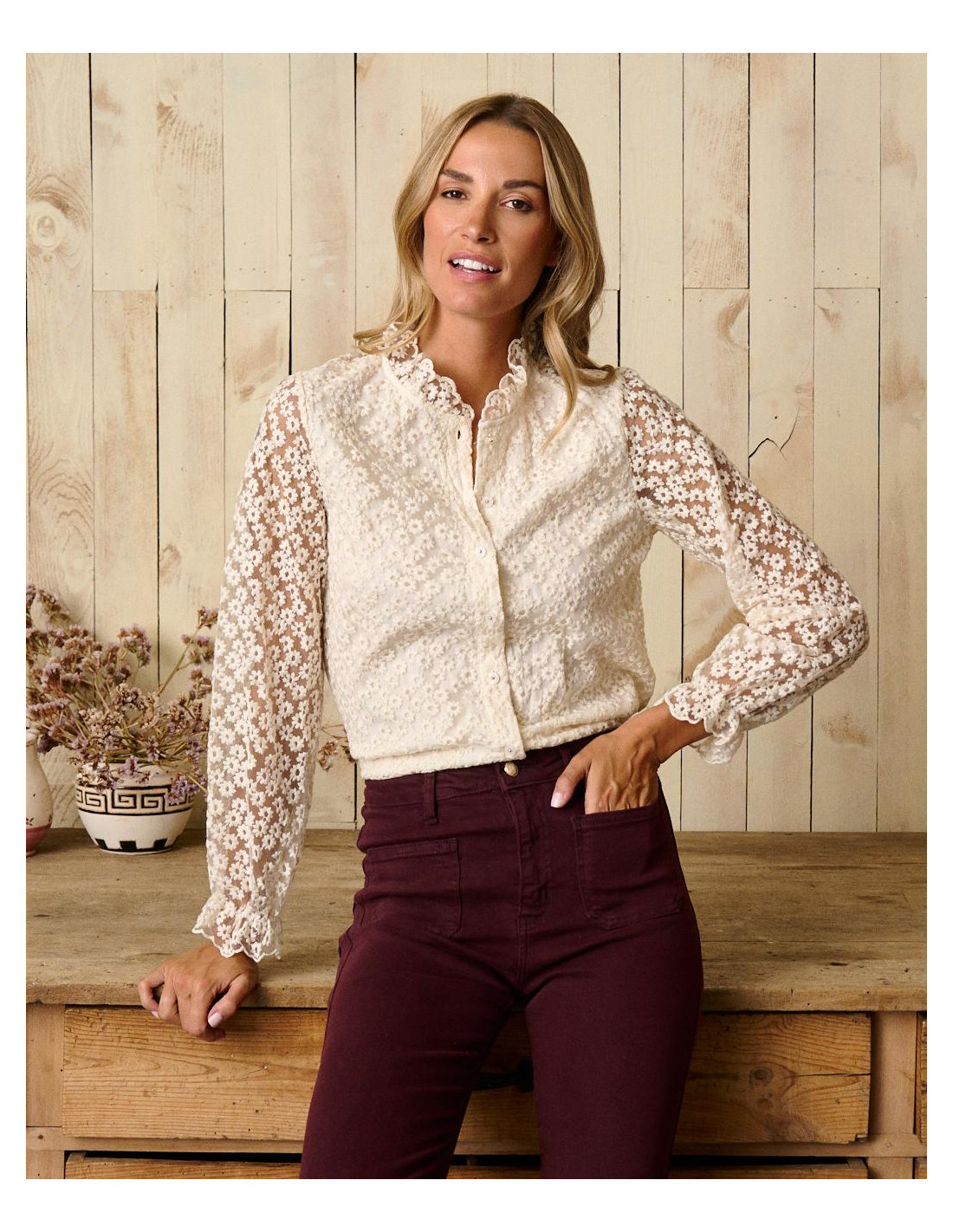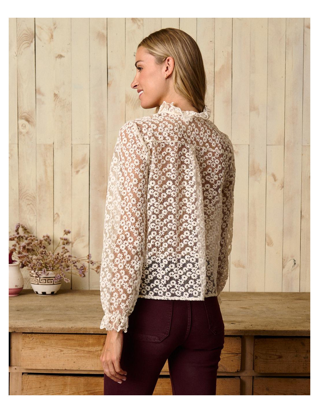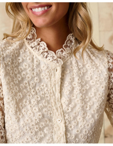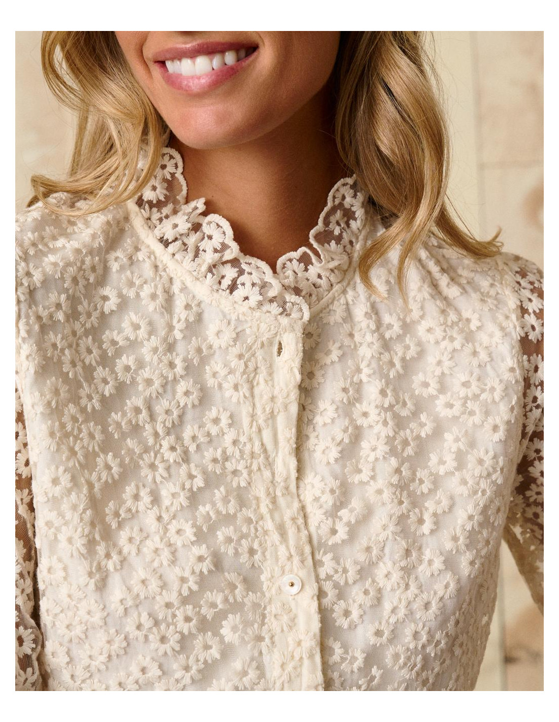 <p><span style="font-size: 10pt; font-family: Arial;">Blusa de gasa semitransparente en color crudo con un delicado estampado floral. Su diseño cuenta con un cuello alto de volantes, cierre de botones y mangas largas con puños fruncidos, ofreciendo un ajuste cómodo y versátil para cualquier ocasión.</span></p>