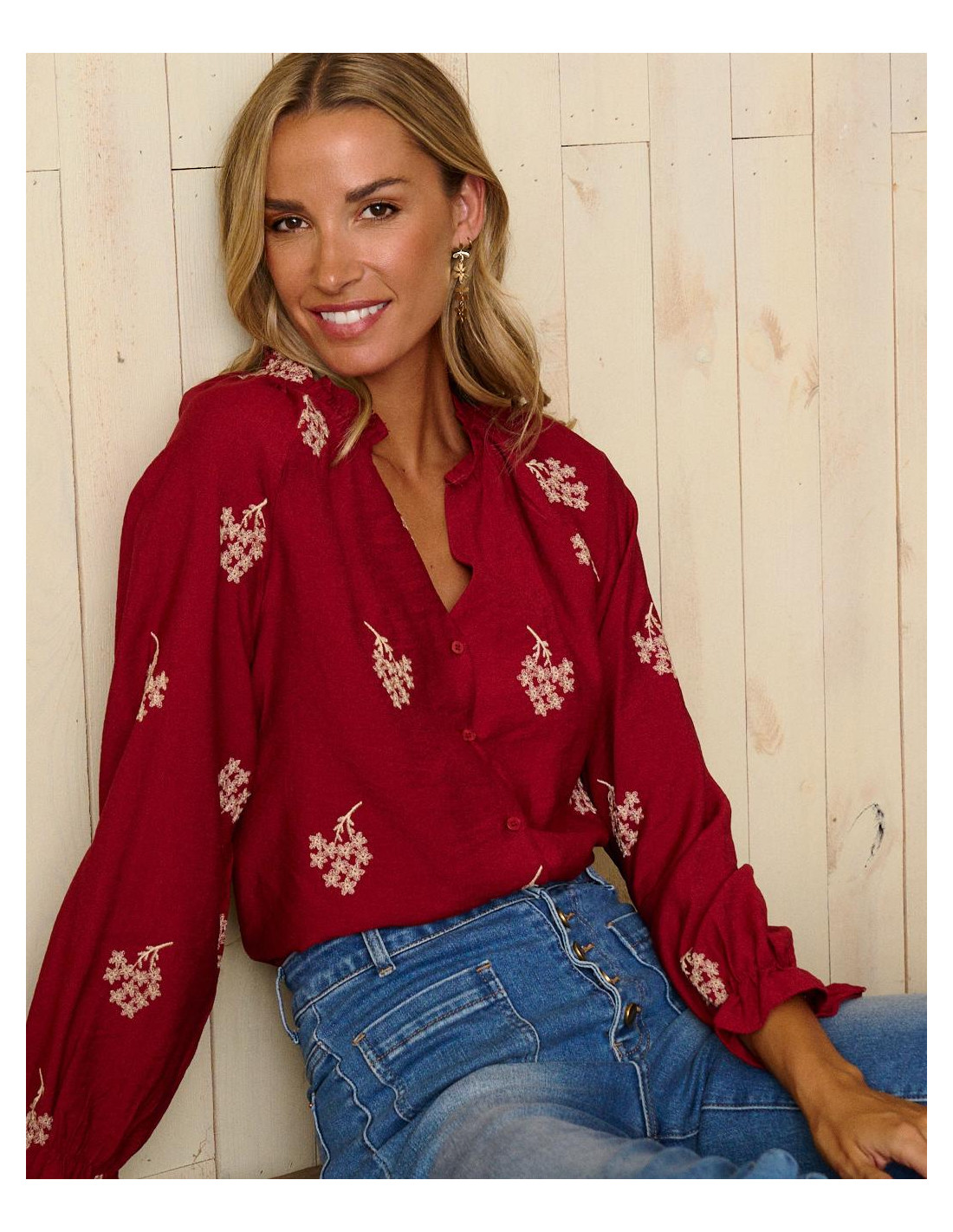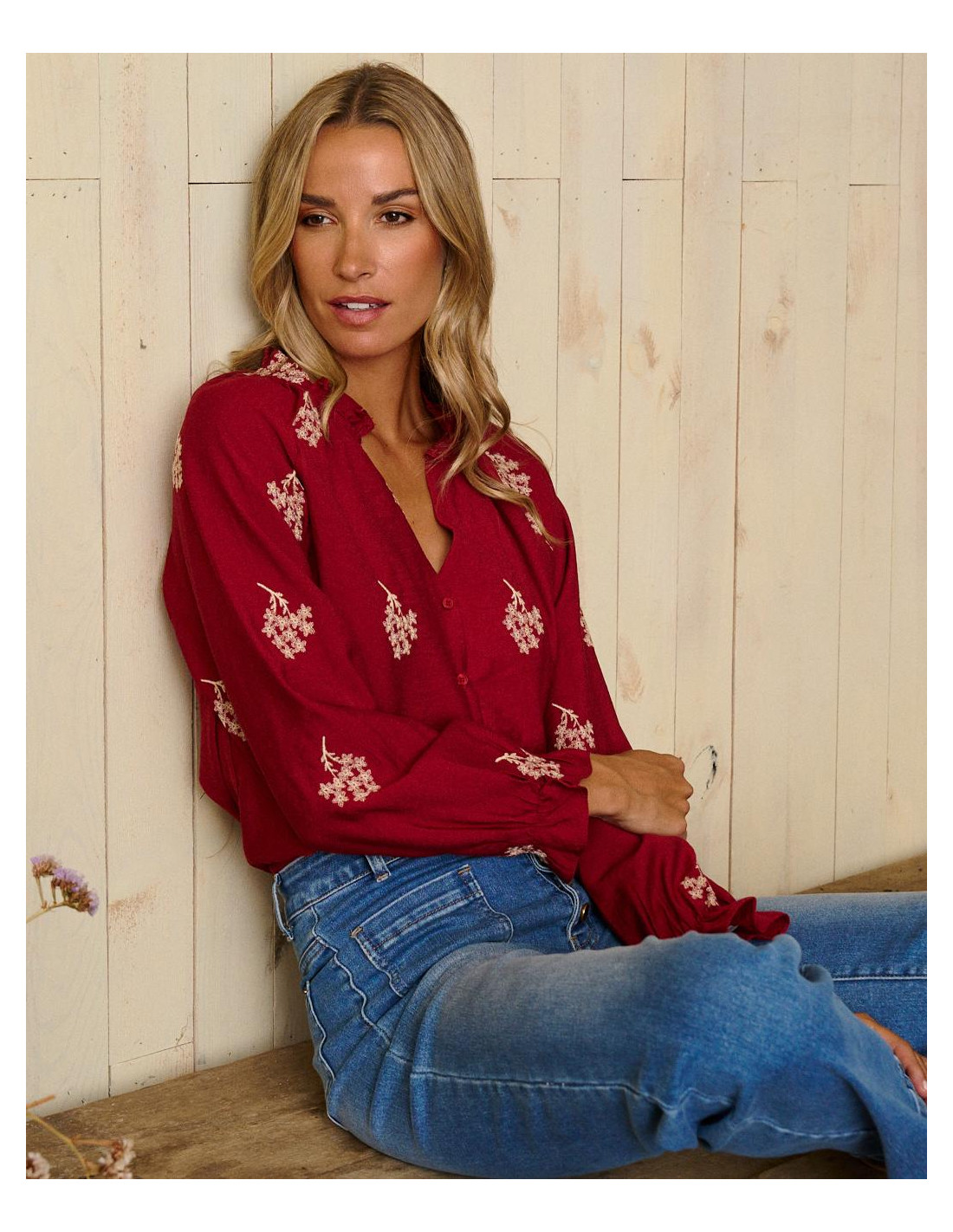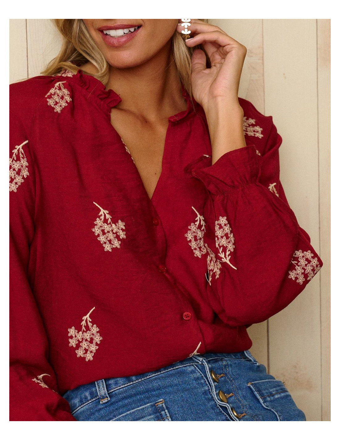 <p><span style="font-size: 10pt; font-family: Arial;">Camisa en color cereza, adornada con un delicado bordado floral en tonos claros. Cuenta con escote en pico, cierre de botones y mangas amplias que se ajustan en el puño con elástico, creando un ligero efecto abullonado.</span></p>
