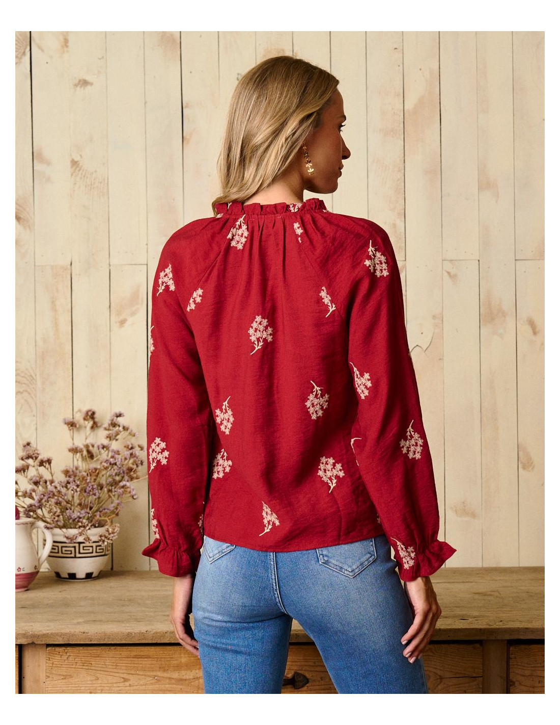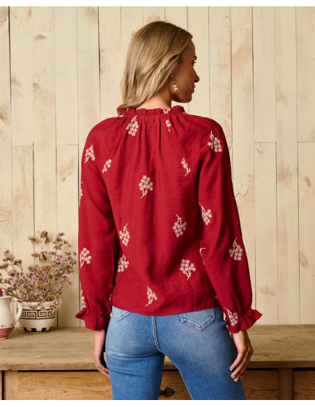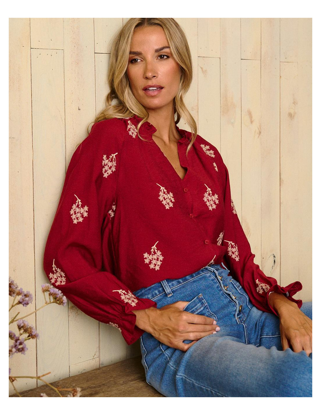 <p><span style="font-size: 10pt; font-family: Arial;">Camisa en color cereza, adornada con un delicado bordado floral en tonos claros. Cuenta con escote en pico, cierre de botones y mangas amplias que se ajustan en el puño con elástico, creando un ligero efecto abullonado.</span></p>