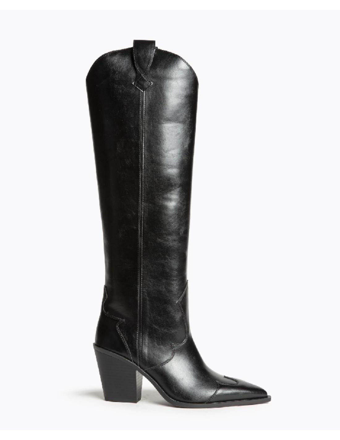 Bota de caña alta al estilo tejano terminado en punta. Tacón tamaño medio y color negro en napa sintética.