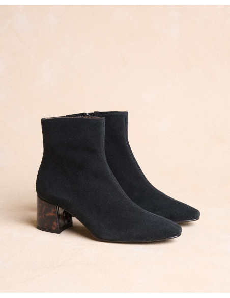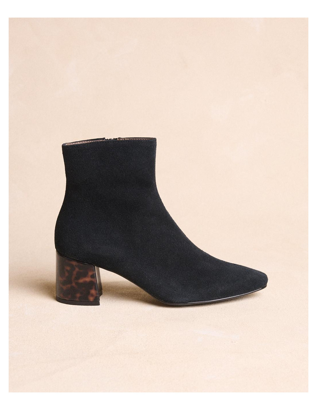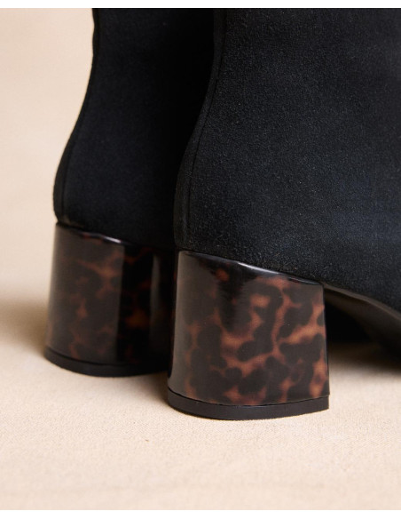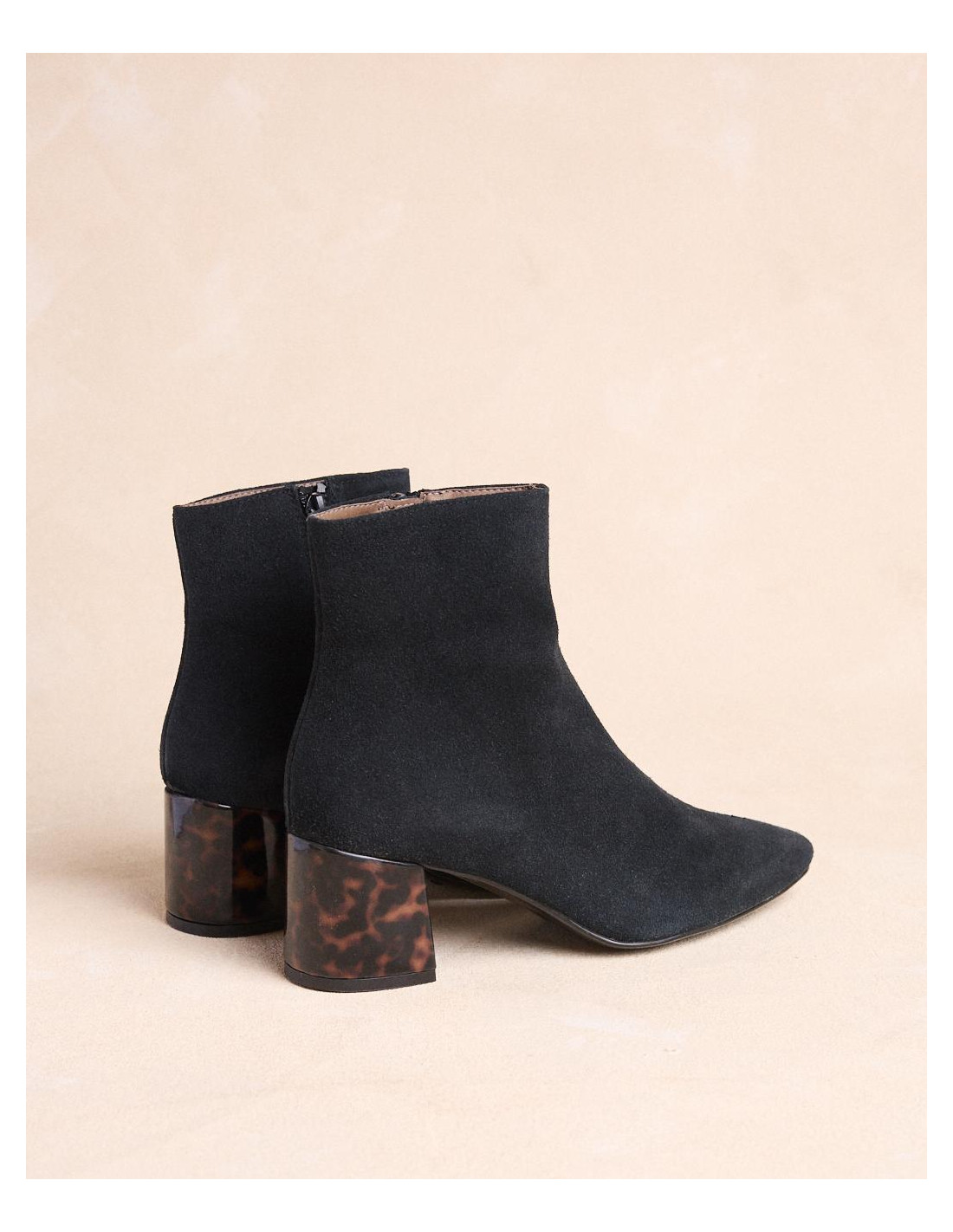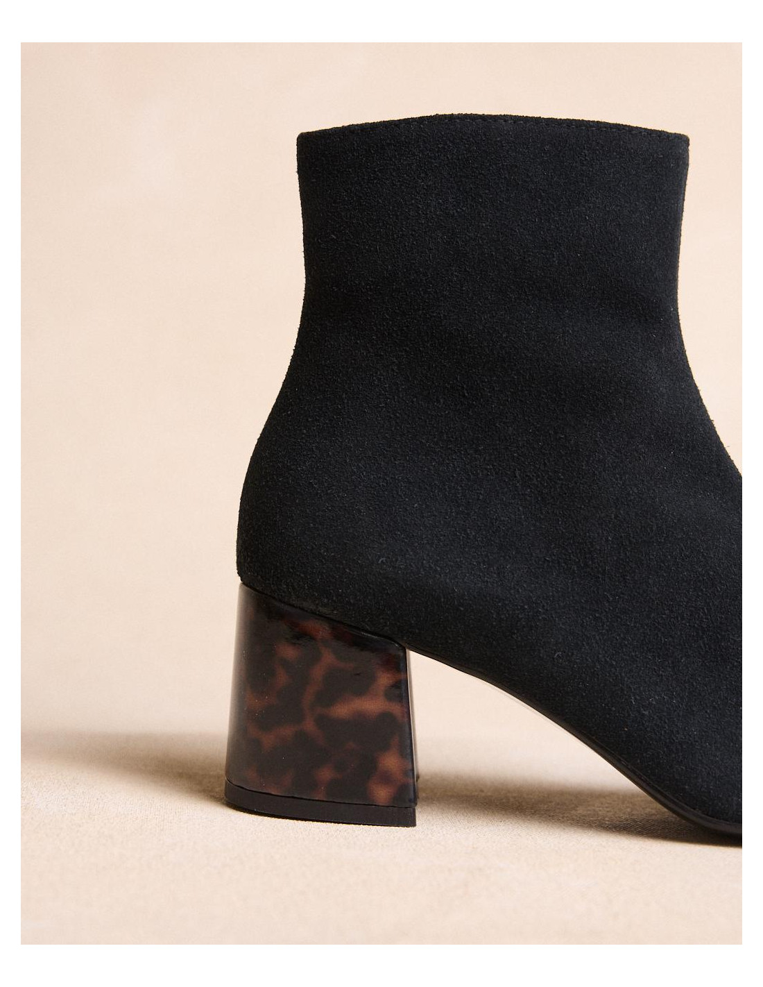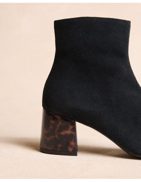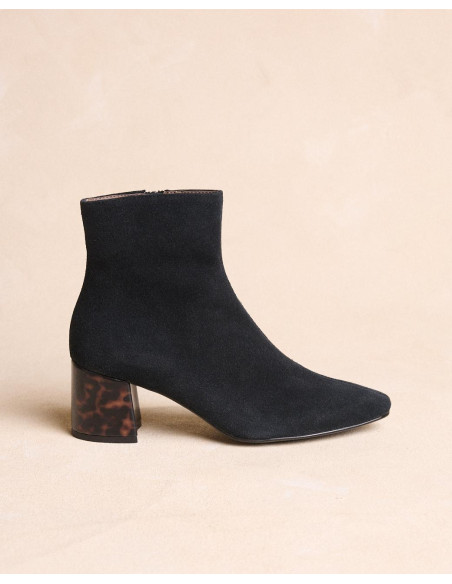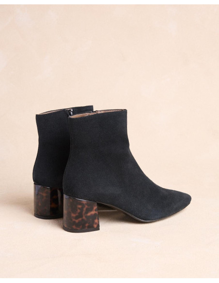 <p><span style="font-size: 10pt; font-family: Arial;">Botín de piel en color negro con punta redondeada, tacón ancho efecto carey y apertura con cremallera lateral.</span></p>