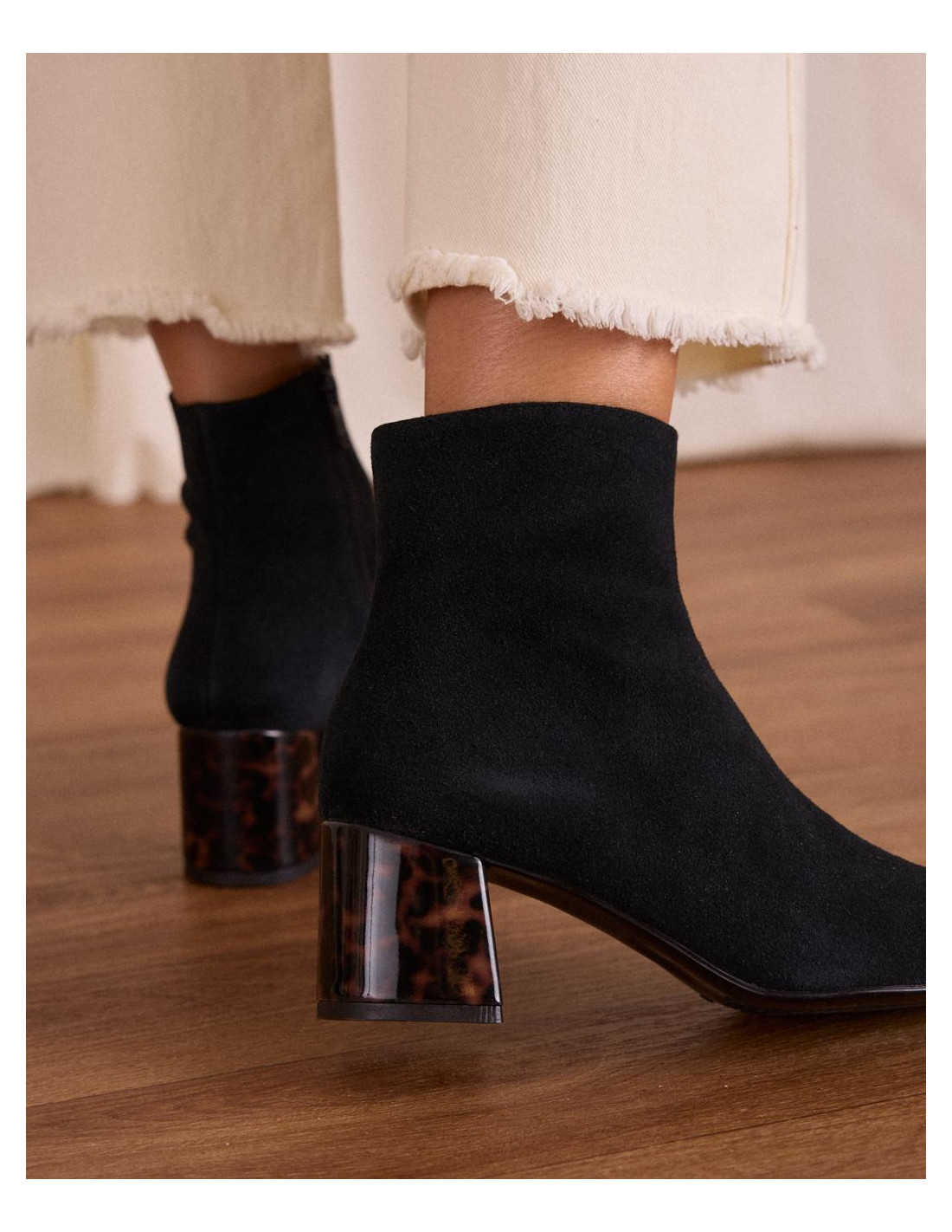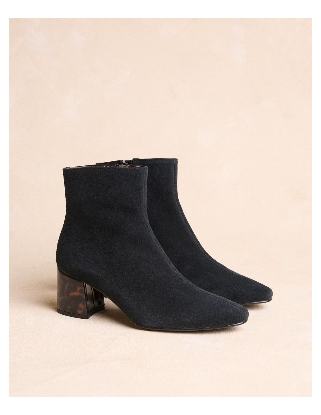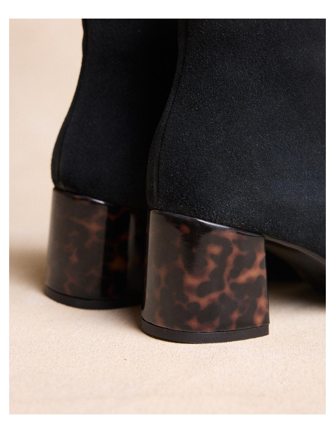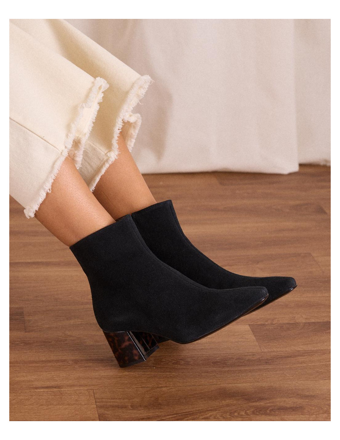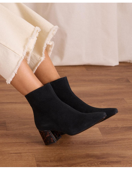 <p><span style="font-size: 10pt; font-family: Arial;">Botín de piel en color negro con punta redondeada, tacón ancho efecto carey y apertura con cremallera lateral.</span></p>