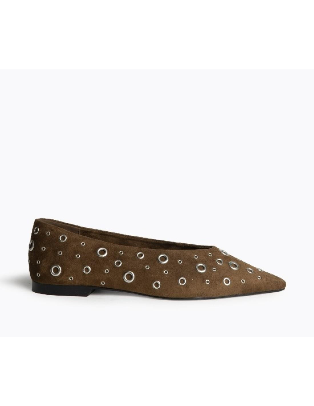 Bailarina plana terminado en punta con detalle de hojetes y de ante sintético.