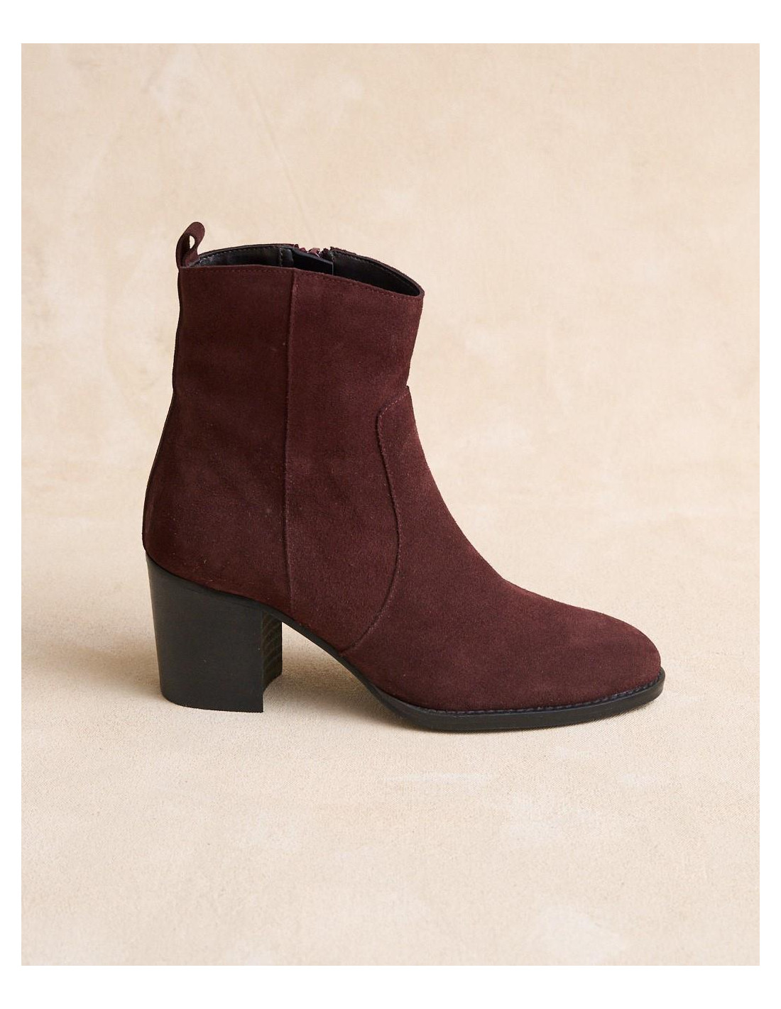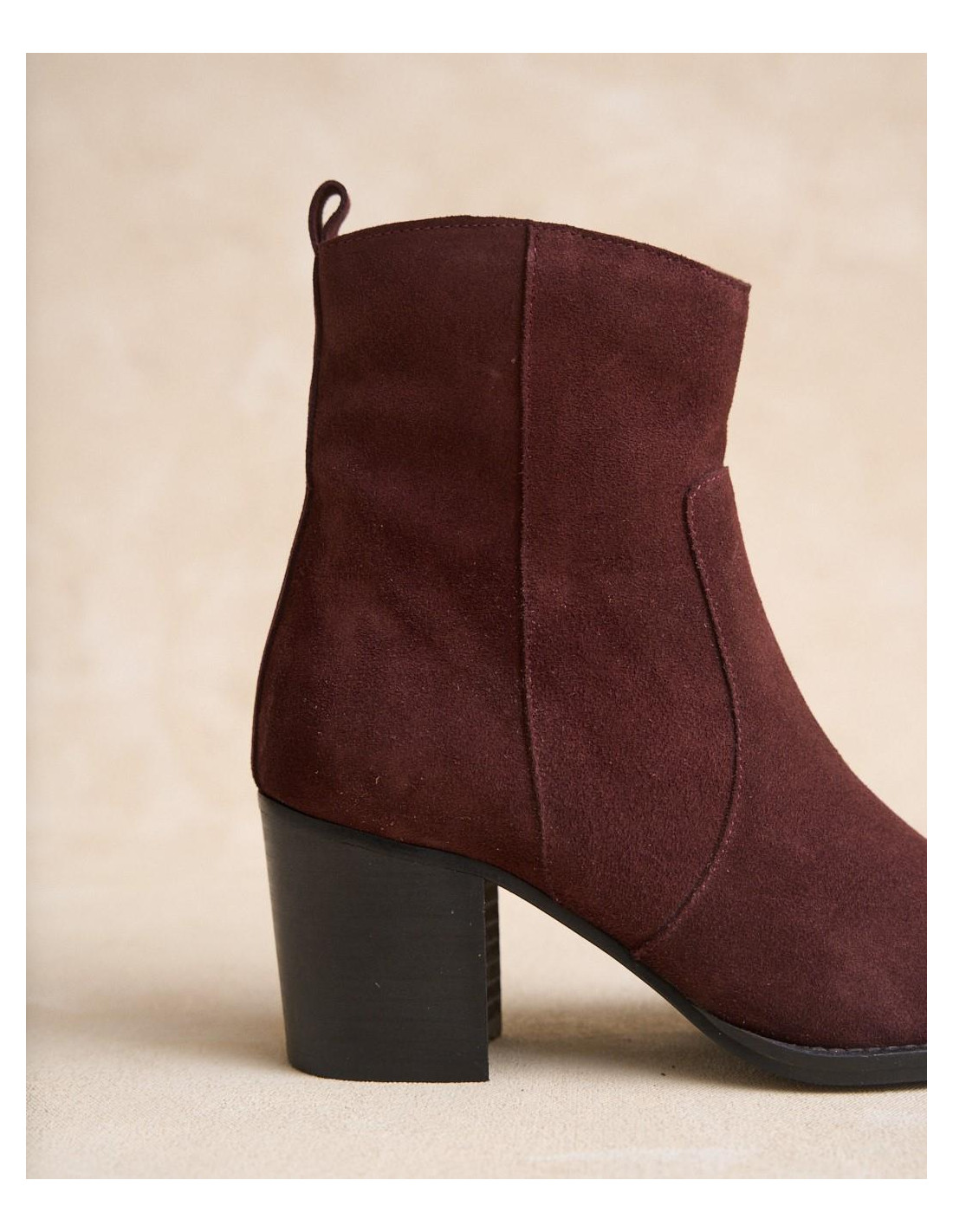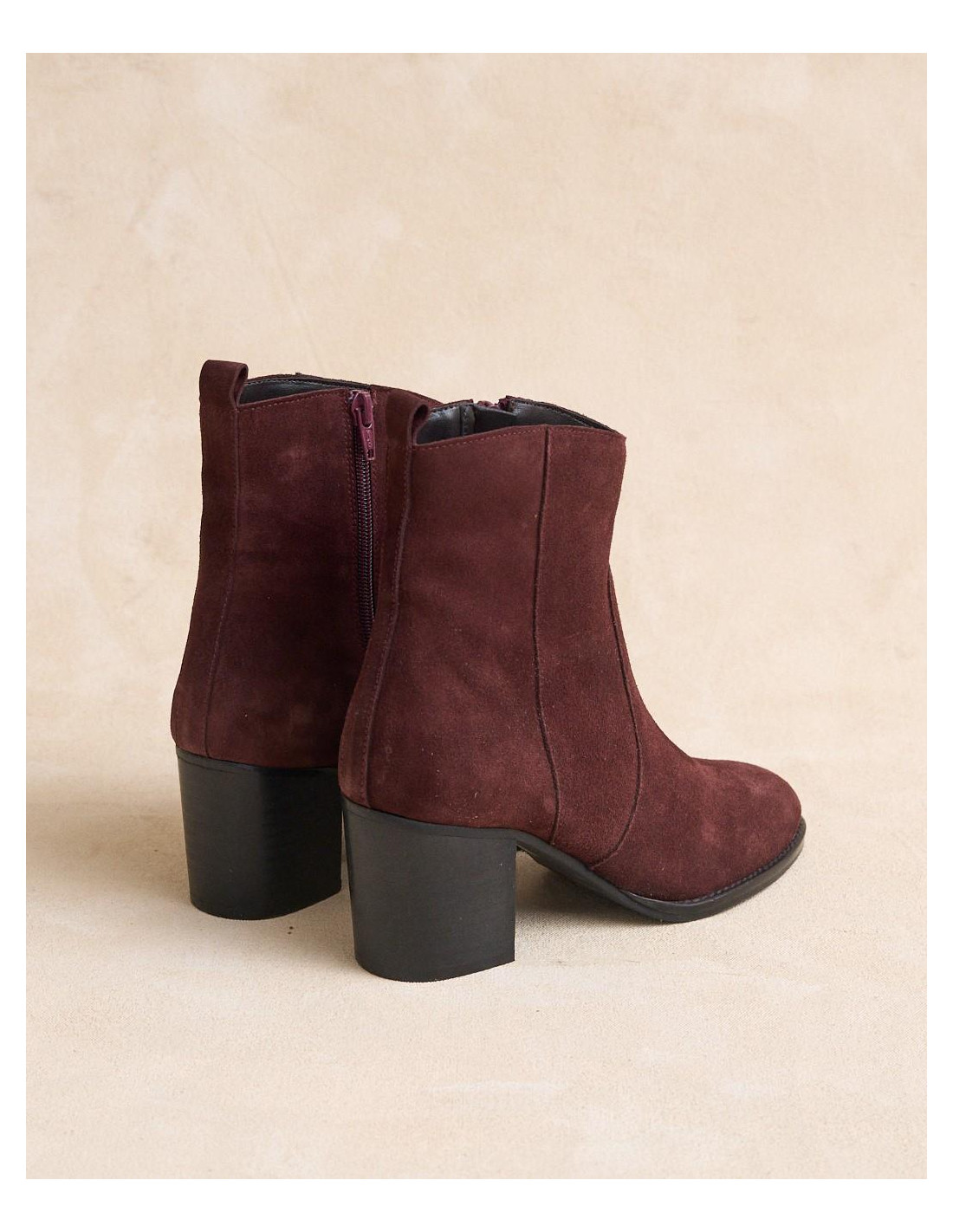 Botín de caña baja de ante en color burdeos. Punta redonda y tacón medio. Es un tipo de calzado ideal para looks más cowboy. Perfectas para combinar con denim y vestidos y faldas para darle un toque más country.