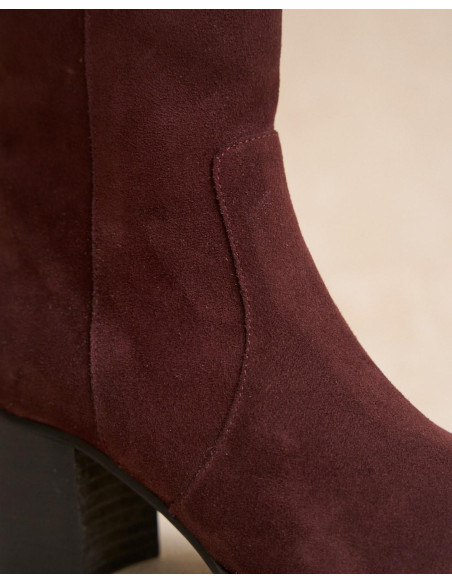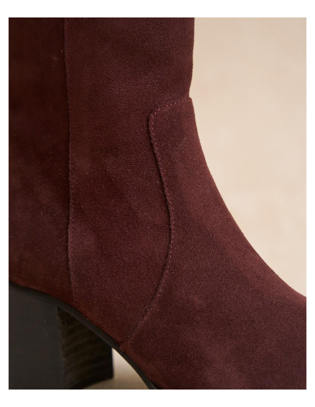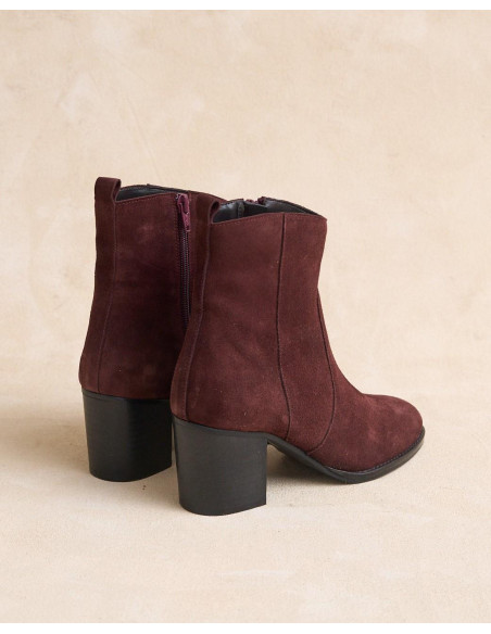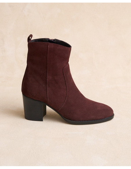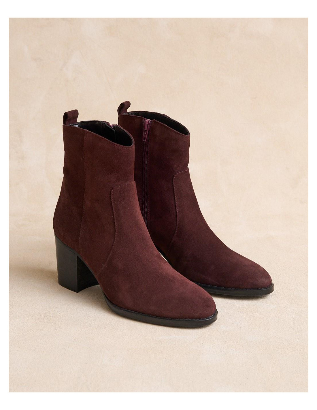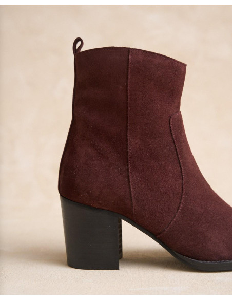 Botín de caña baja de ante en color burdeos. Punta redonda y tacón medio. Es un tipo de calzado ideal para looks más cowboy. Perfectas para combinar con denim y vestidos y faldas para darle un toque más country.