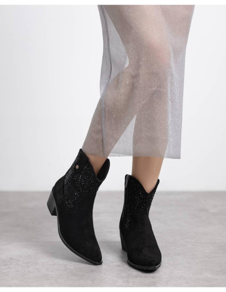 Botín de estilo tejano de media caña con tacón tamaño medio, terminado en punta y con detalle de piedras con brillo. Color negro.