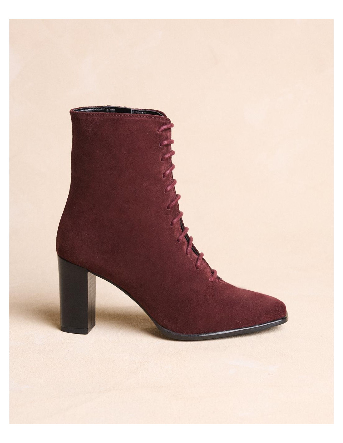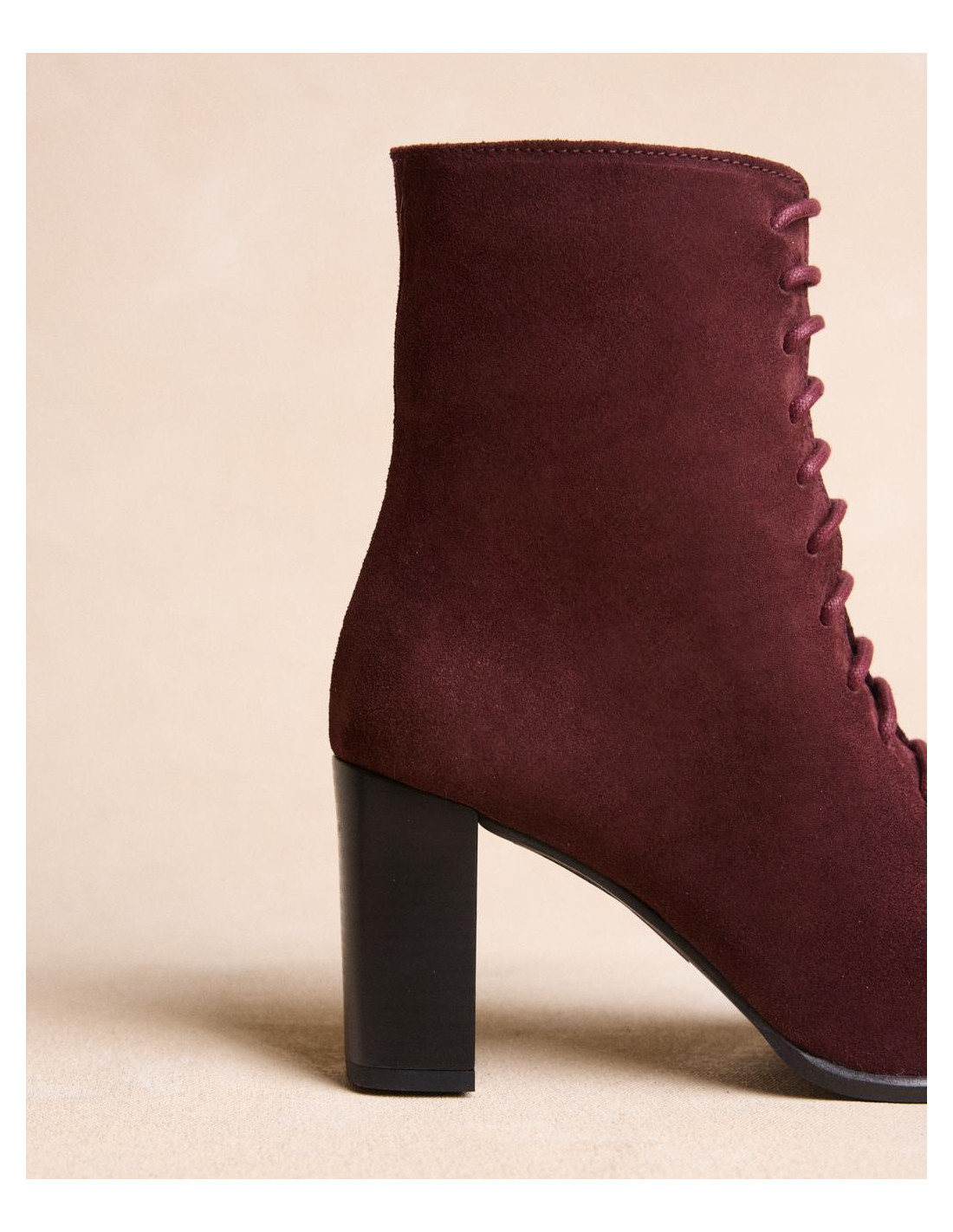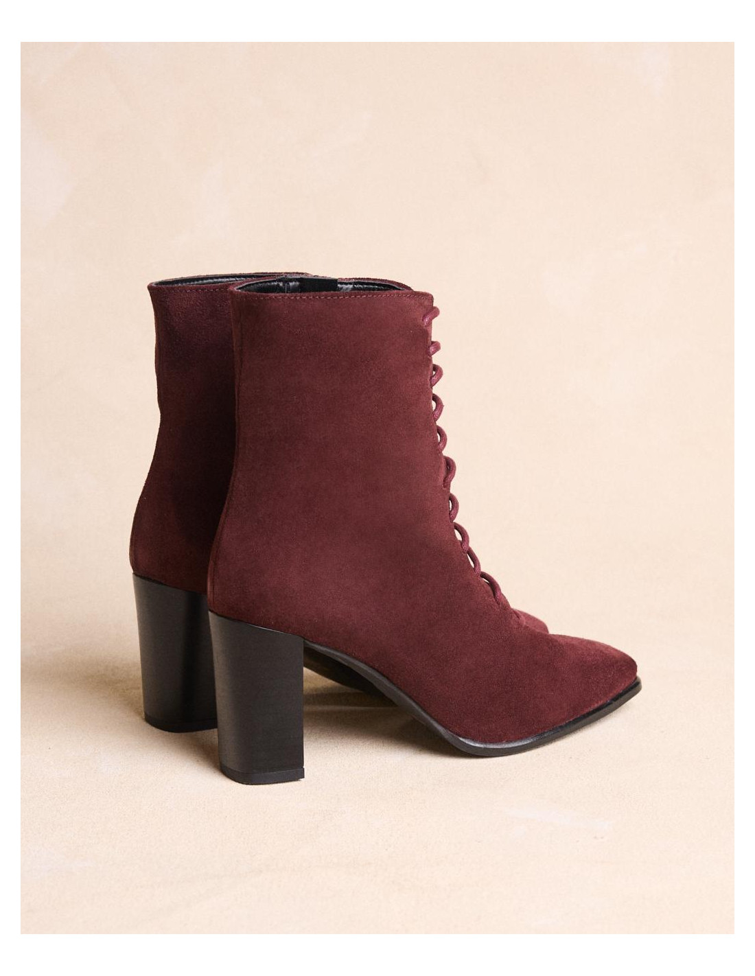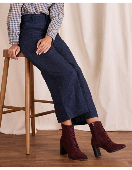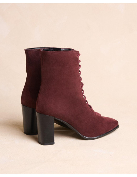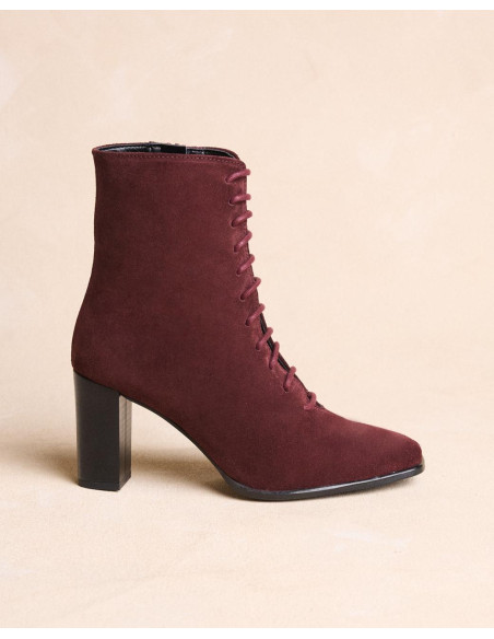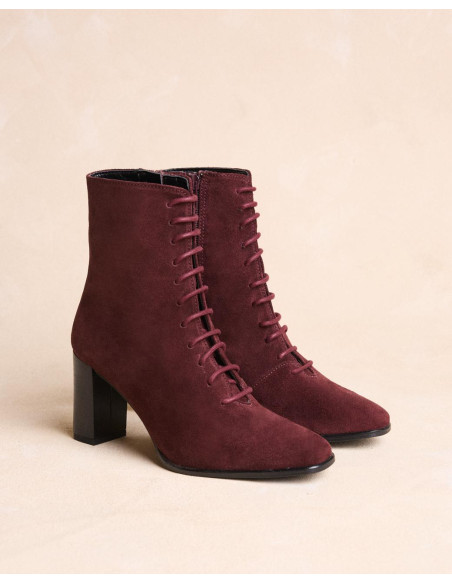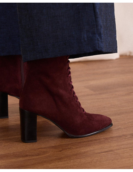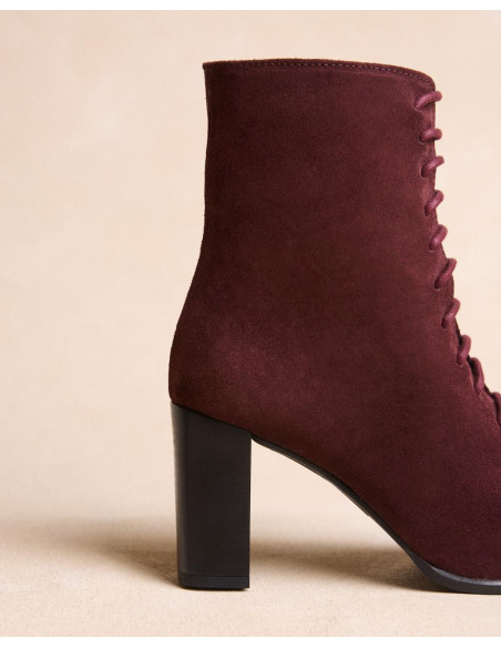 <p><span style="font-size: 10pt; font-family: Arial;">Botín acordonado de ante en color burdeos, caña media estrecha al tobillo, punta cuadrada y acordonado en la parte de la caña y tacón de grosor medio y redondo.</span></p>