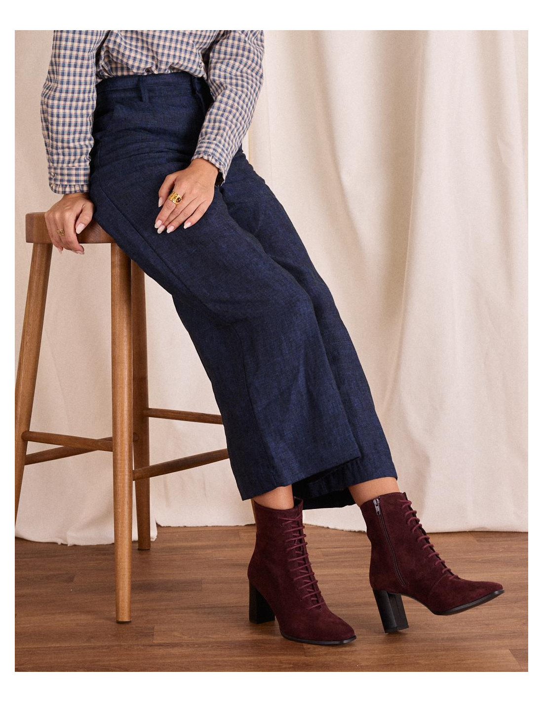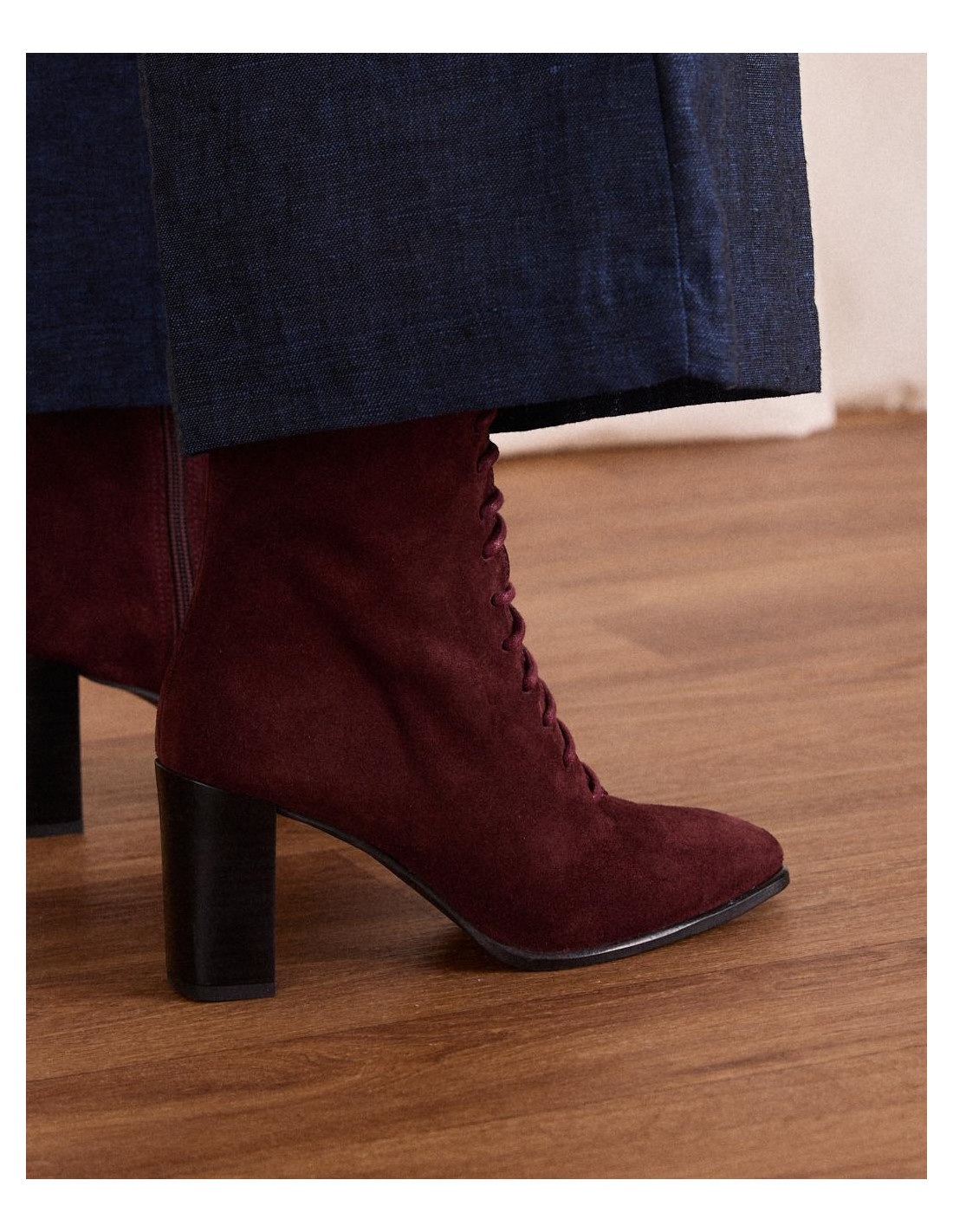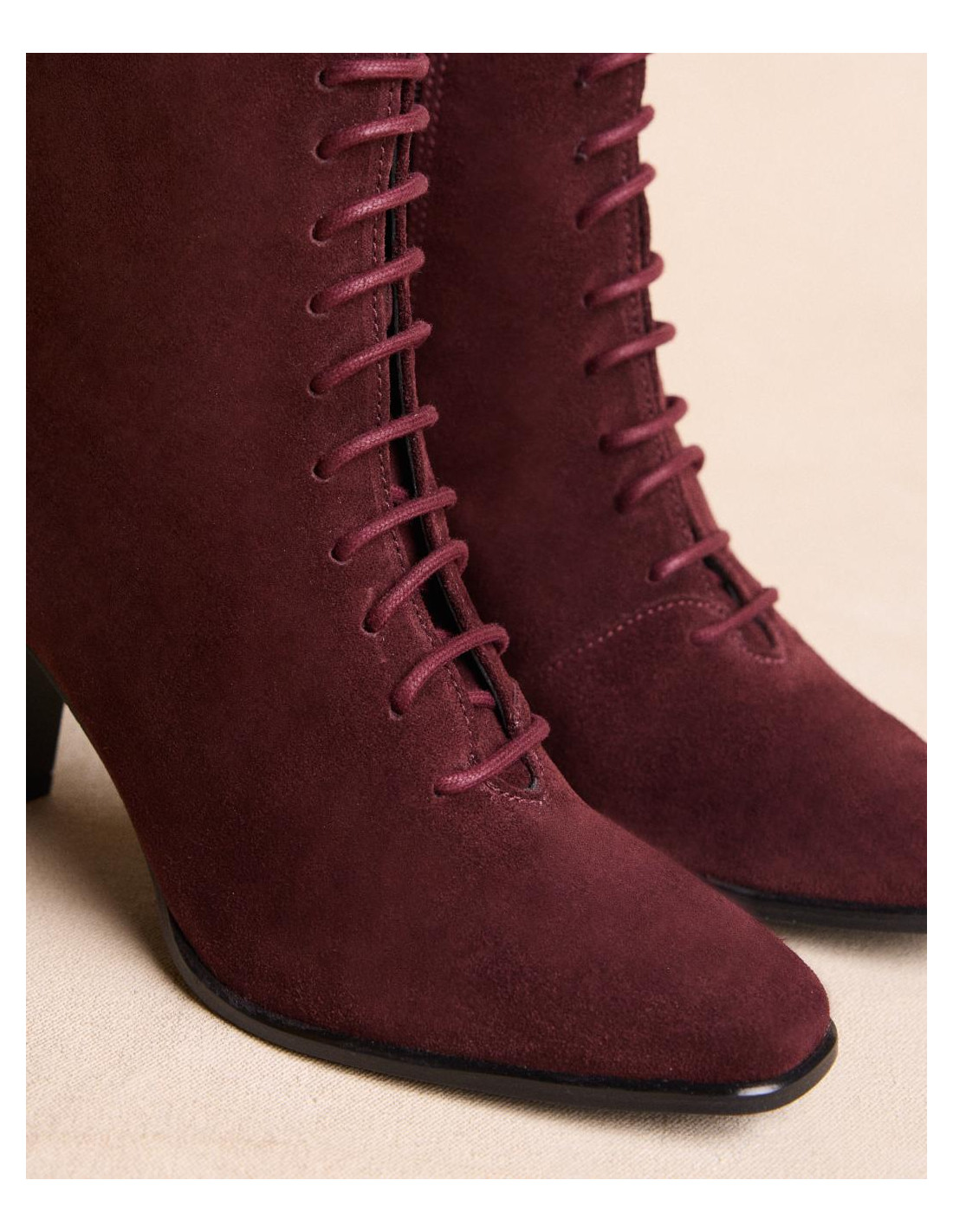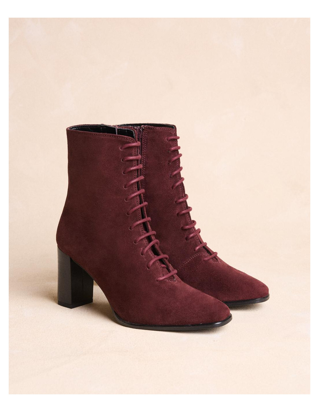 <p><span style="font-size: 10pt; font-family: Arial;">Botín acordonado de ante en color burdeos, caña media estrecha al tobillo, punta cuadrada y acordonado en la parte de la caña y tacón de grosor medio y redondo.</span></p>