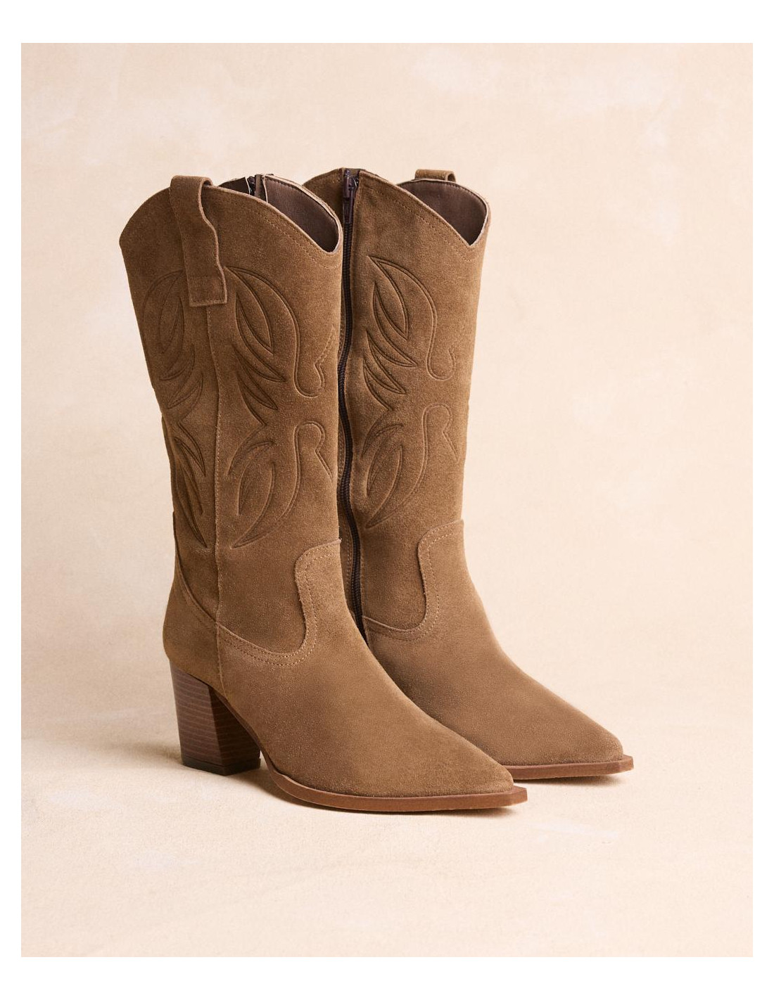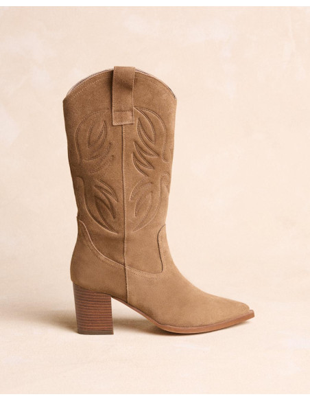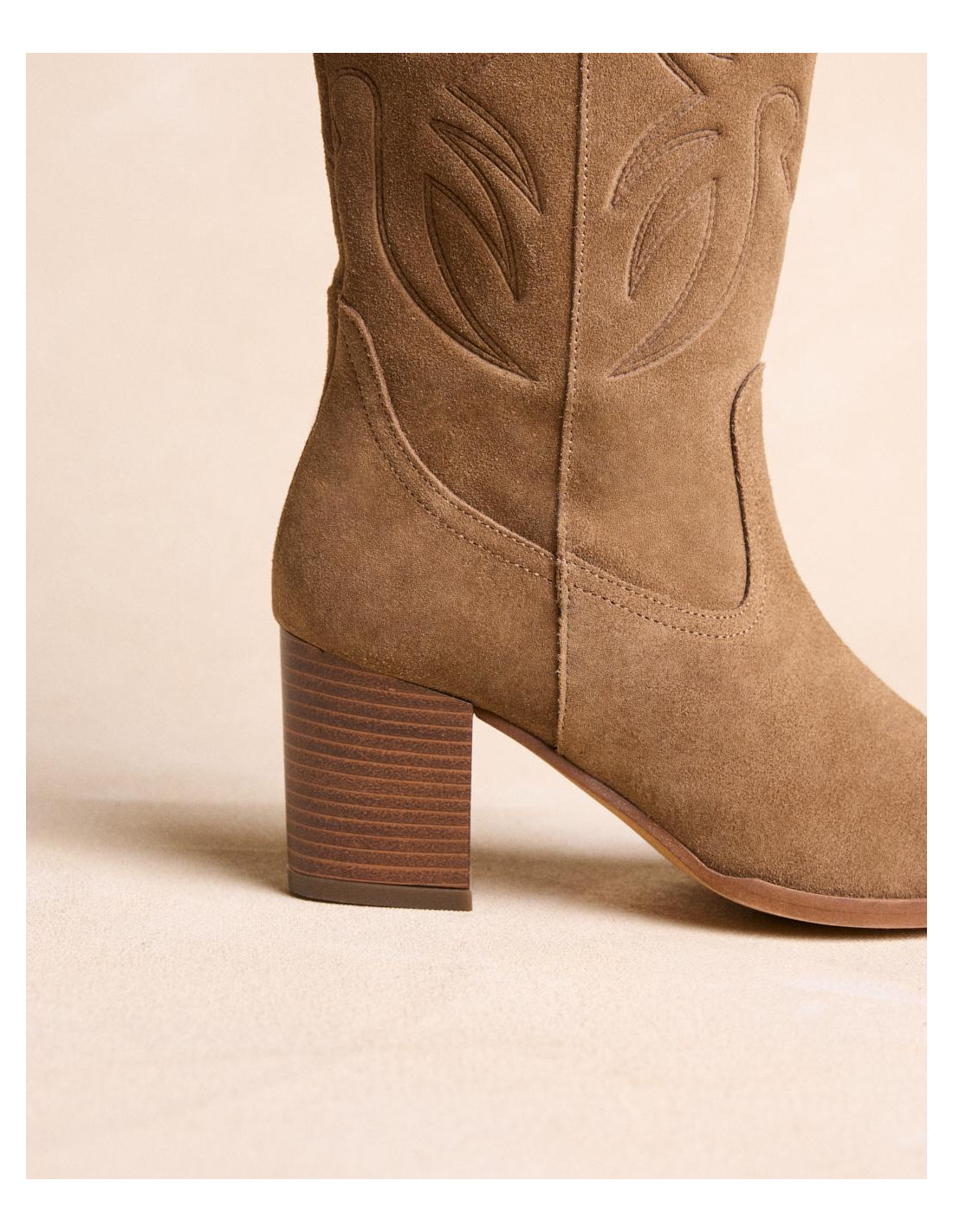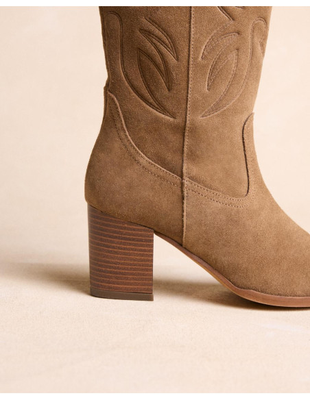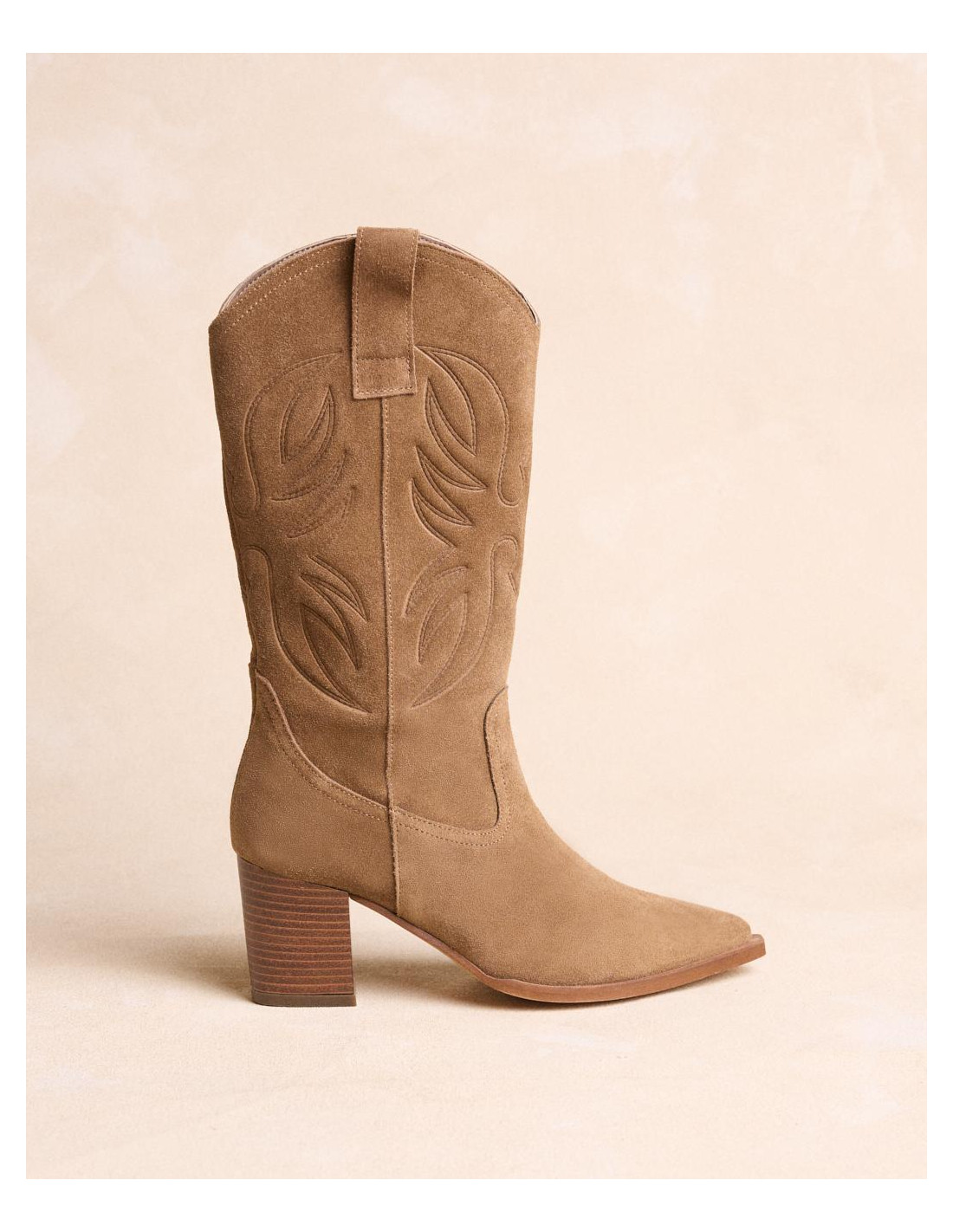<p><span style="font-size: 10pt; font-family: Arial;">Botas estilo cowboy en color taupe con diseño de caña media y bordados decorativos en la parte superior. Presentan punta afilada y tacón medio ancho que aporta comodidad y estabilidad.</span></p> <p><span style="font-size: 10pt; font-family: Arial;">Unas botas versátiles y cómodas, perfectas para completar tus looks.</span></p> <p><span style="font-size: 10pt; font-family: Arial;">Diseñadas y fabricadas en España.</span></p>