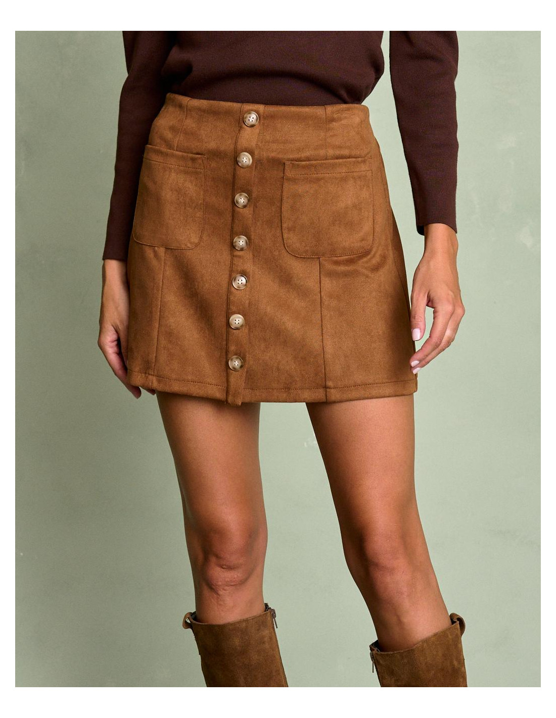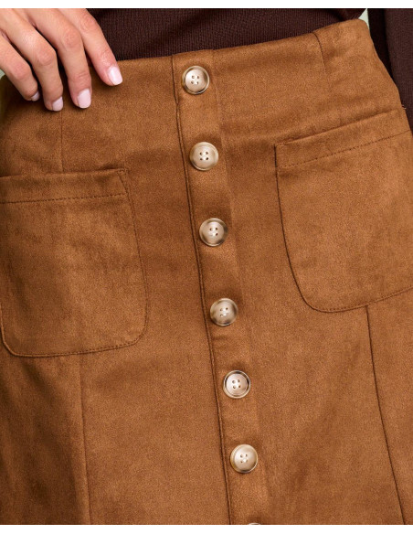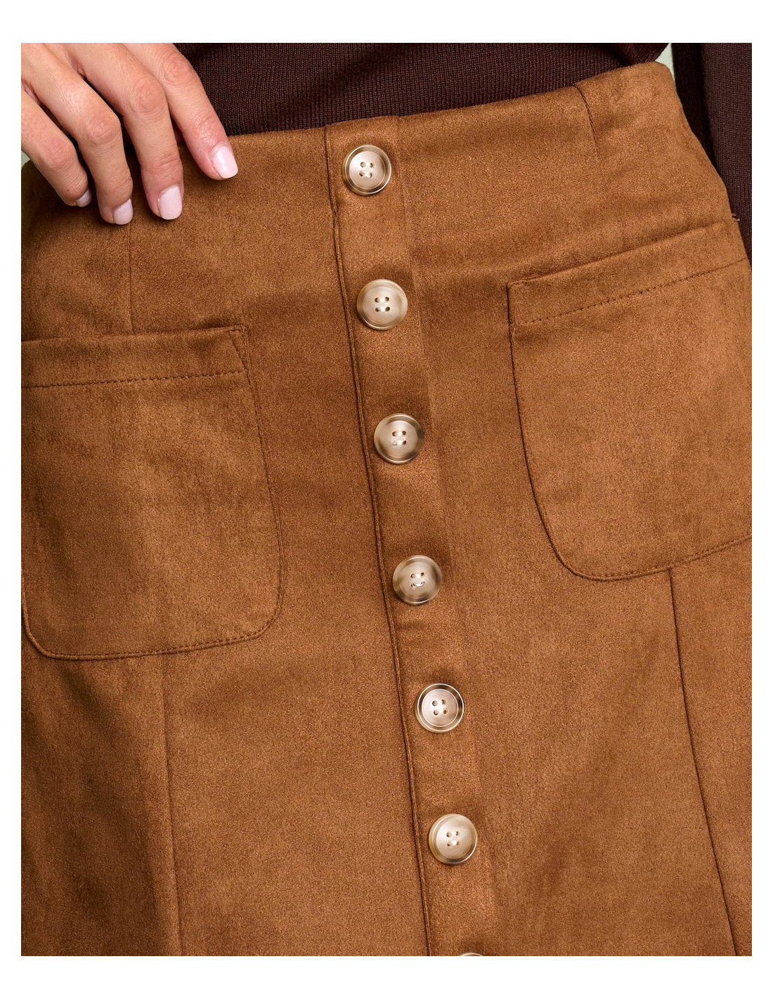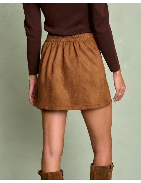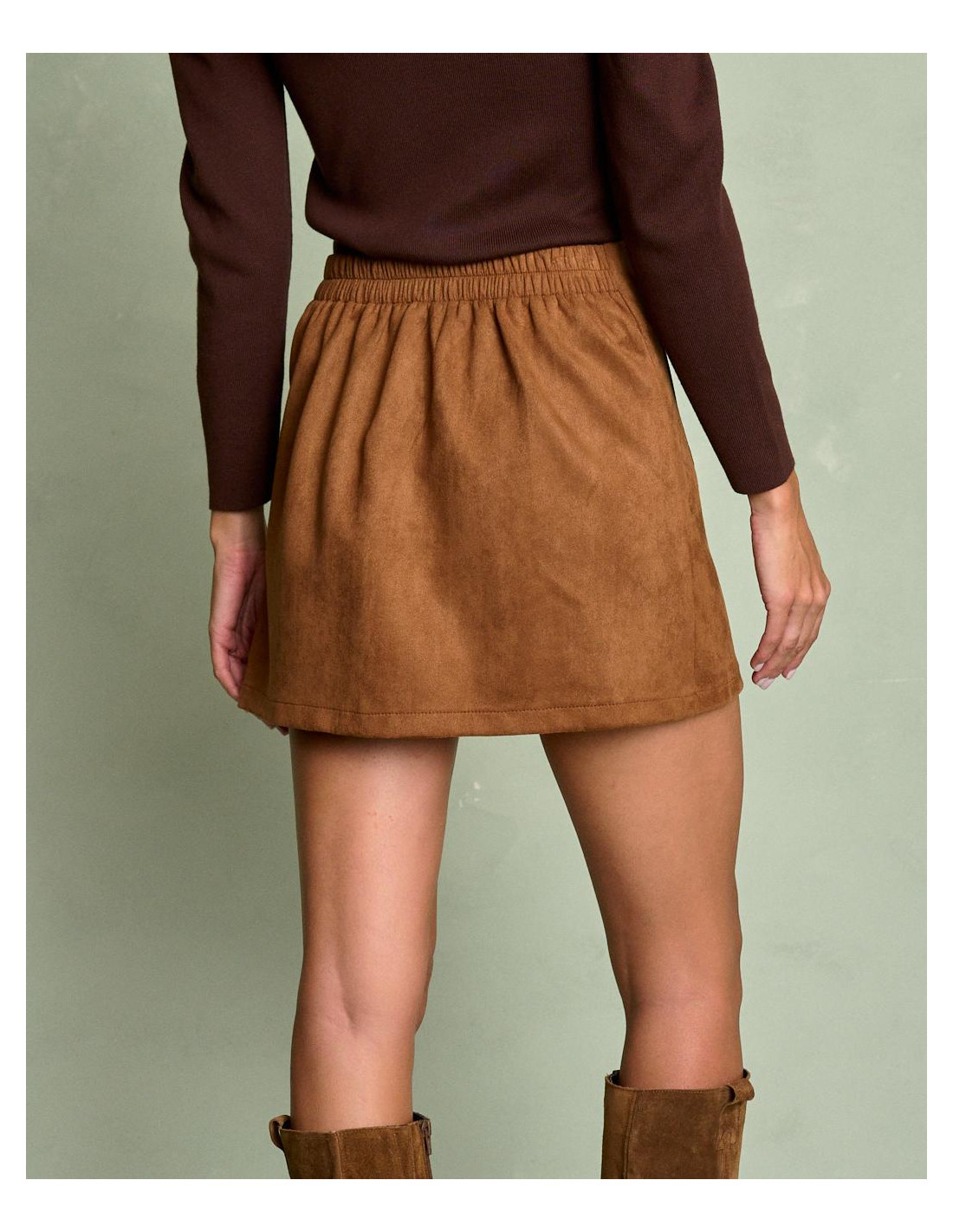 <p><span style="font-size: 10pt; font-family: Arial;">Falda corta en color camel con efecto de ante. El diseño cuenta con una cintura elástica para máxima comodidad, cierre de botones y dos prácticos bolsillos frontales.</span></p> <p><span style="font-size: 10pt; font-family: Arial;">Ideal para un look de estilo casual y moderno.</span></p>