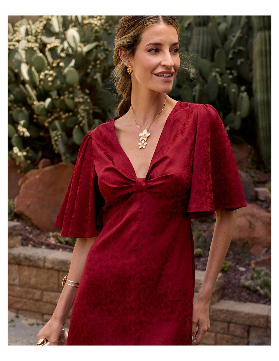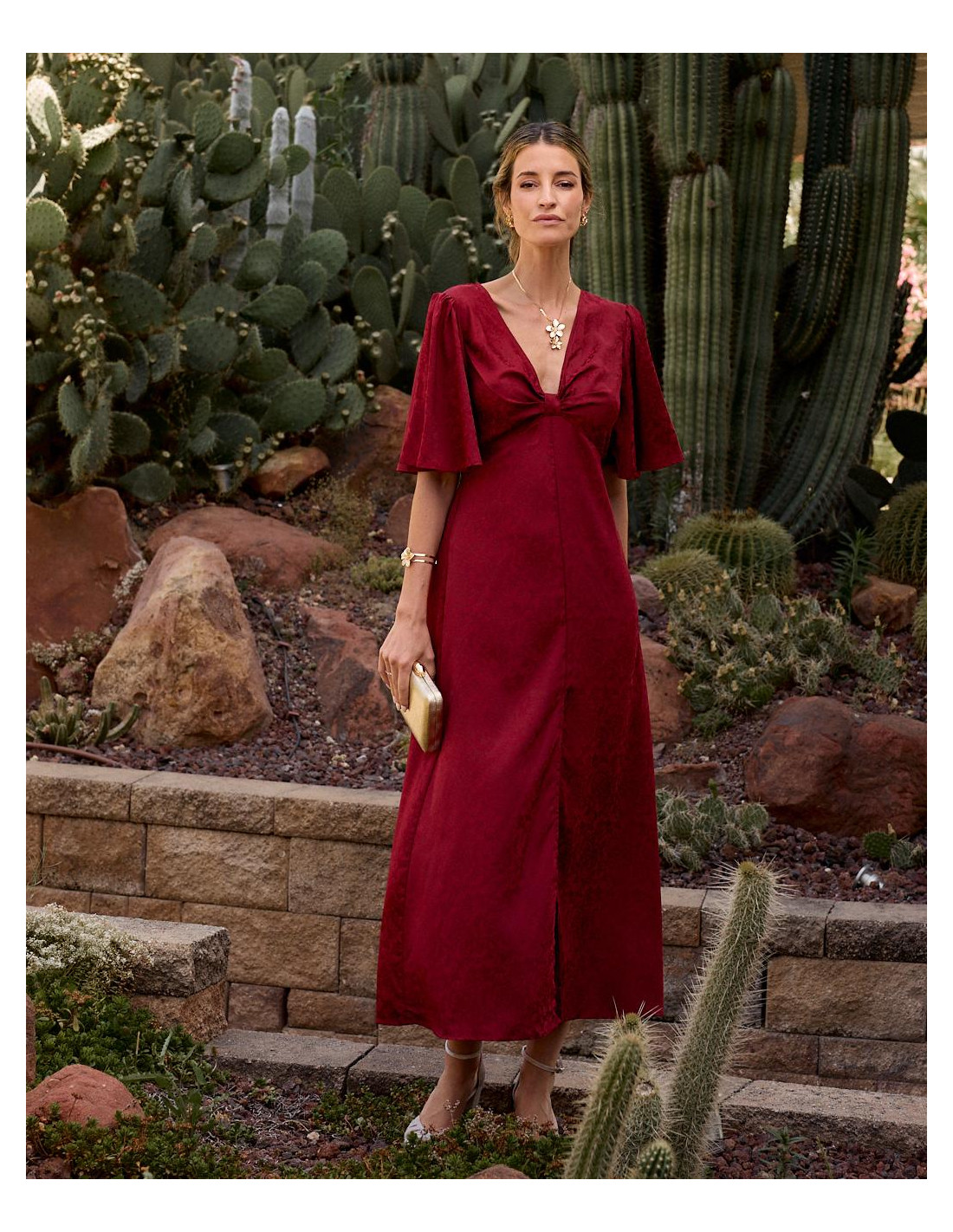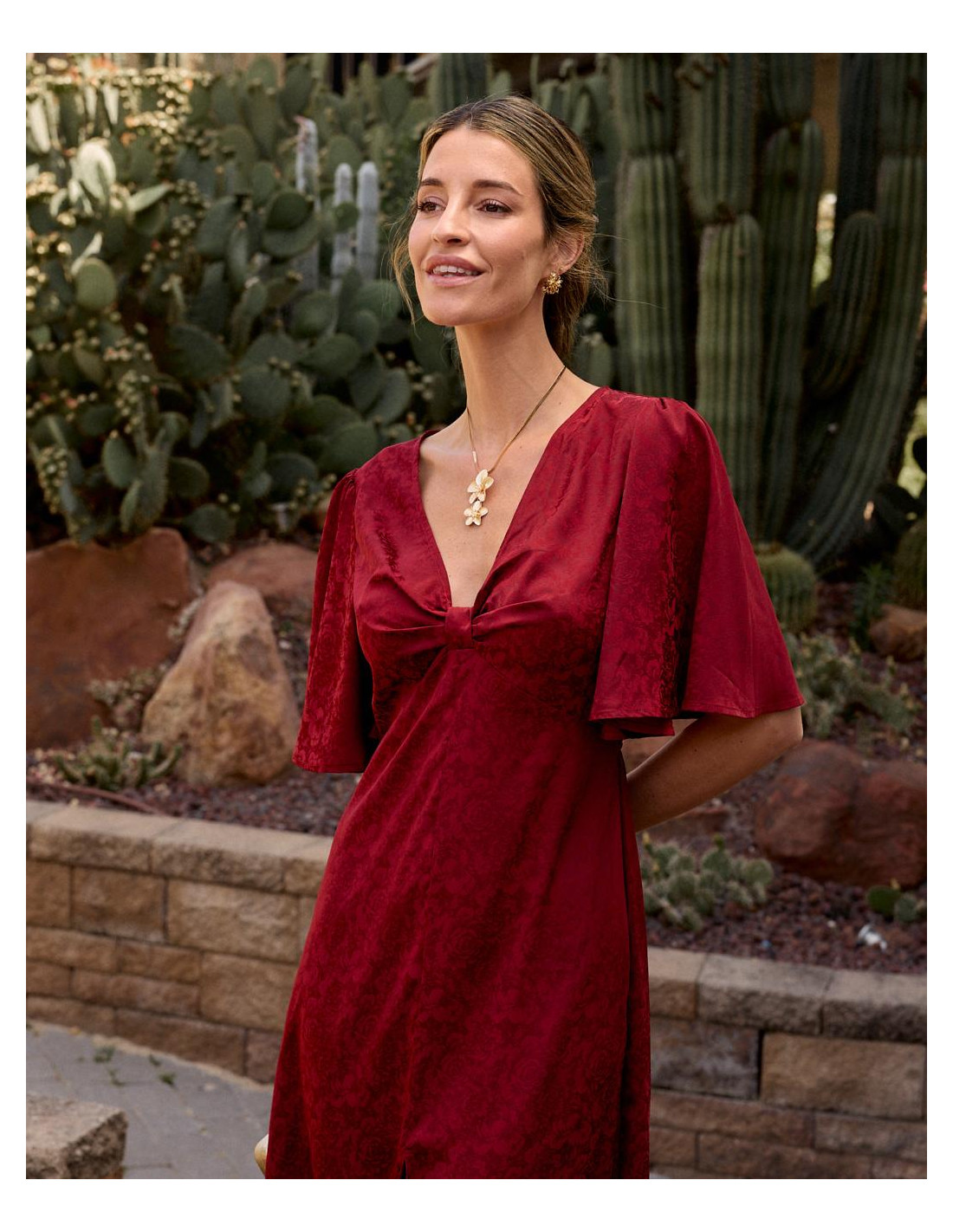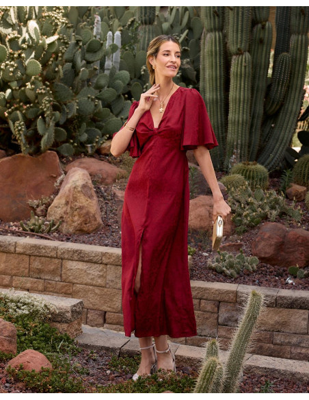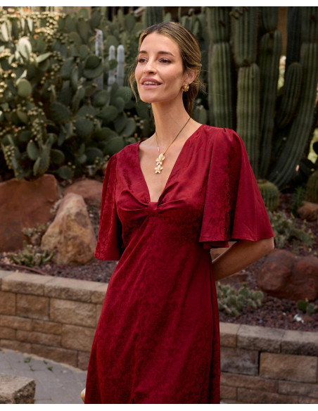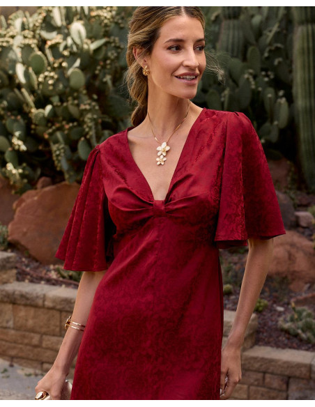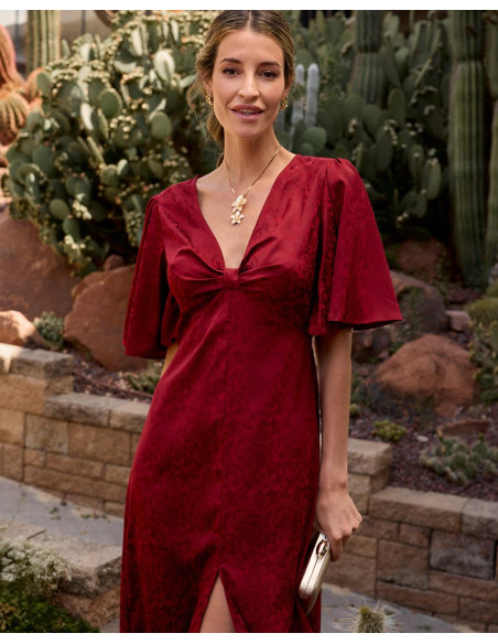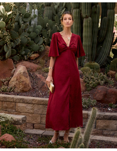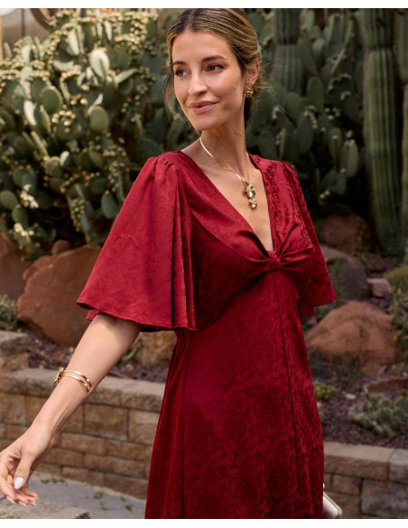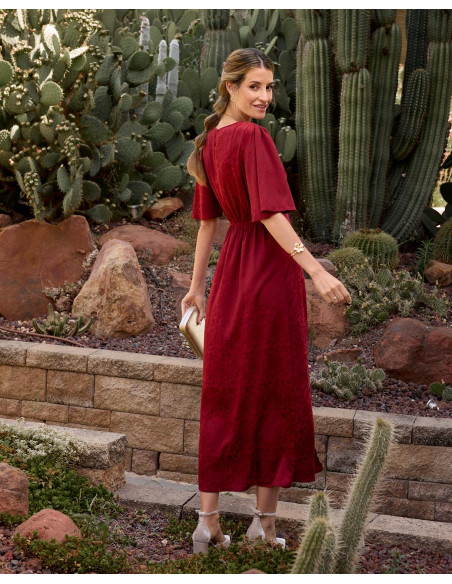 <p><span style="font-size: 10pt; font-family: Arial;">Vestido midi en tono rojo con tejido jacquard de acabado satinado. Diseño con escote en pico y nudo central que estiliza el pecho, acompañado de manga capa fluida que aporta movimiento. Silueta ajustada en cintura y falda evasé. No incluye forro.</span></p>