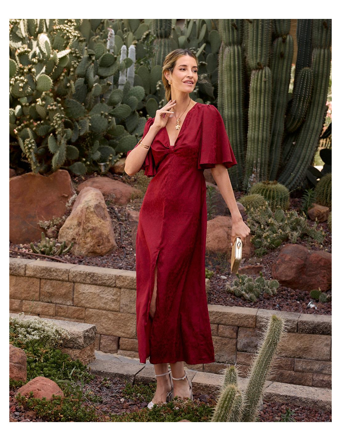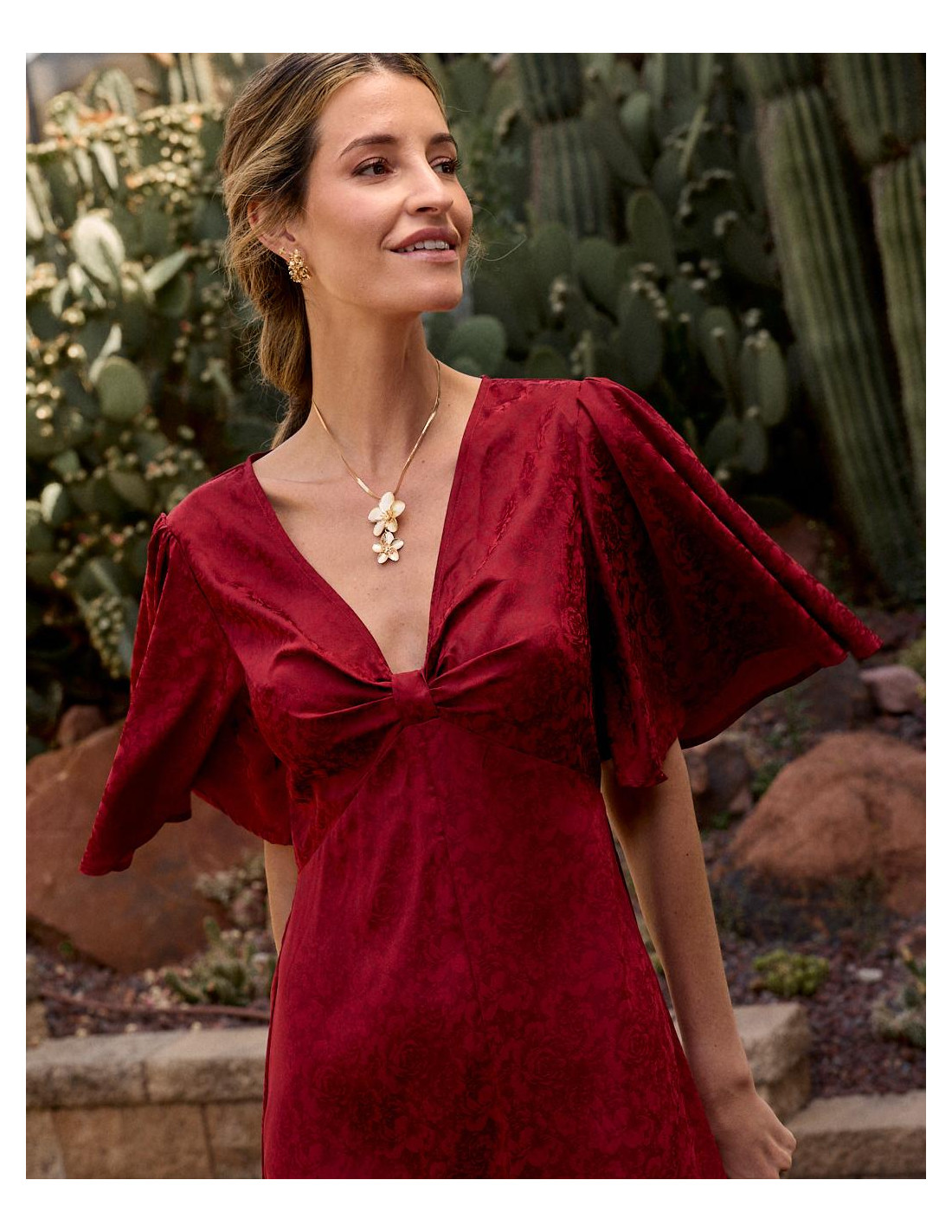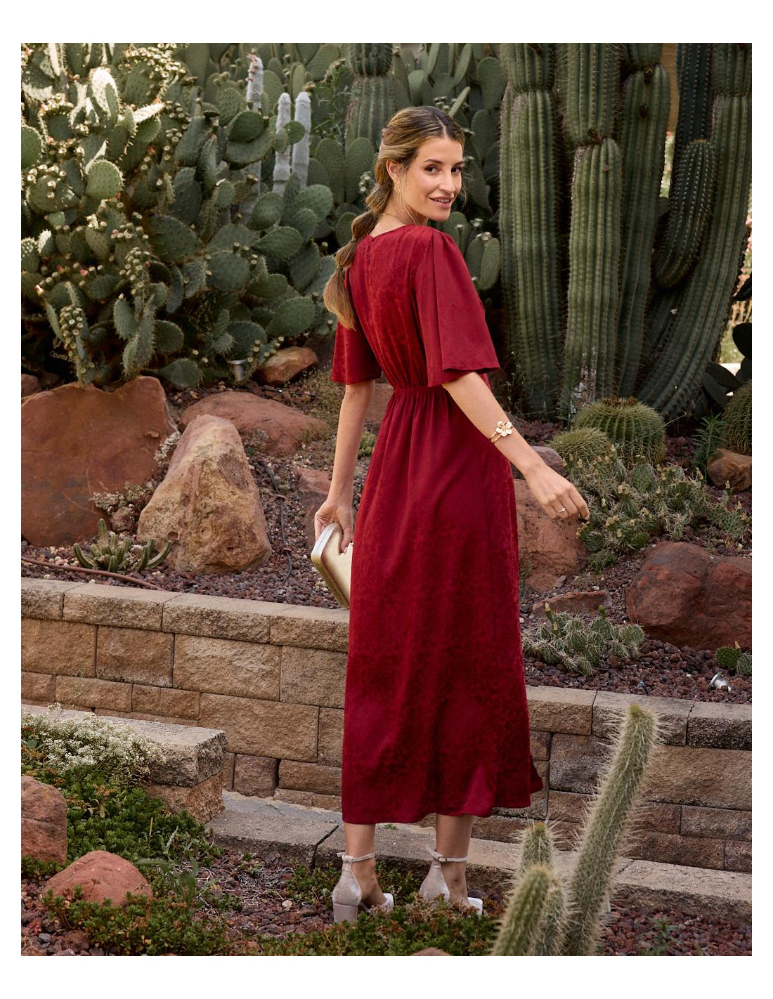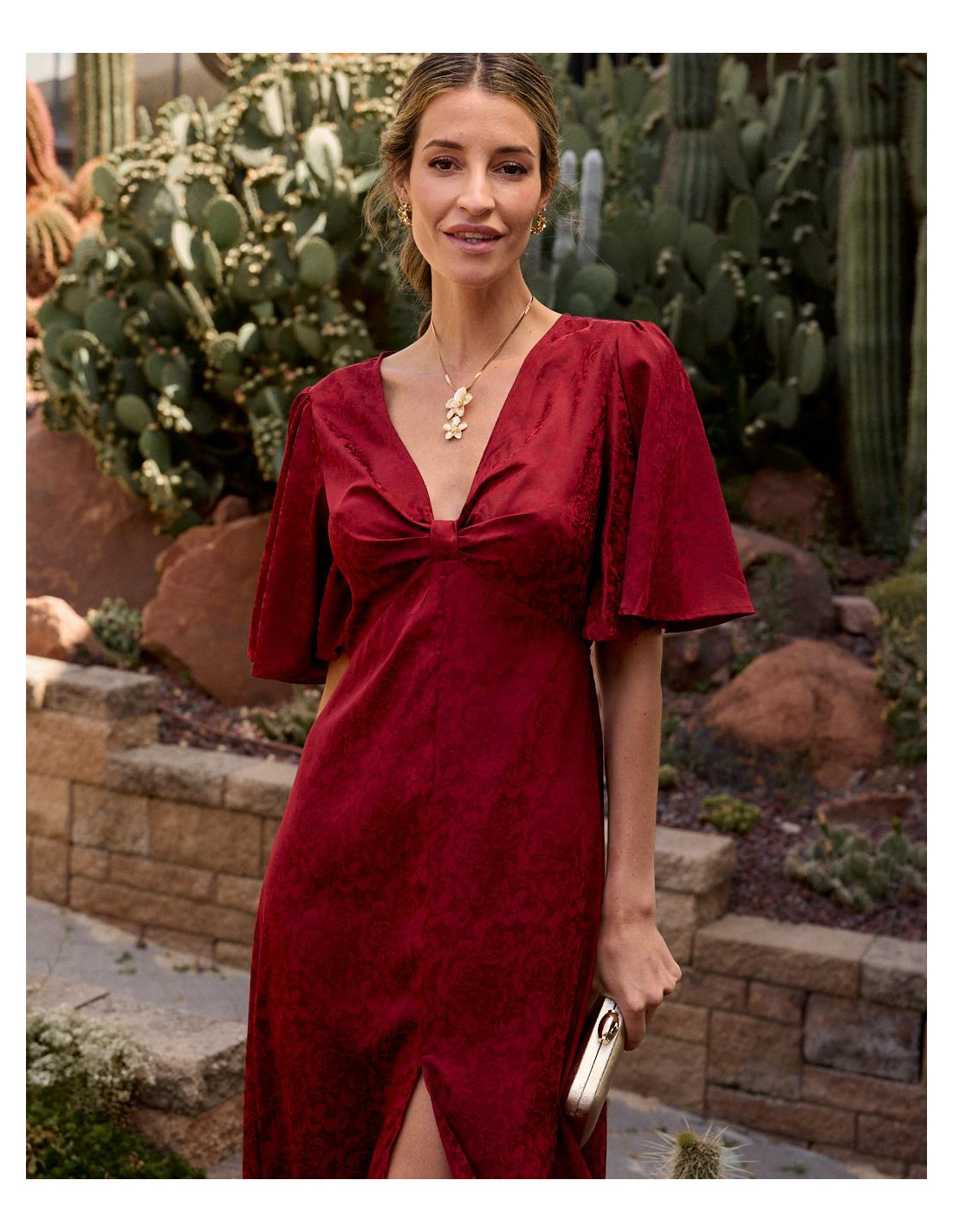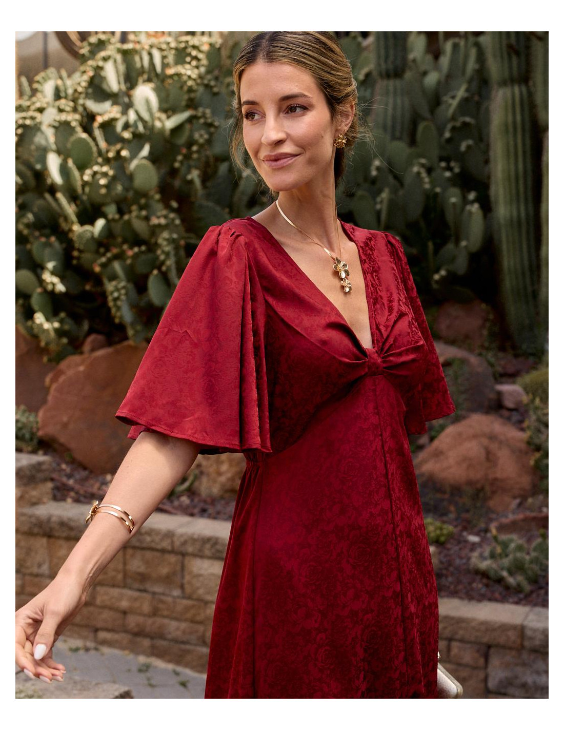 <p><span style="font-size: 10pt; font-family: Arial;">Vestido midi en tono rojo con tejido jacquard de acabado satinado. Diseño con escote en pico y nudo central que estiliza el pecho, acompañado de manga capa fluida que aporta movimiento. Silueta ajustada en cintura y falda evasé. No incluye forro.</span></p>