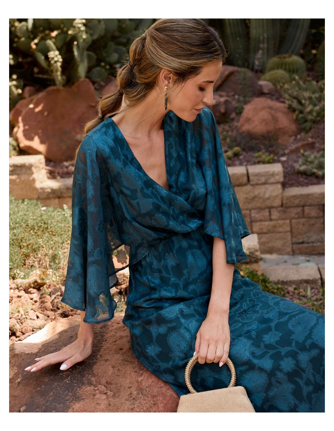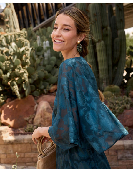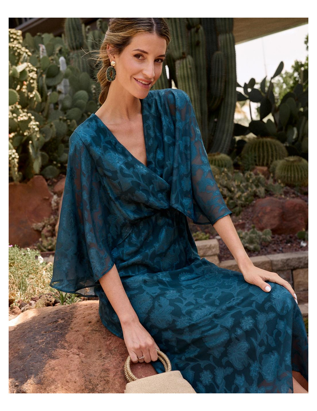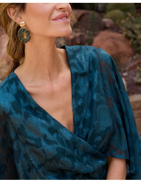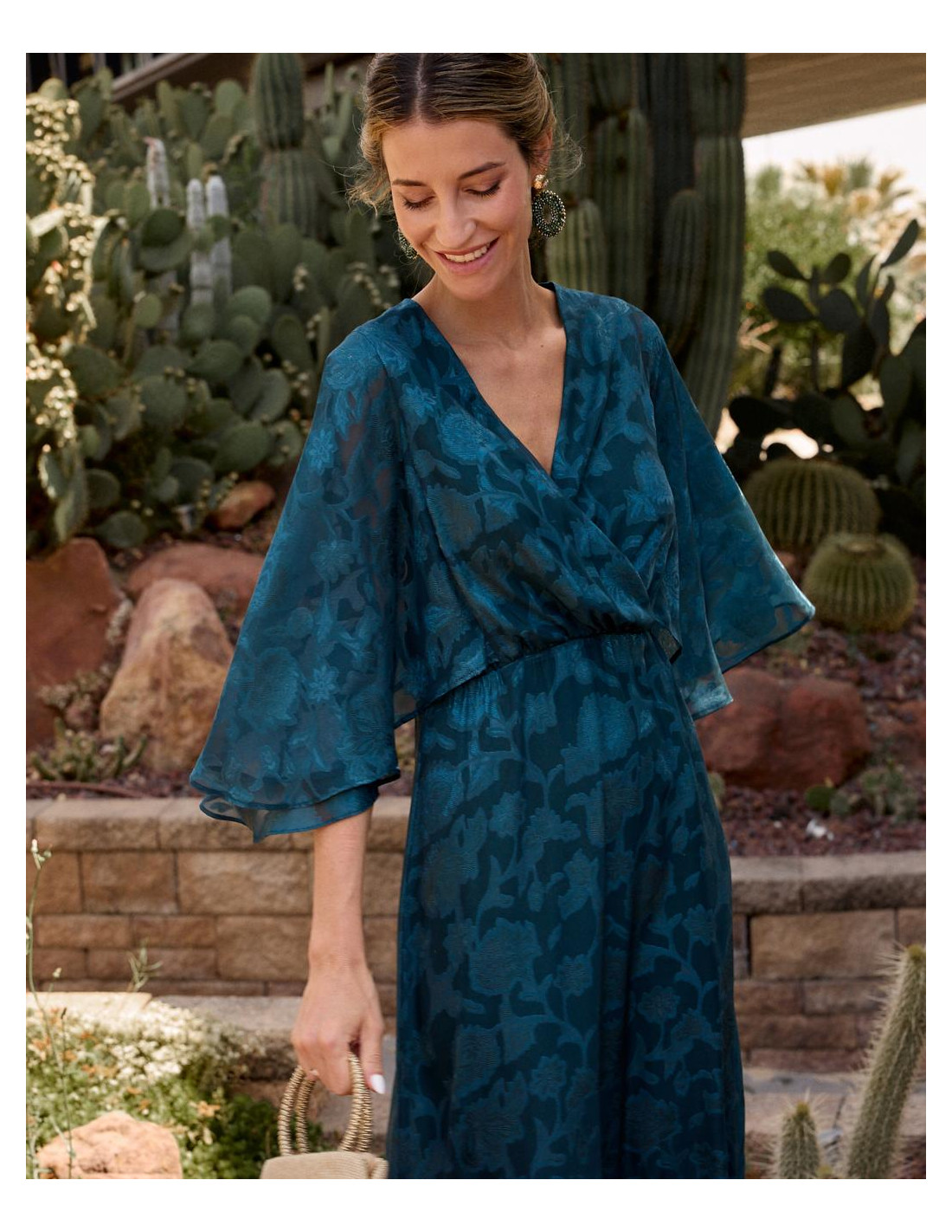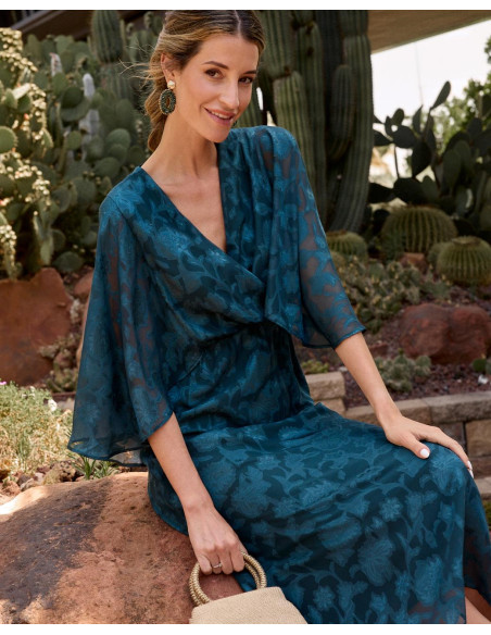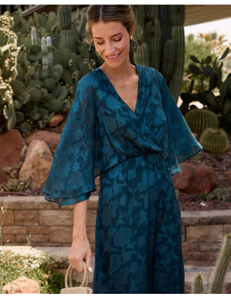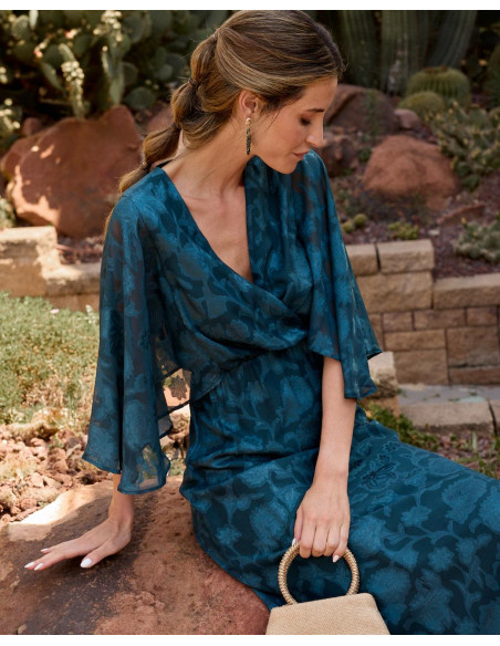 <p><span style="font-size: 10pt; font-family: Arial;">Vestido largo en tono petróleo con tejido jacquard de acabado satinado. Diseño cruzado con escote en pico y manga fluida tipo murciélago. Corte entallado en la cintura y falda con ligera caída. Incluye forro interior.</span></p>
