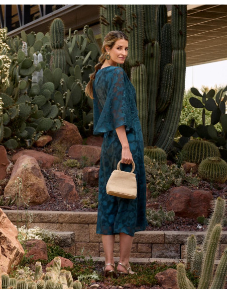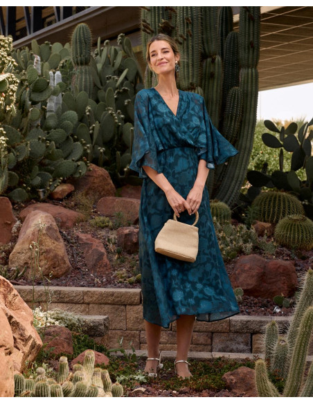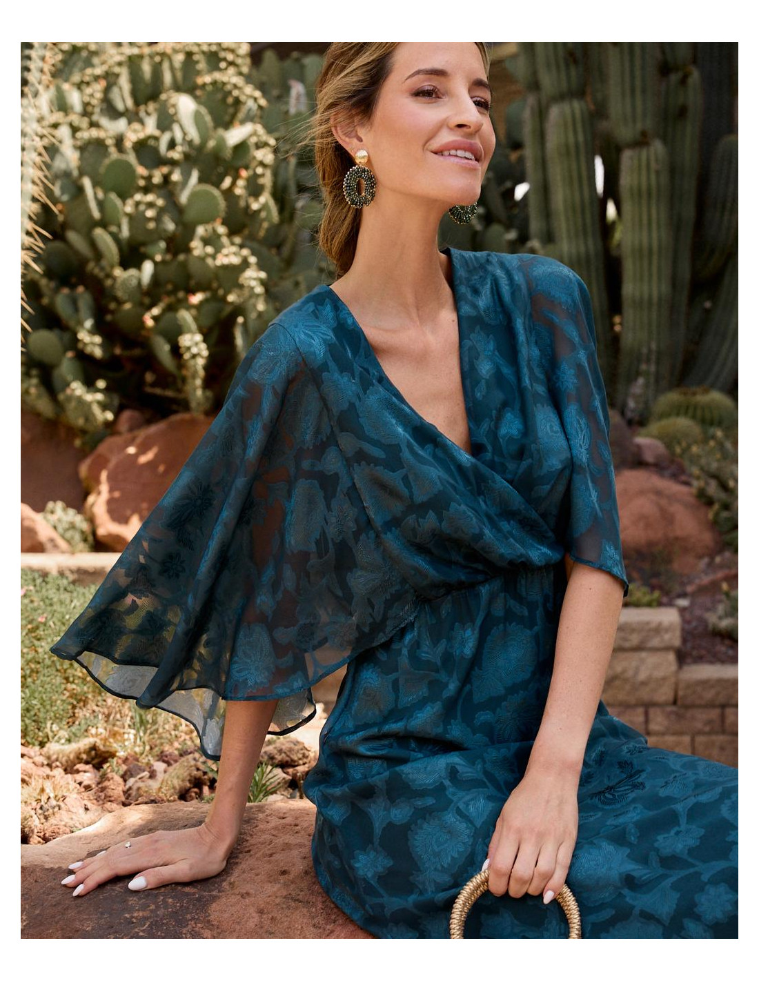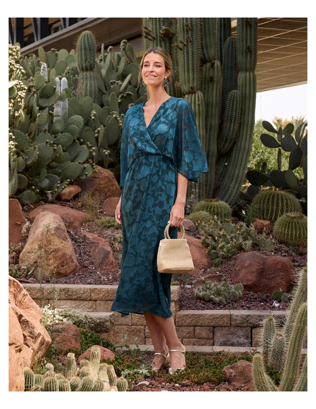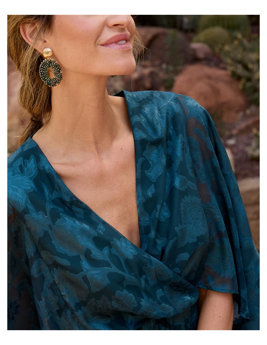 <p><span style="font-size: 10pt; font-family: Arial;">Vestido largo en tono petróleo con tejido jacquard de acabado satinado. Diseño cruzado con escote en pico y manga fluida tipo murciélago. Corte entallado en la cintura y falda con ligera caída. Incluye forro interior.</span></p>