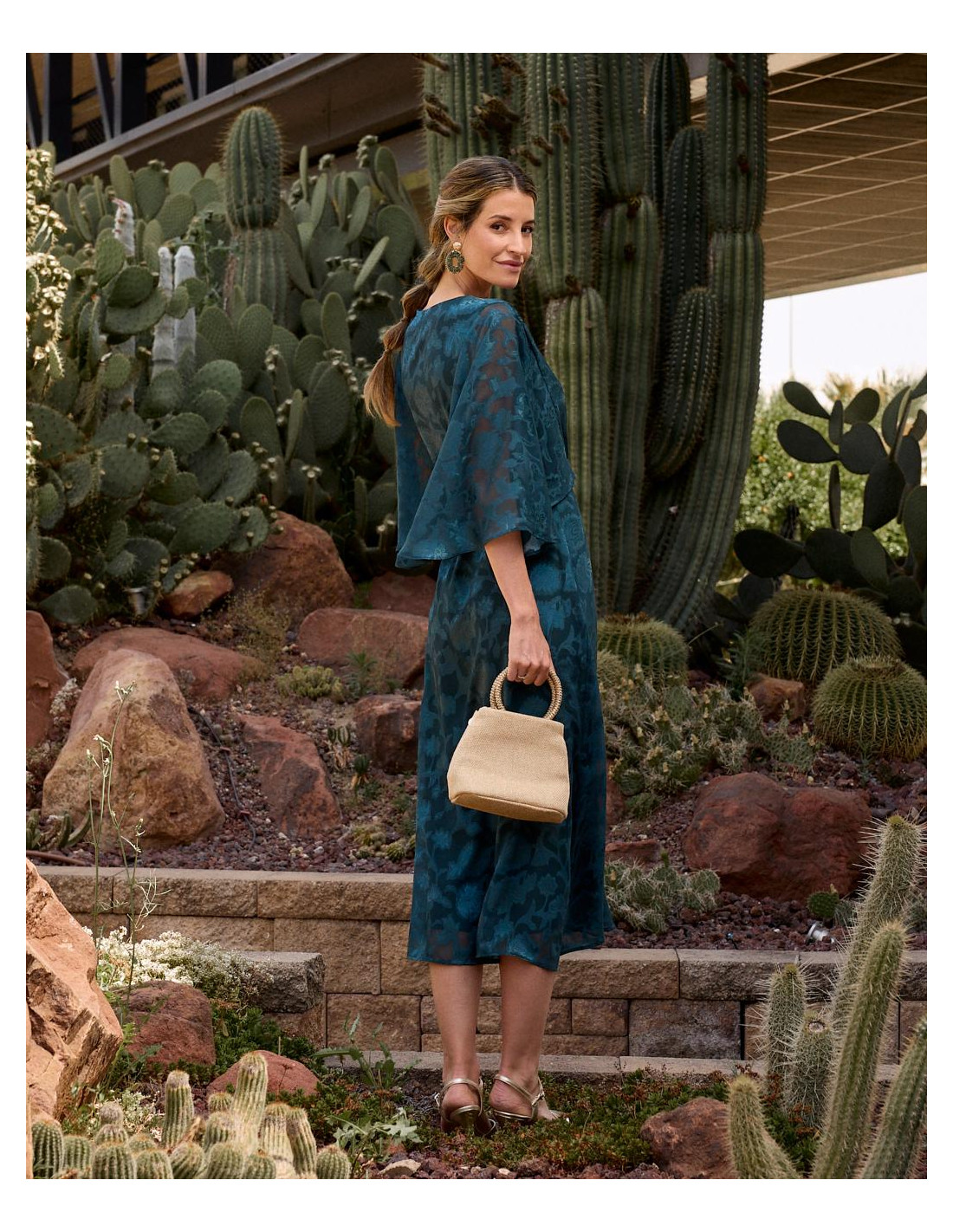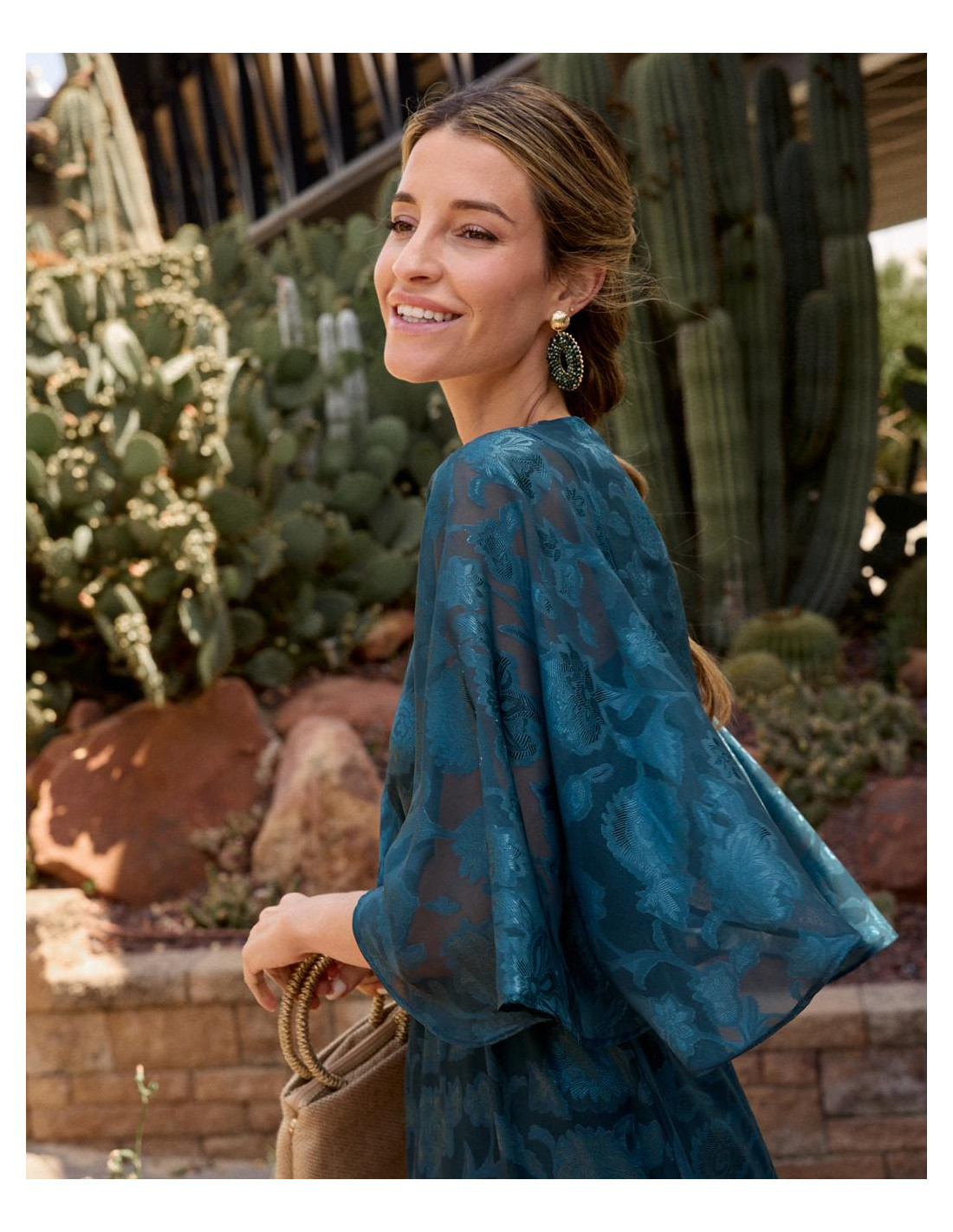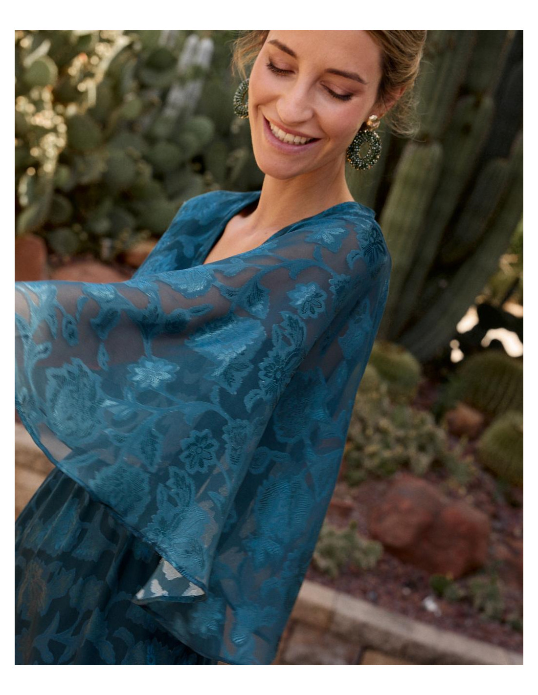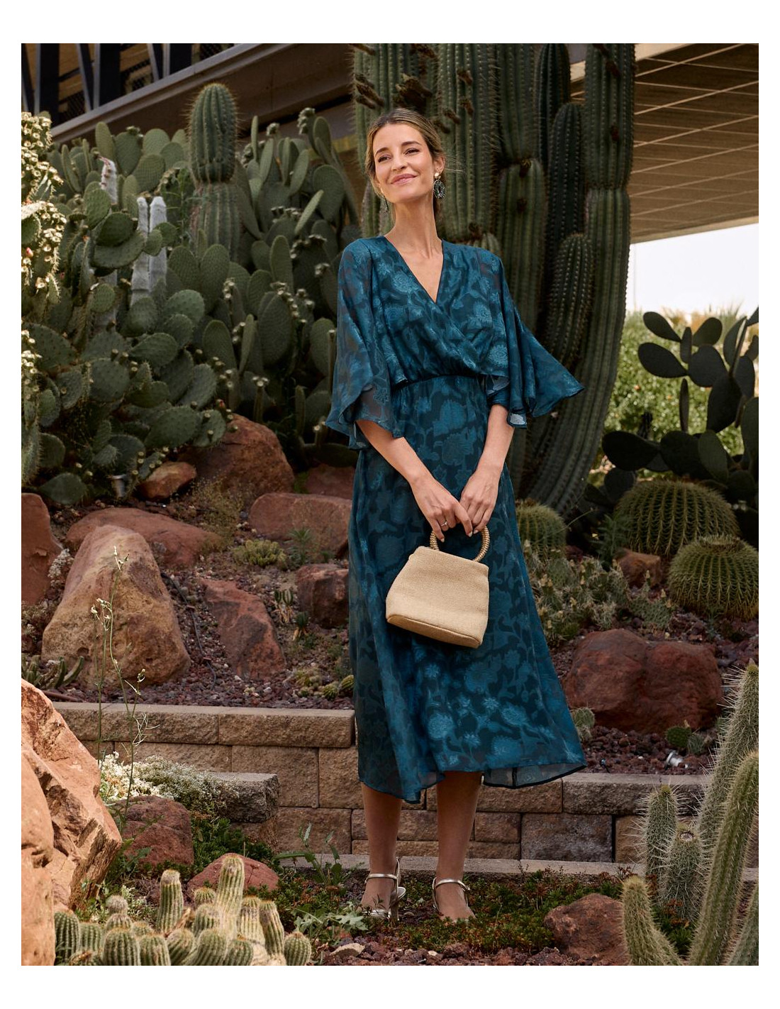 <p><span style="font-size: 10pt; font-family: Arial;">Vestido largo en tono petróleo con tejido jacquard de acabado satinado. Diseño cruzado con escote en pico y manga fluida tipo murciélago. Corte entallado en la cintura y falda con ligera caída. Incluye forro interior.</span></p>