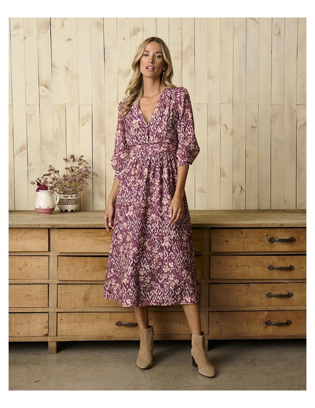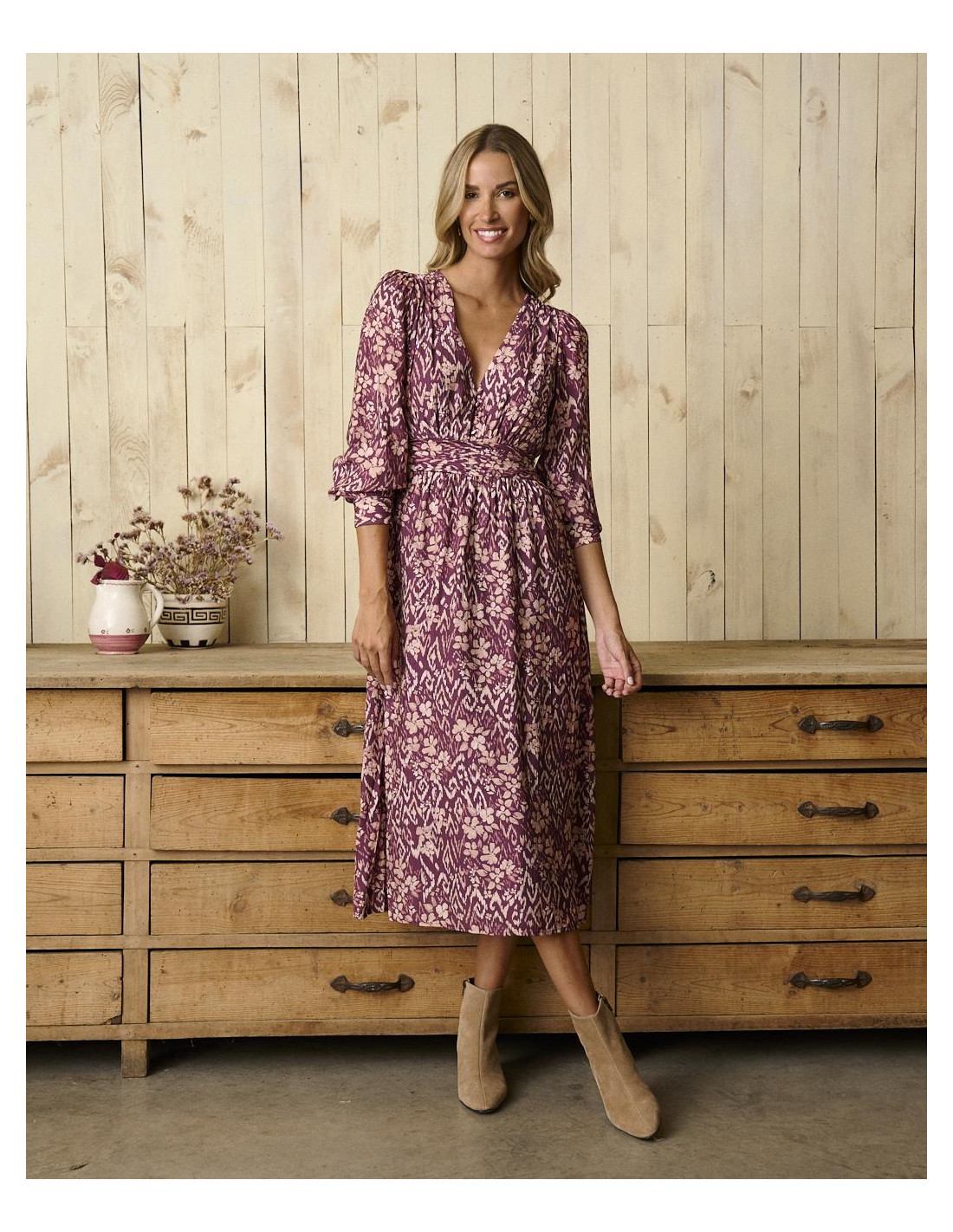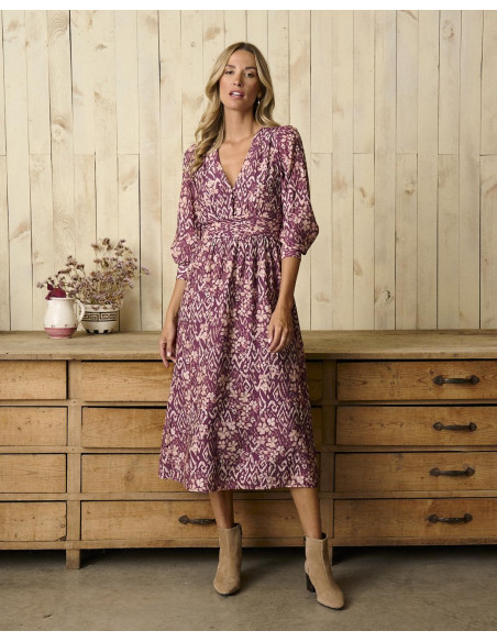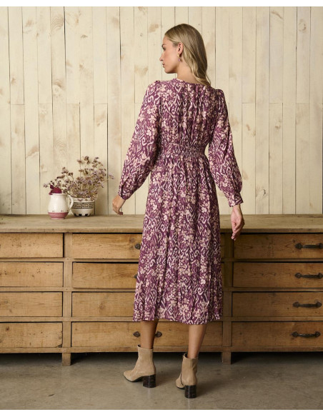 <p><span style="font-size: 10pt; font-family: Arial;">Vestido midi en color buganvilla con estampado, manga larga con frunce en los hombros, escote en V y detalle ajustado en la cintura para realzar la silueta.</span></p>