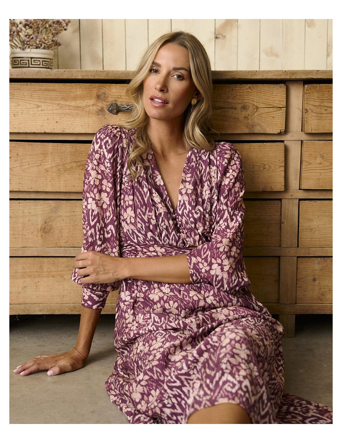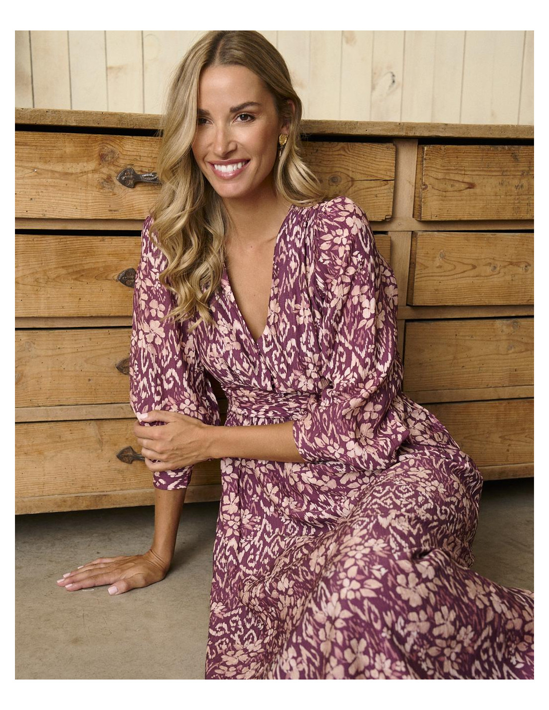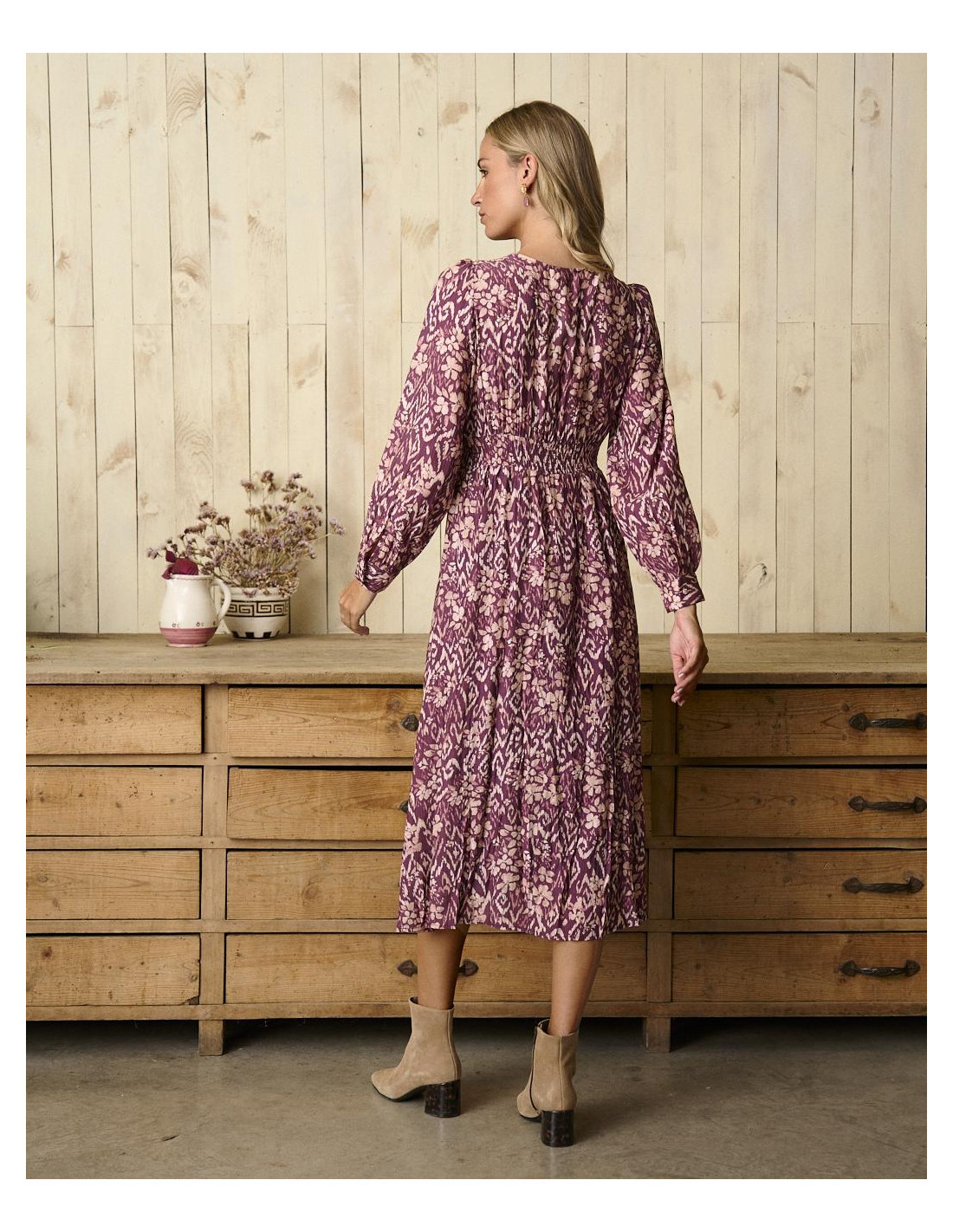 <p><span style="font-size: 10pt; font-family: Arial;">Vestido midi en color buganvilla con estampado, manga larga con frunce en los hombros, escote en V y detalle ajustado en la cintura para realzar la silueta.</span></p>
