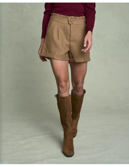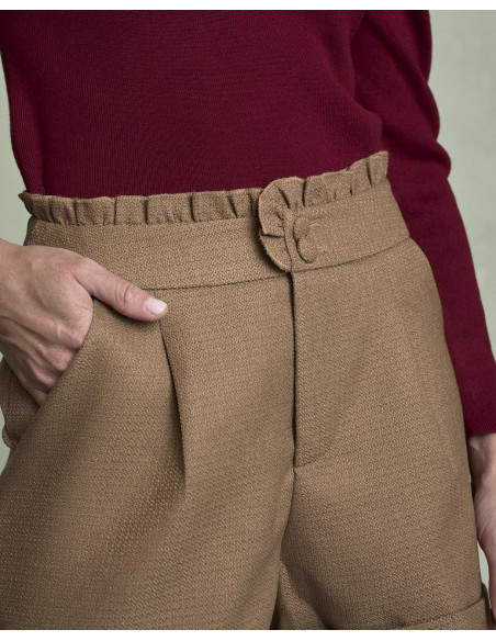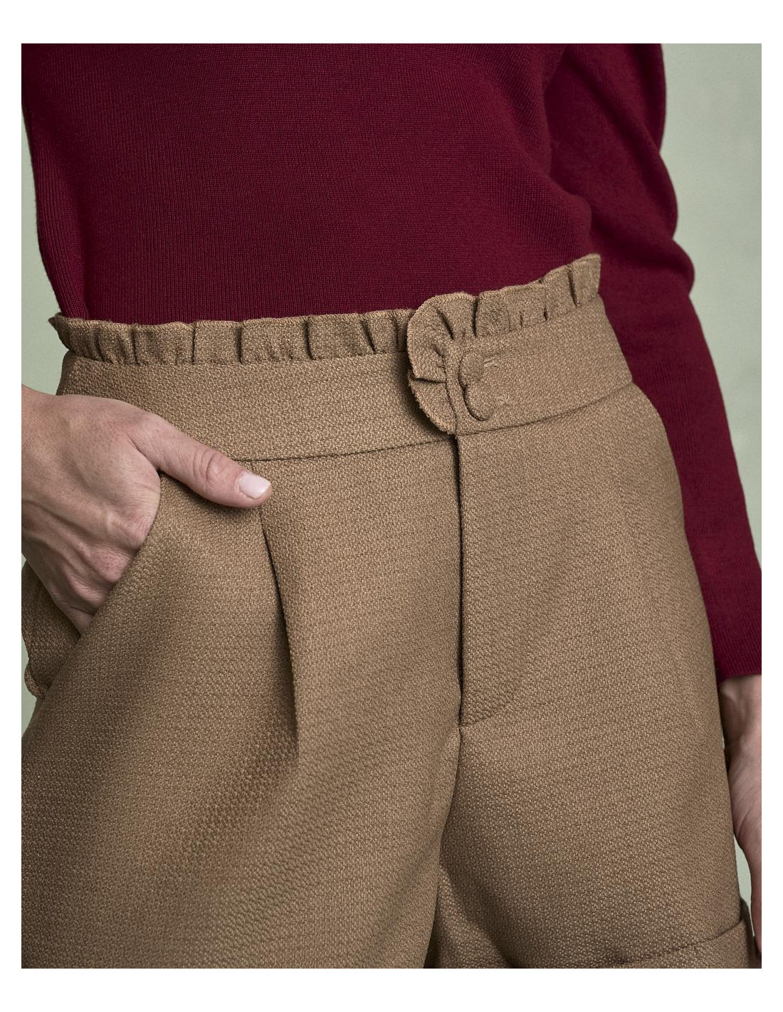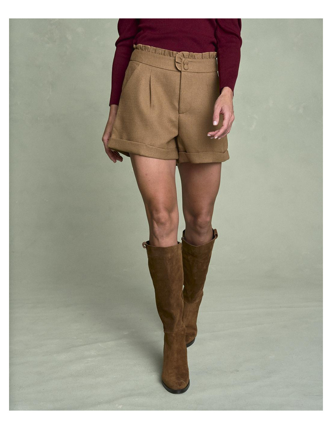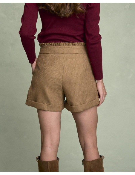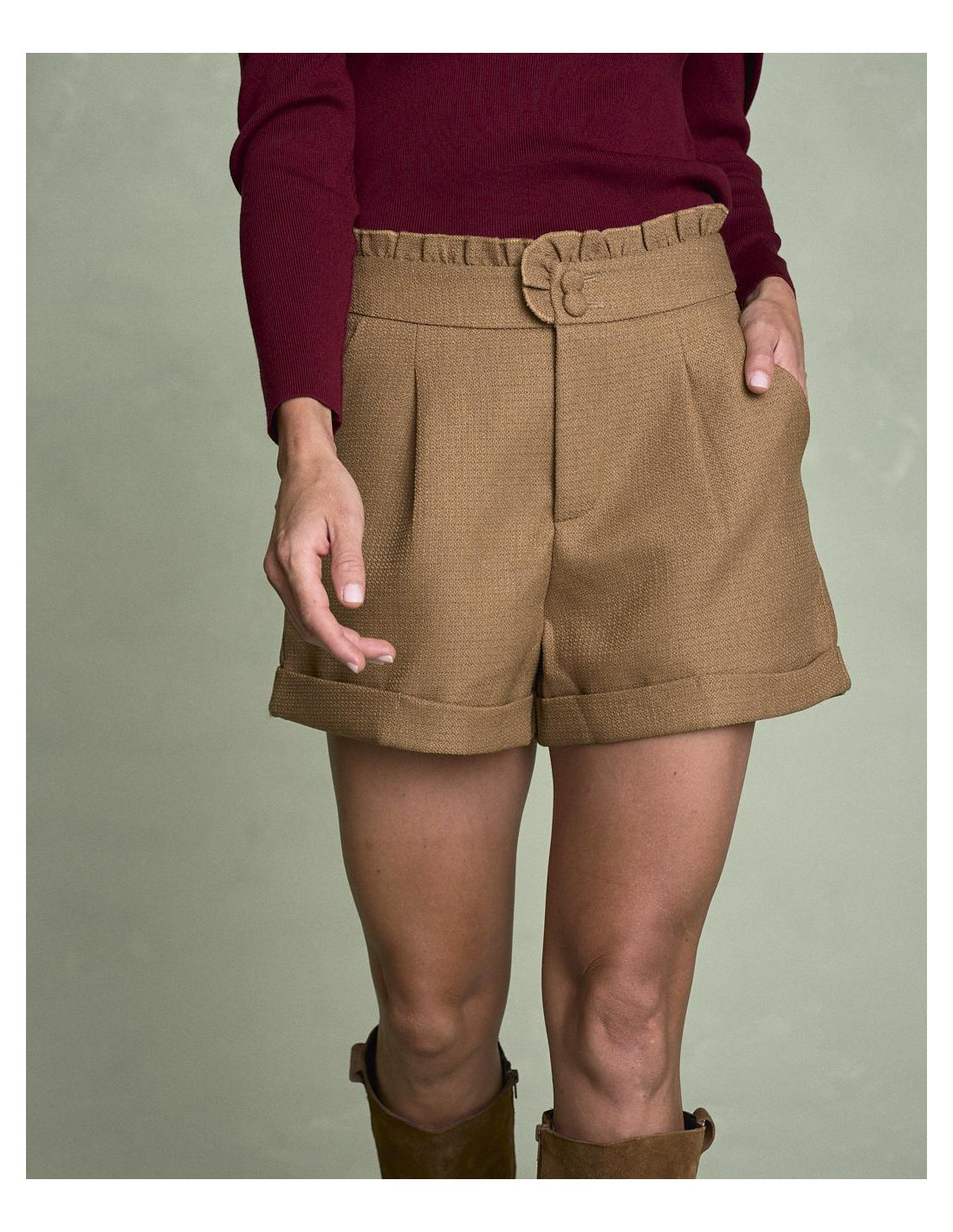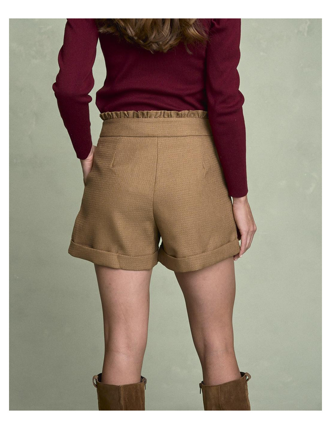 <p><span style="font-size: 10pt; font-family: Arial;">Shorts en color camel con detalle de volante en la cintura, tiro alto con cierre frontal de botón y cremallera, bolsillos laterales y bajo con vuelta para un acabado más cuidado.</span></p>