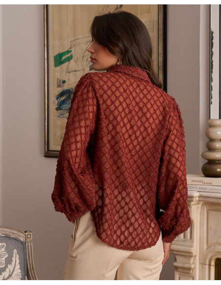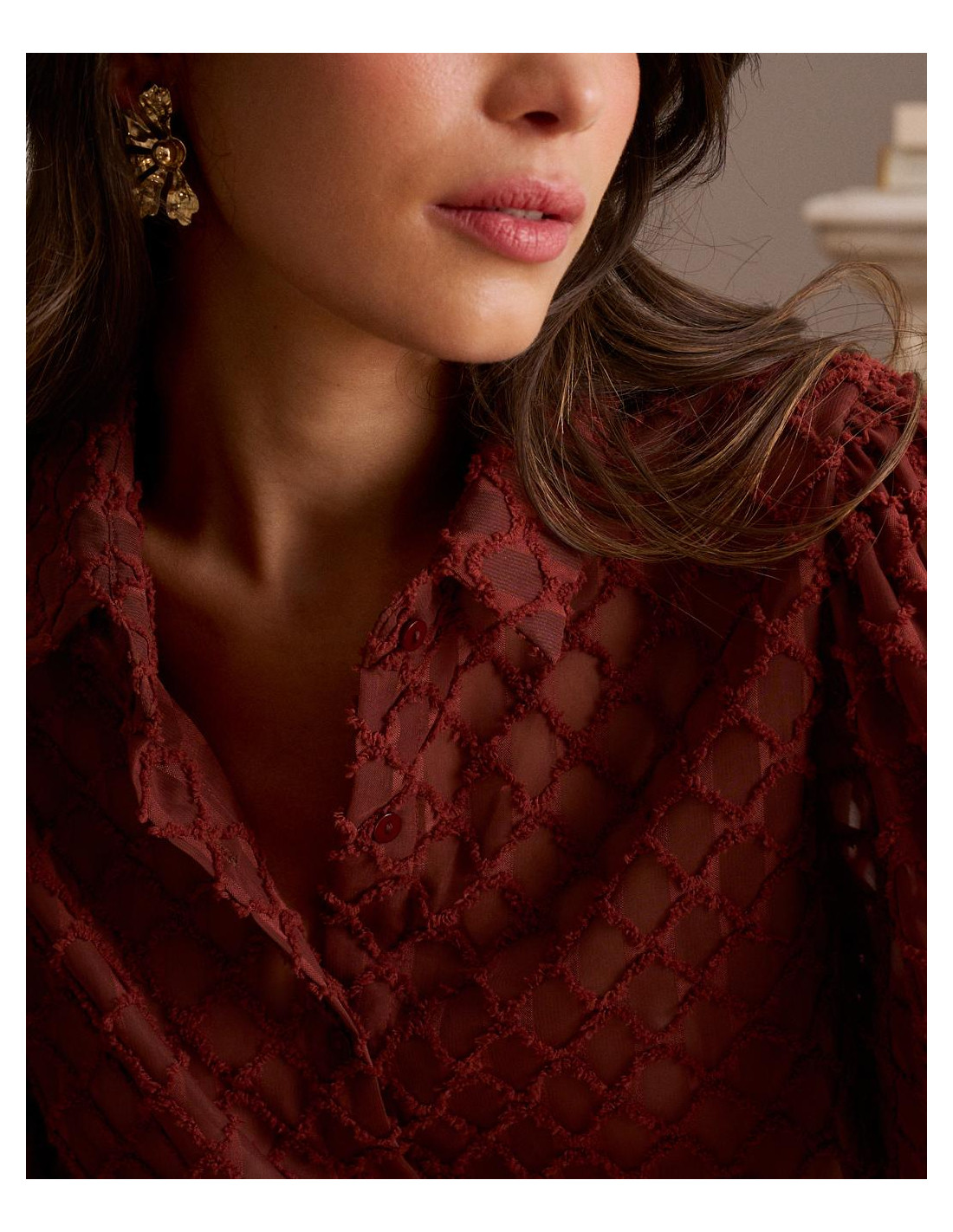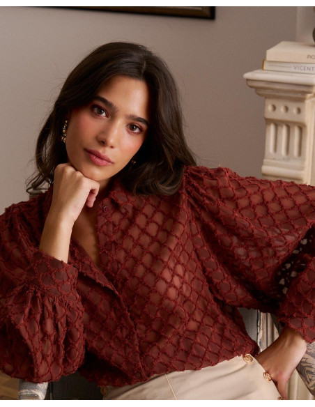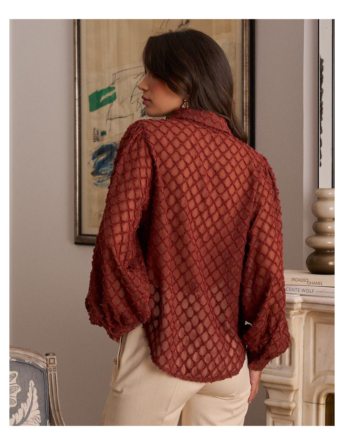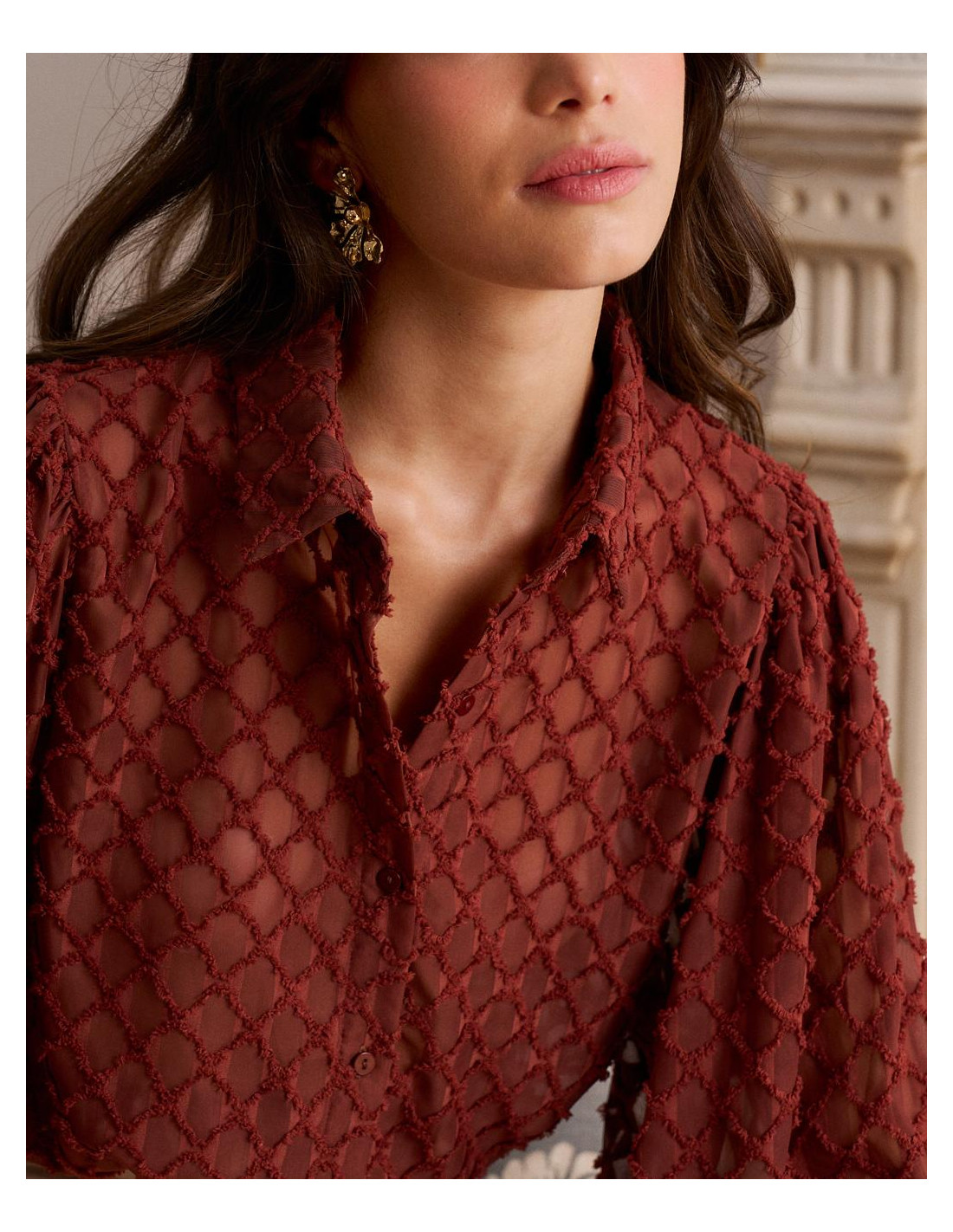 <p><span style="font-size: 10pt; font-family: Arial;">Camisa semitransparente en color teja, con un elegante diseño de rombos. El cuello es clásico y cuenta con botones a tono en la parte delantera. Sus mangas son abullonadas, acabadas en puño con cierre de botones.</span></p>