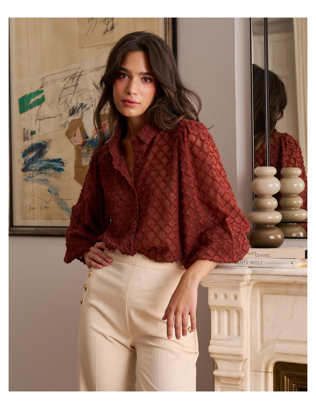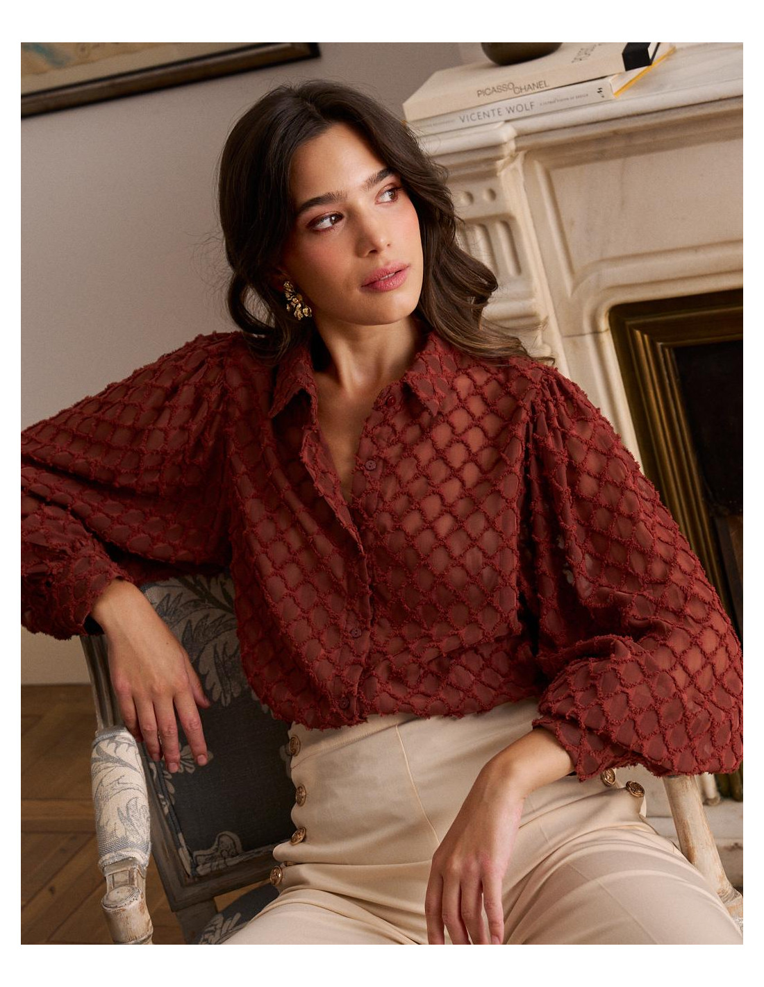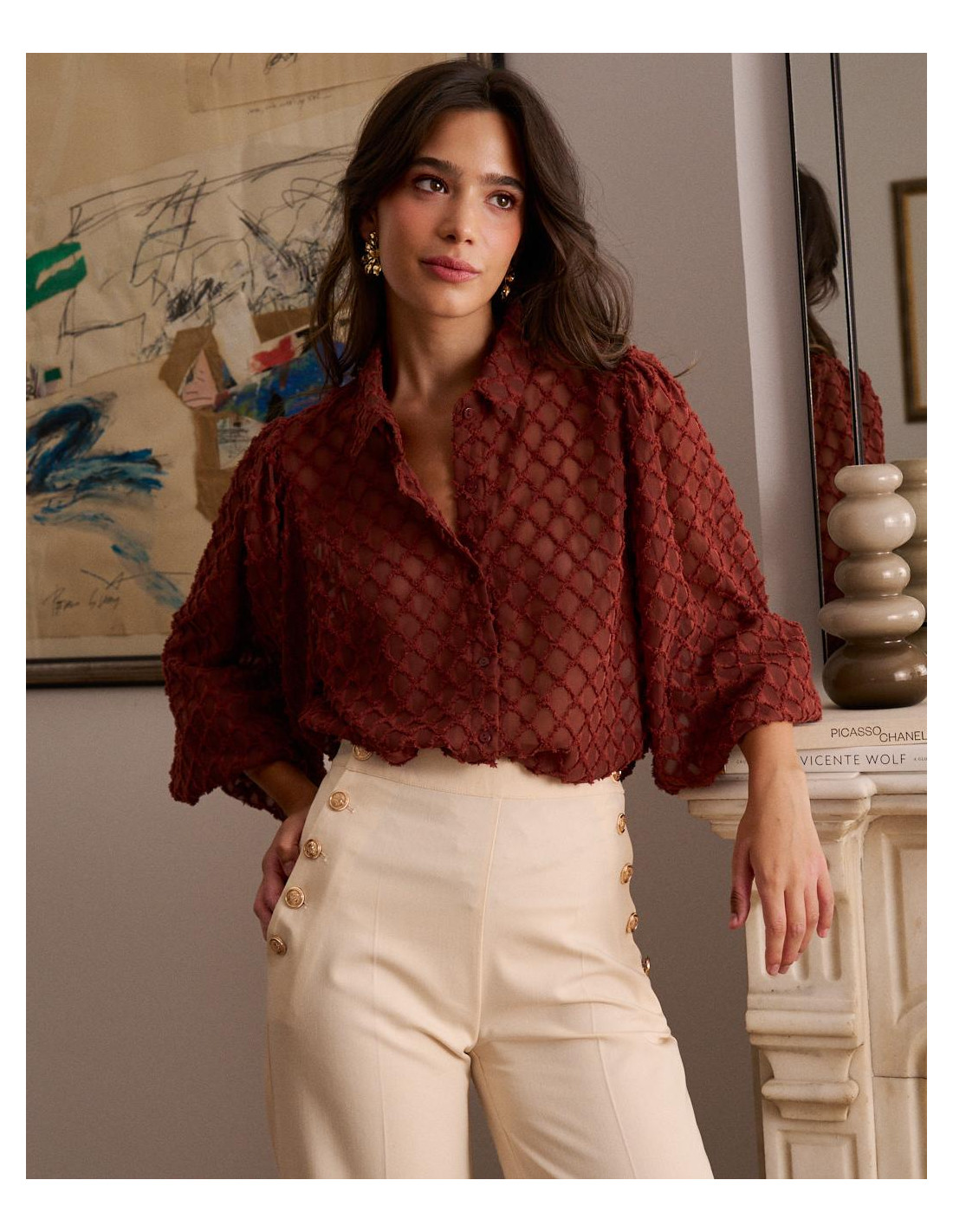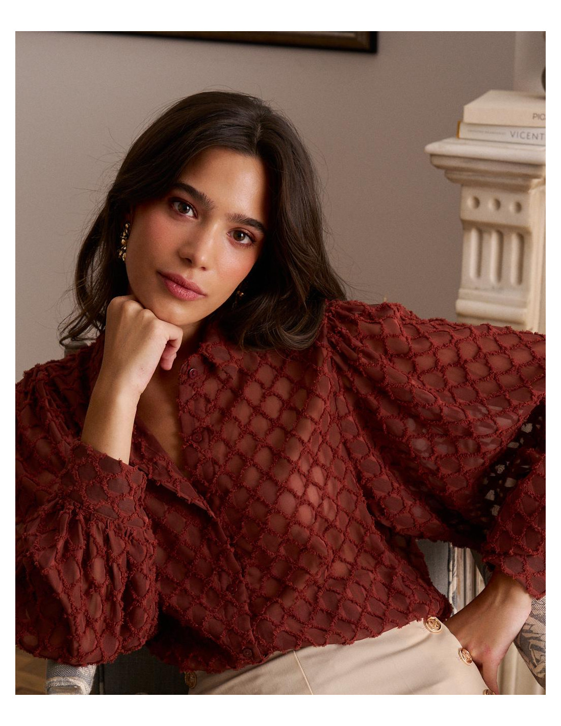 <p><span style="font-size: 10pt; font-family: Arial;">Camisa semitransparente en color teja, con un elegante diseño de rombos. El cuello es clásico y cuenta con botones a tono en la parte delantera. Sus mangas son abullonadas, acabadas en puño con cierre de botones.</span></p>