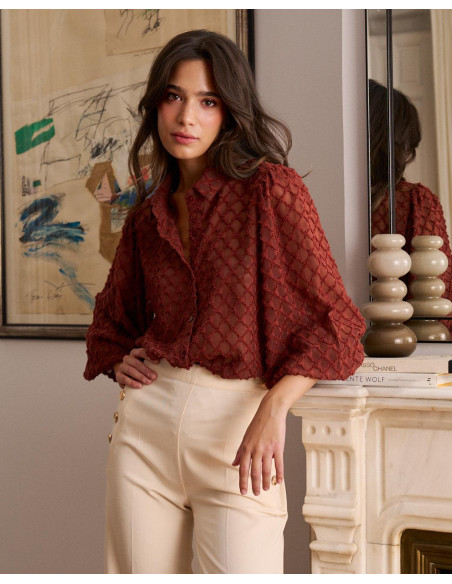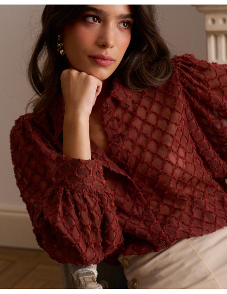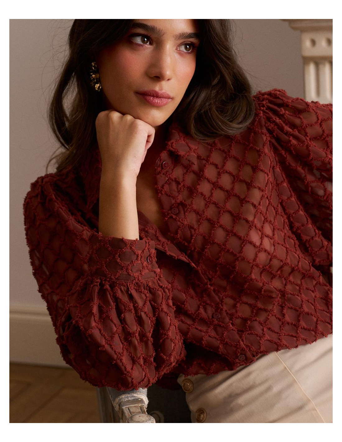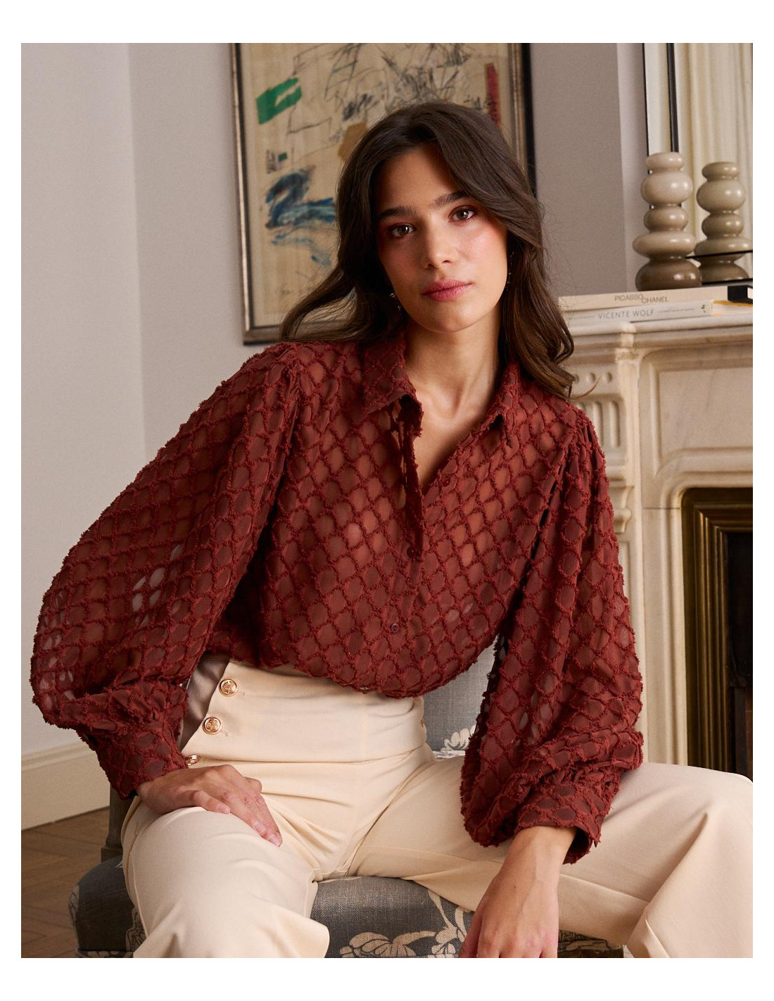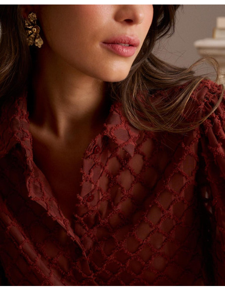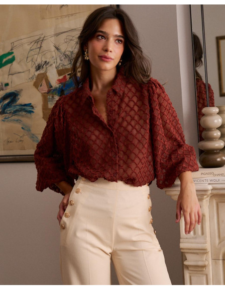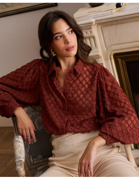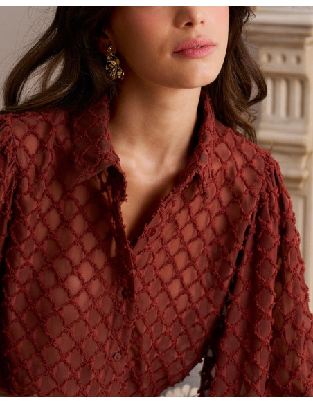<p><span style="font-size: 10pt; font-family: Arial;">Camisa semitransparente en color teja, con un elegante diseño de rombos. El cuello es clásico y cuenta con botones a tono en la parte delantera. Sus mangas son abullonadas, acabadas en puño con cierre de botones.</span></p>