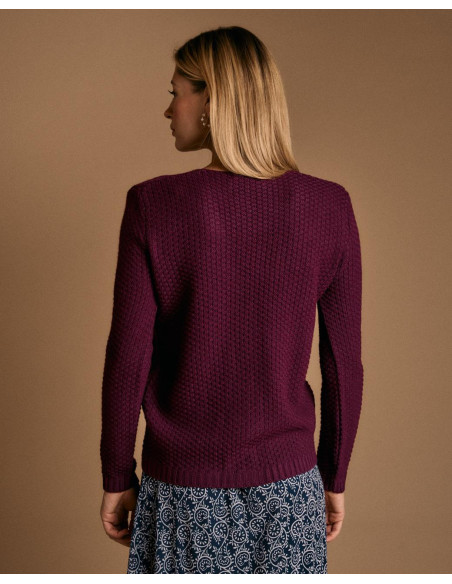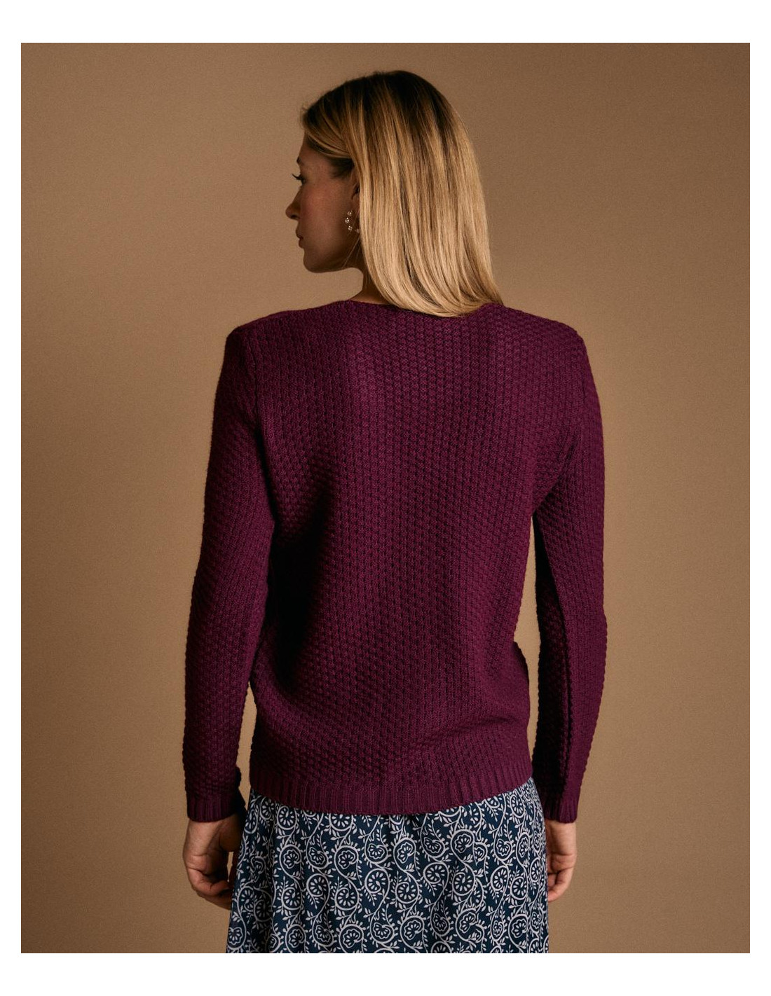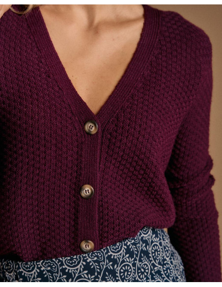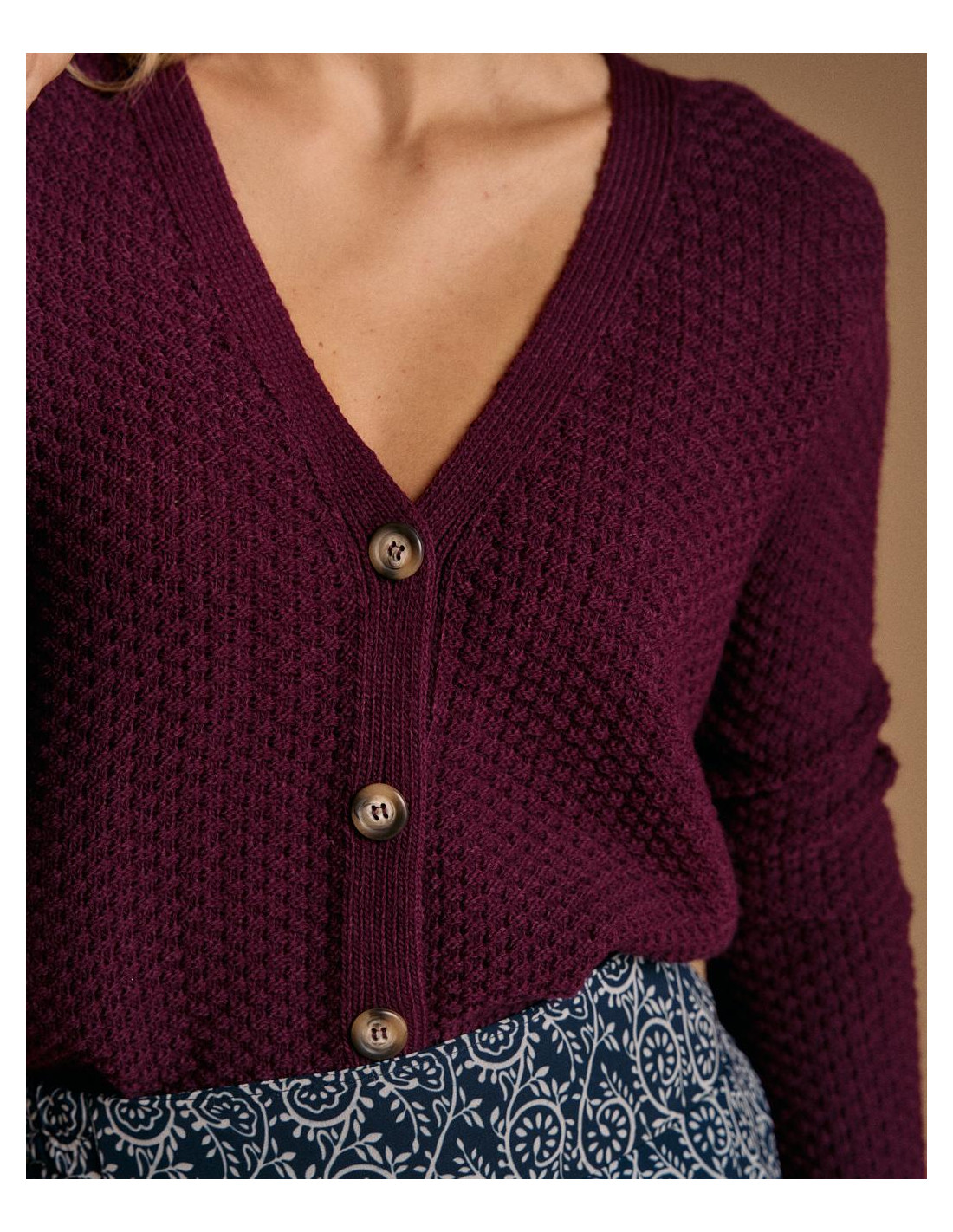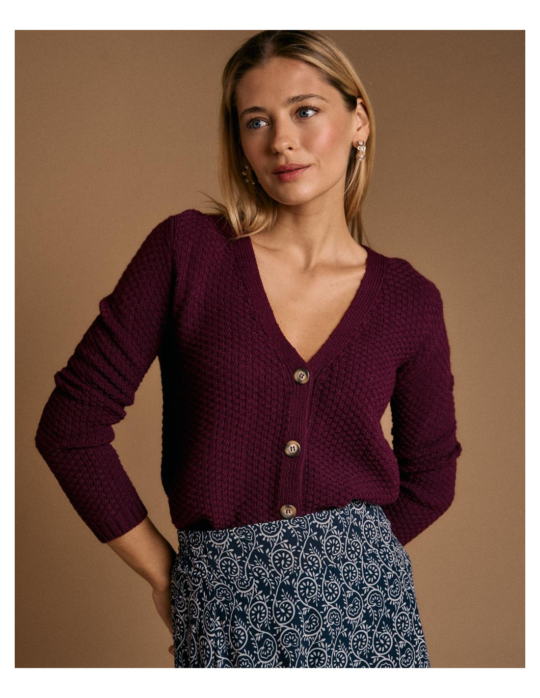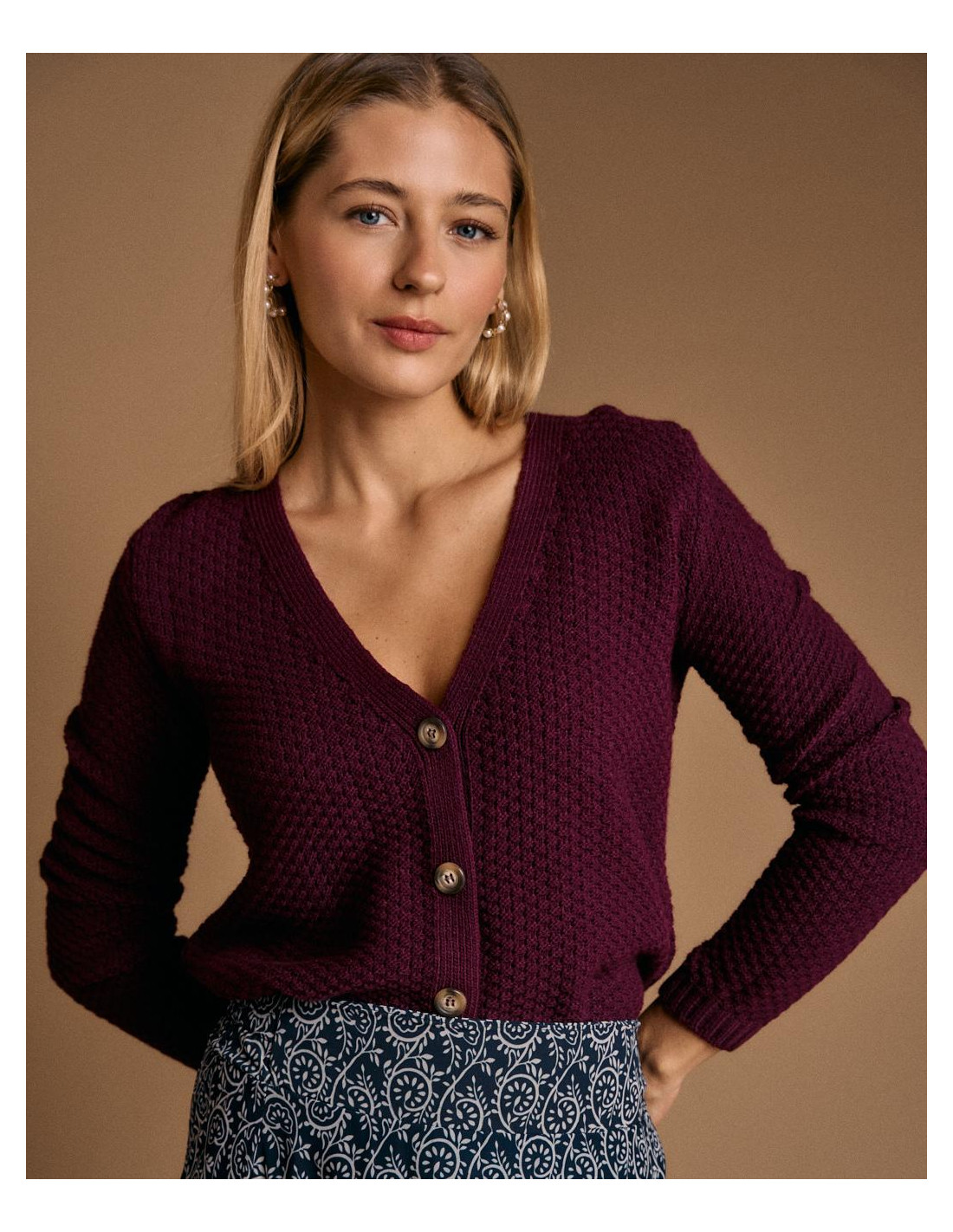 <p><span style="font-size: 10pt; font-family: Arial;">Cárdigan en color berenjena. Diseño de punto con cierre de botones en la parte delantera y escote en pico.</span></p> <p><span style="font-size: 10pt; font-family: Arial;">Una prenda versátil y cómoda, ideal para completar tus conjuntos de temporada.</span></p> <p><span style="font-size: 10pt; font-family: Arial;">Diseñado y fabricado en España.</span></p>