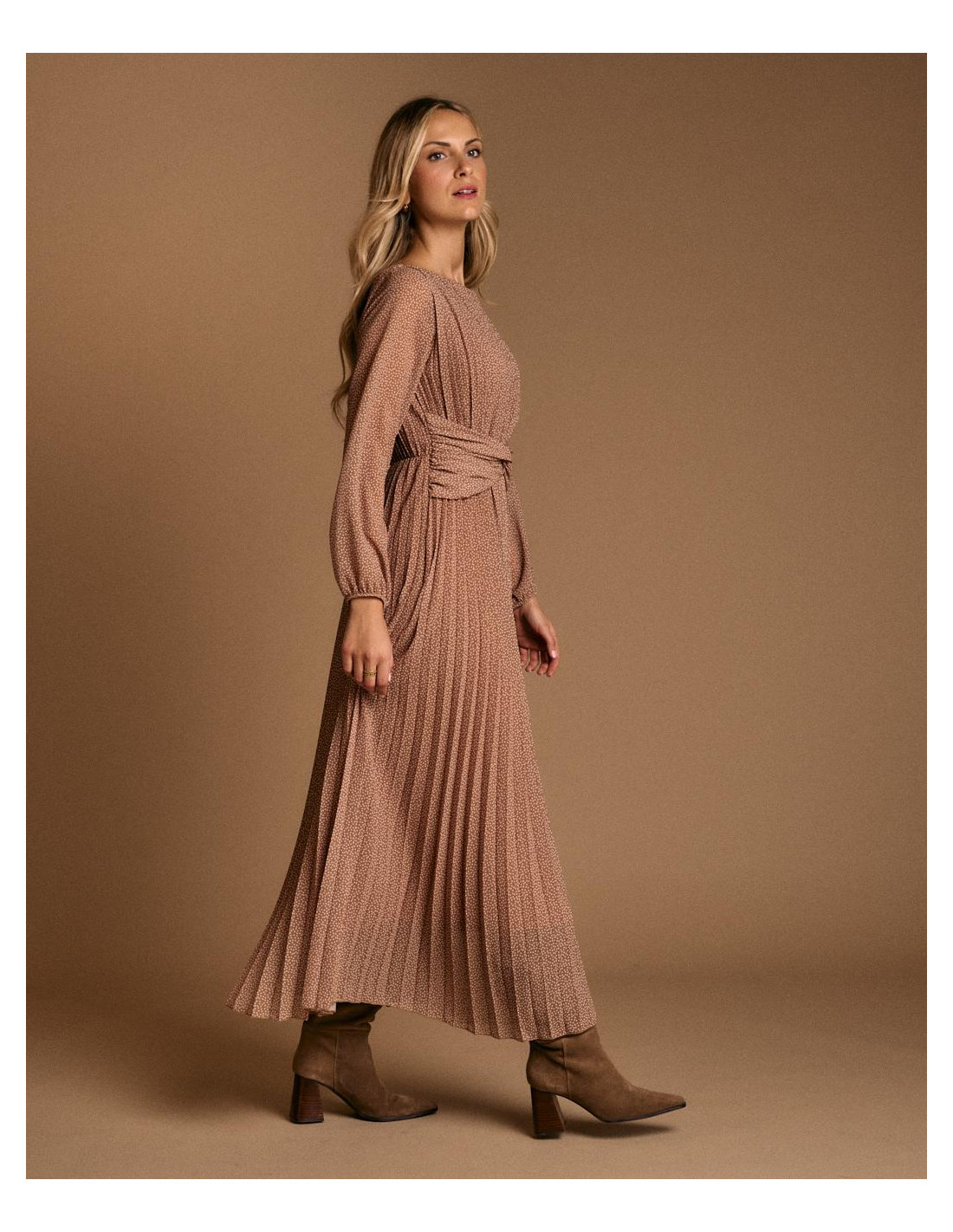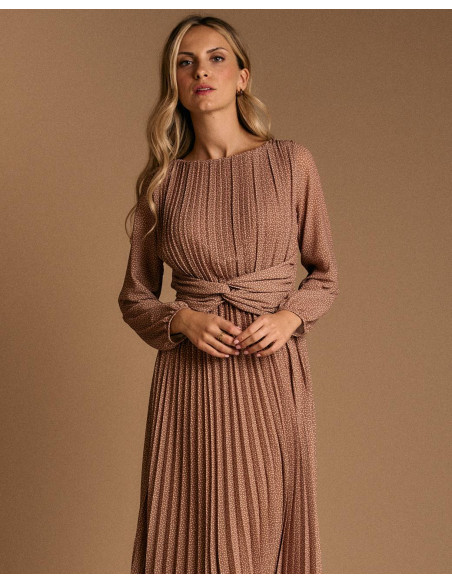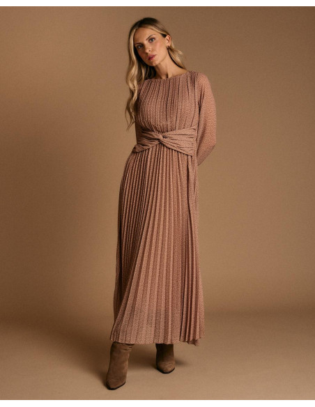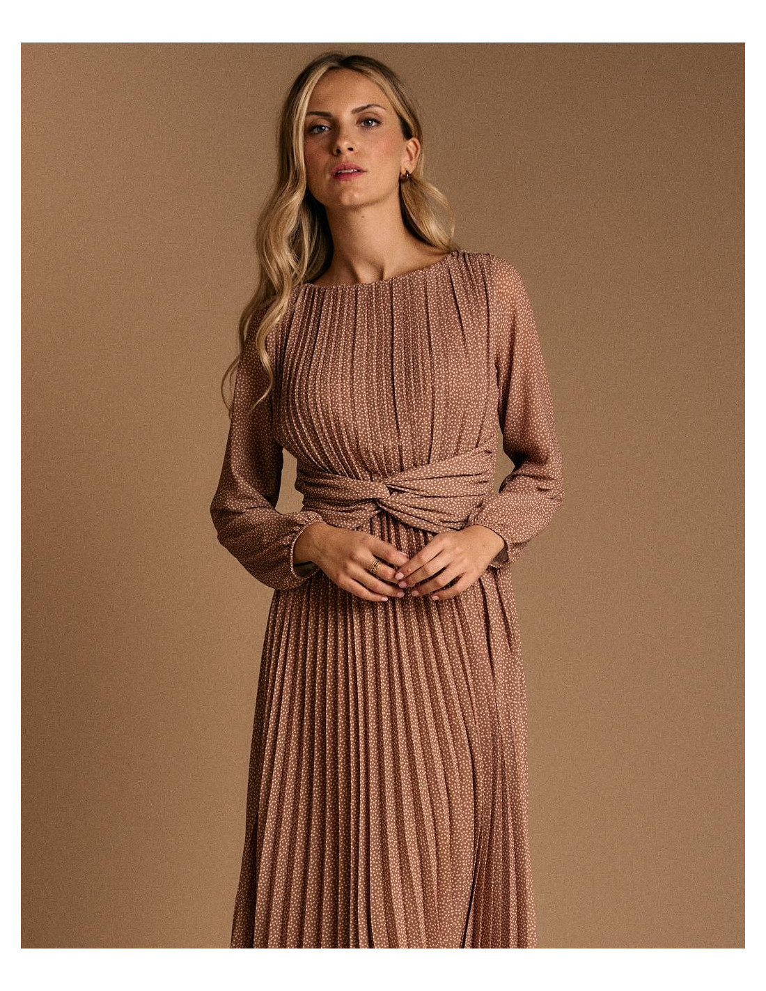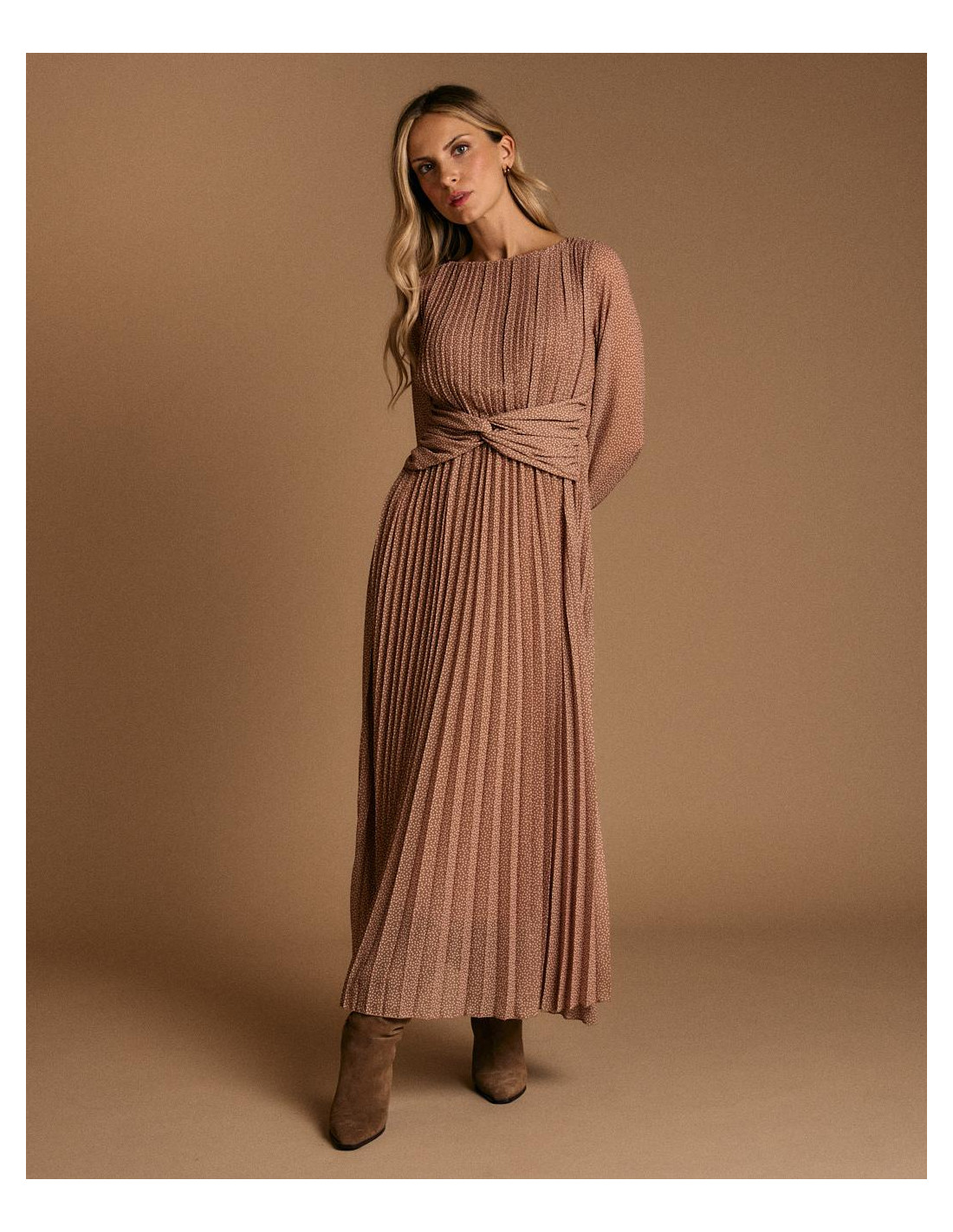 <p><span style="font-size: 10pt; font-family: Arial;">Vestido plisado en color ocre. Diseño con escote redondeado, manga larga y detalle de nudo en la parte delantera que realza la figura.</span></p>