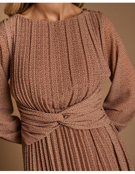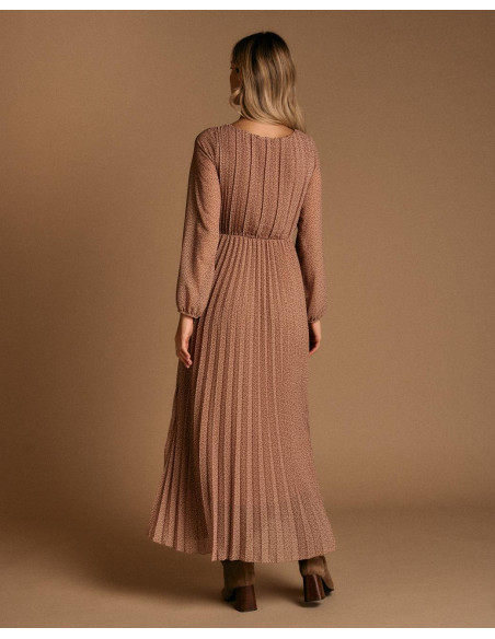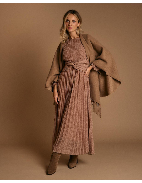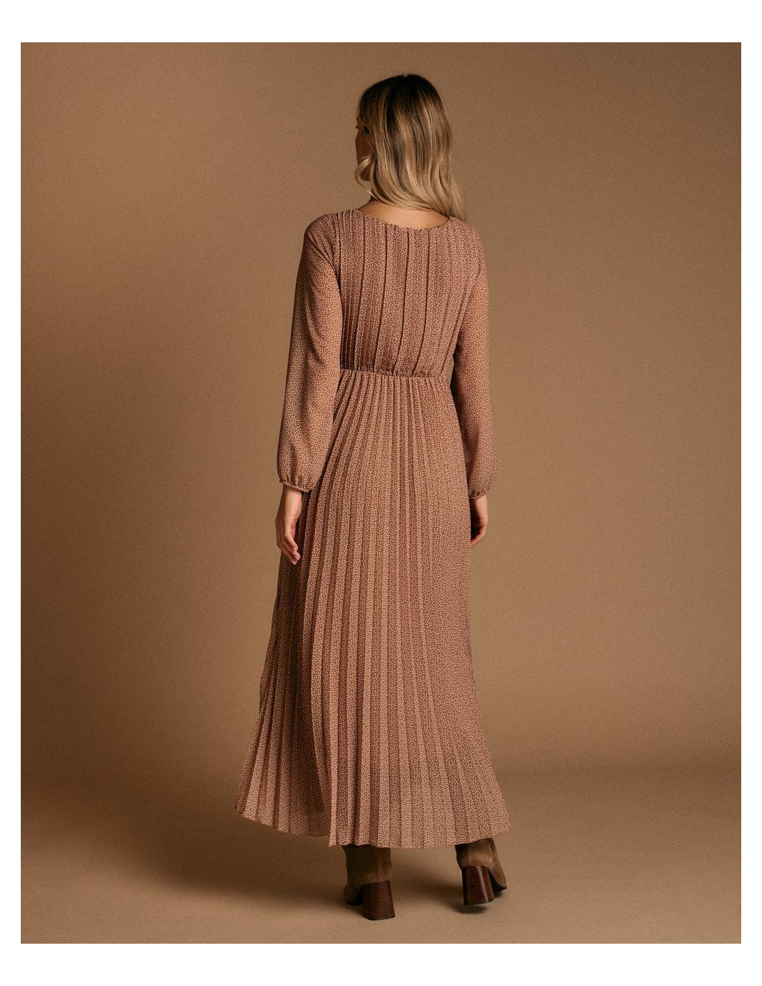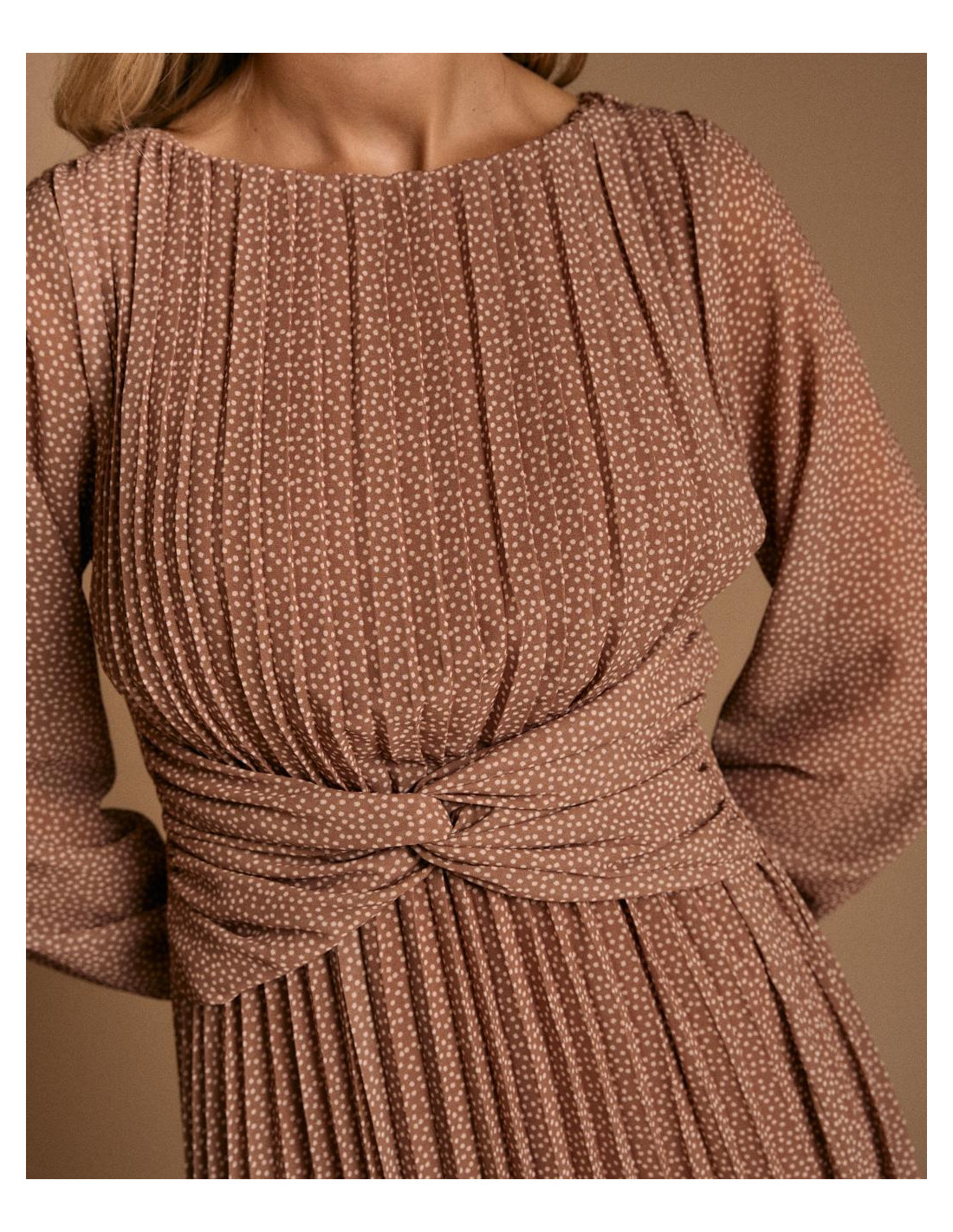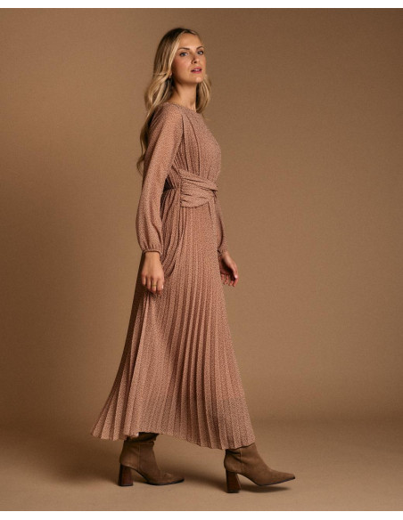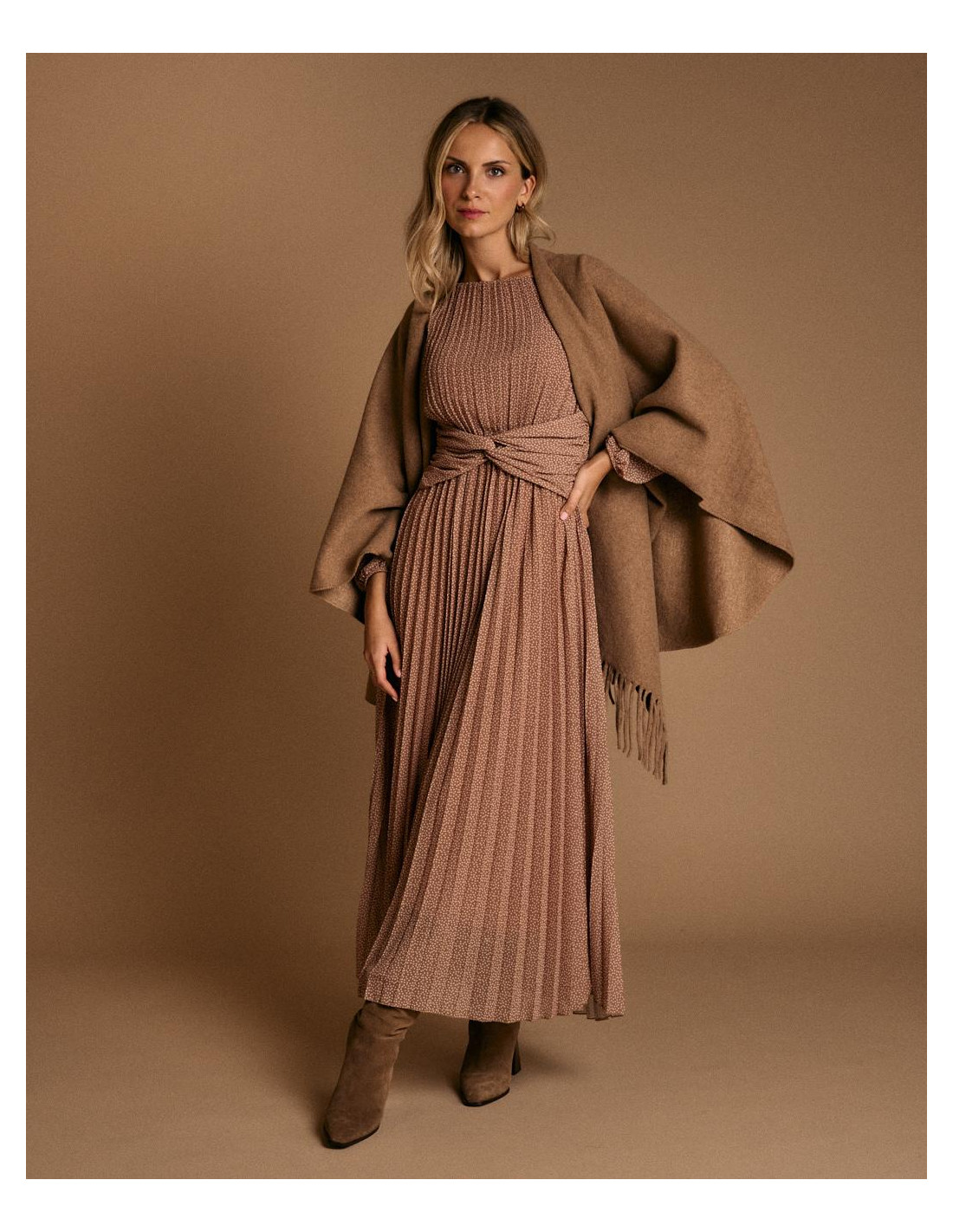 <p><span style="font-size: 10pt; font-family: Arial;">Vestido plisado en color ocre. Diseño con escote redondeado, manga larga y detalle de nudo en la parte delantera que realza la figura.</span></p>