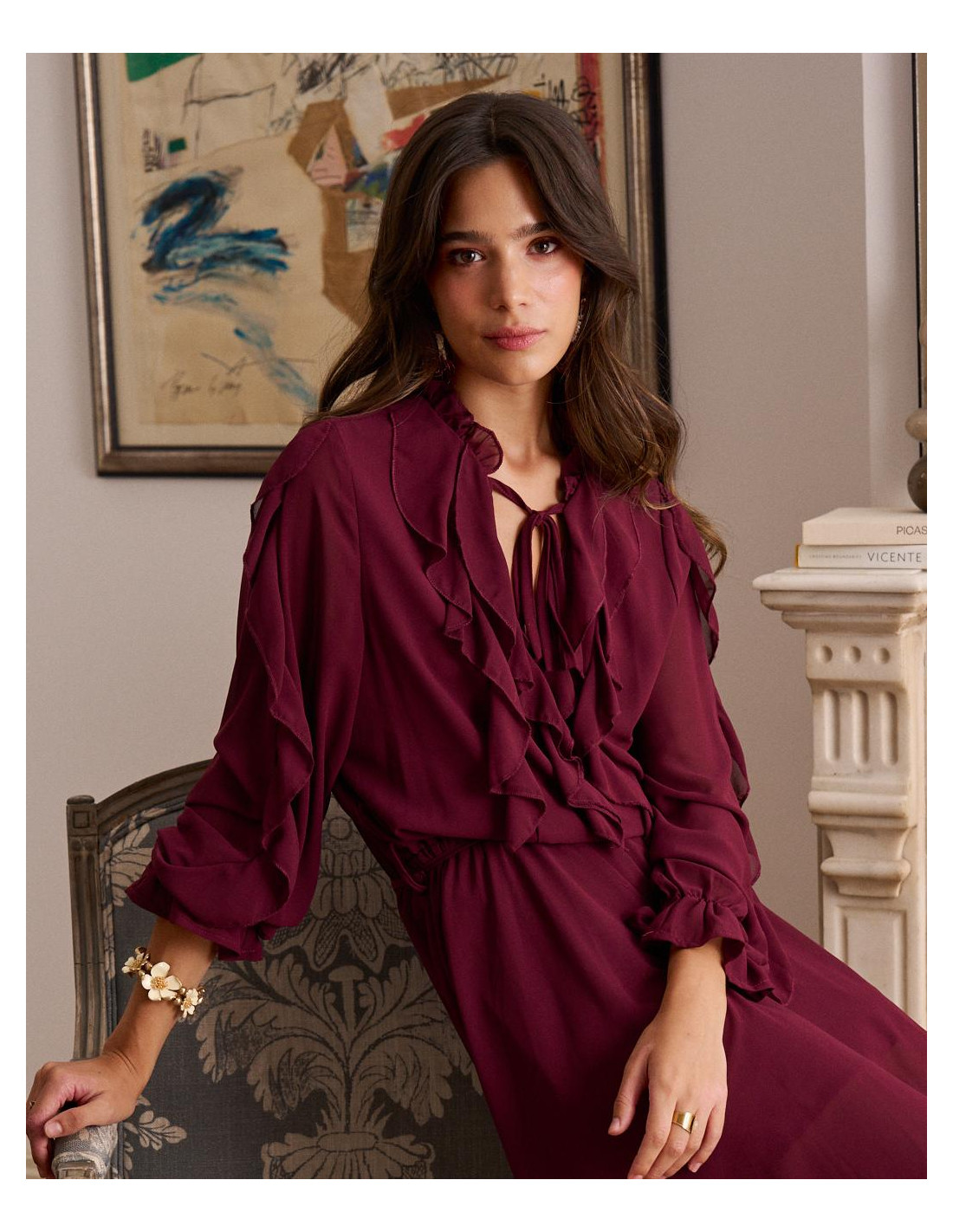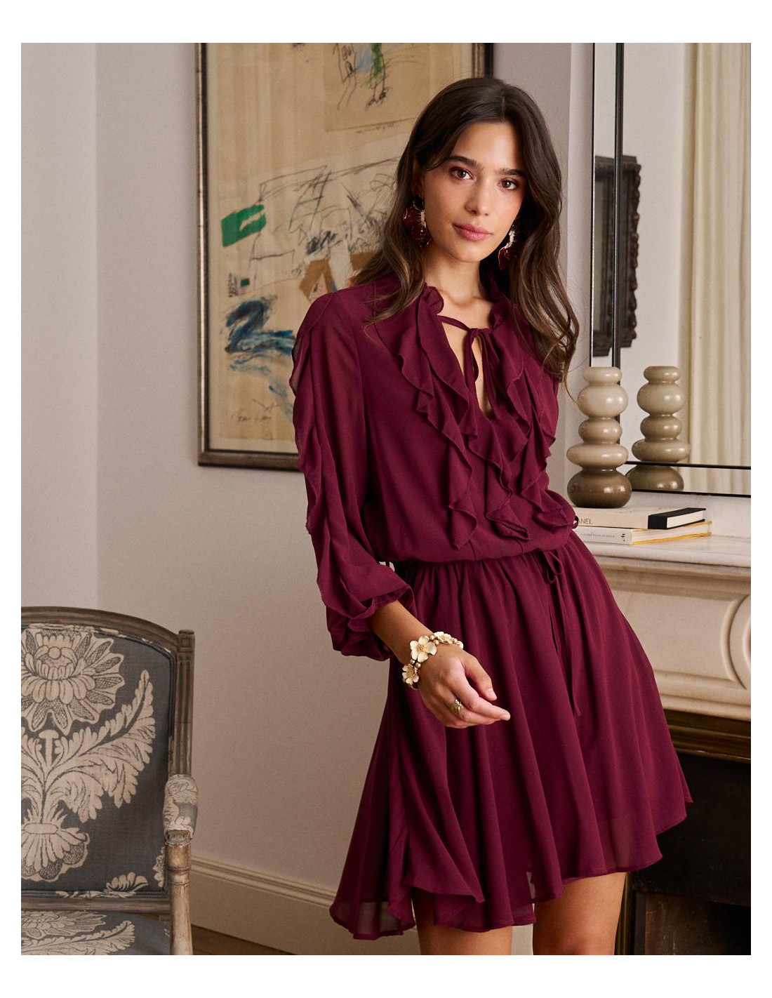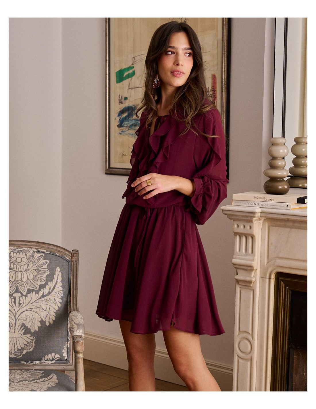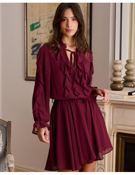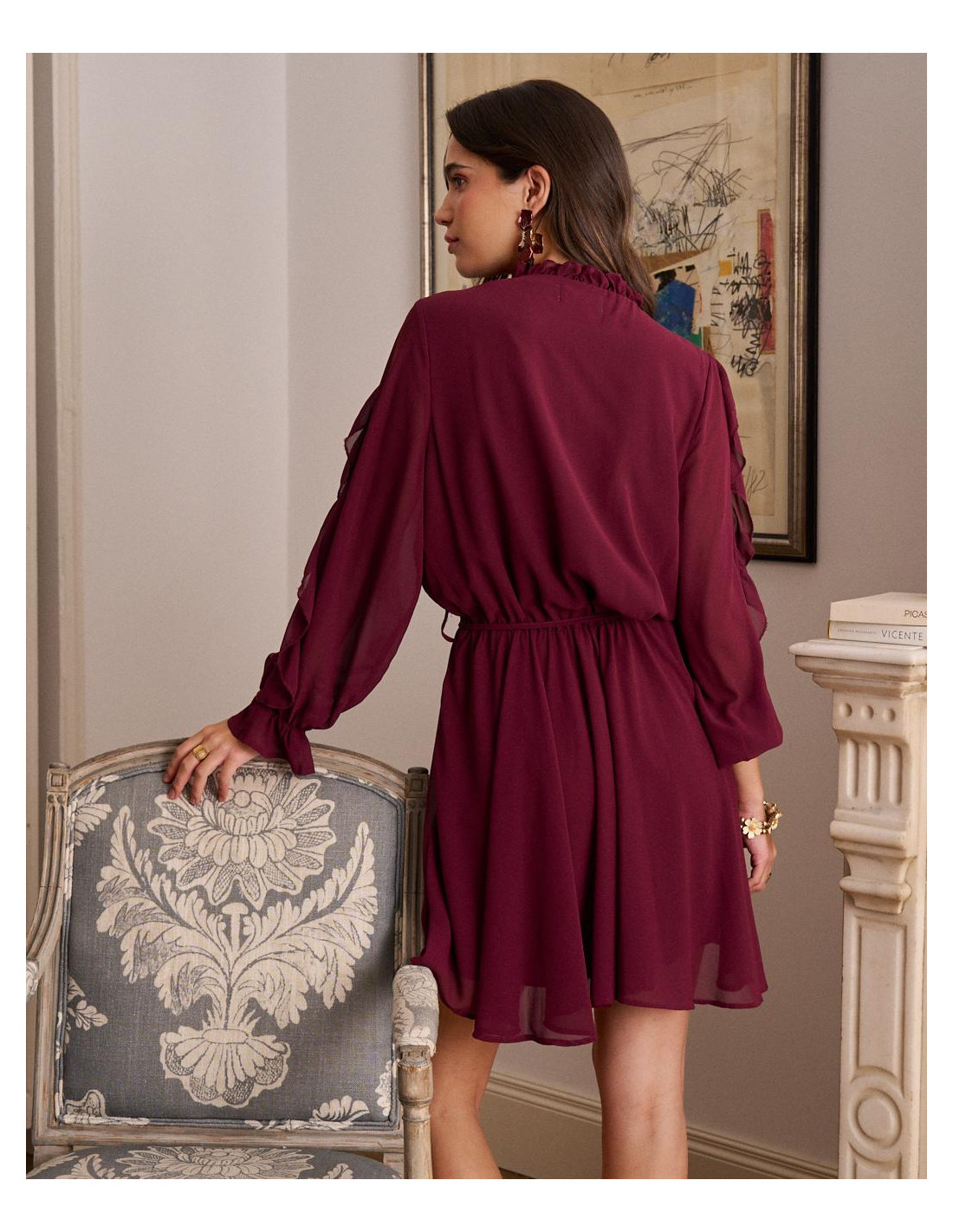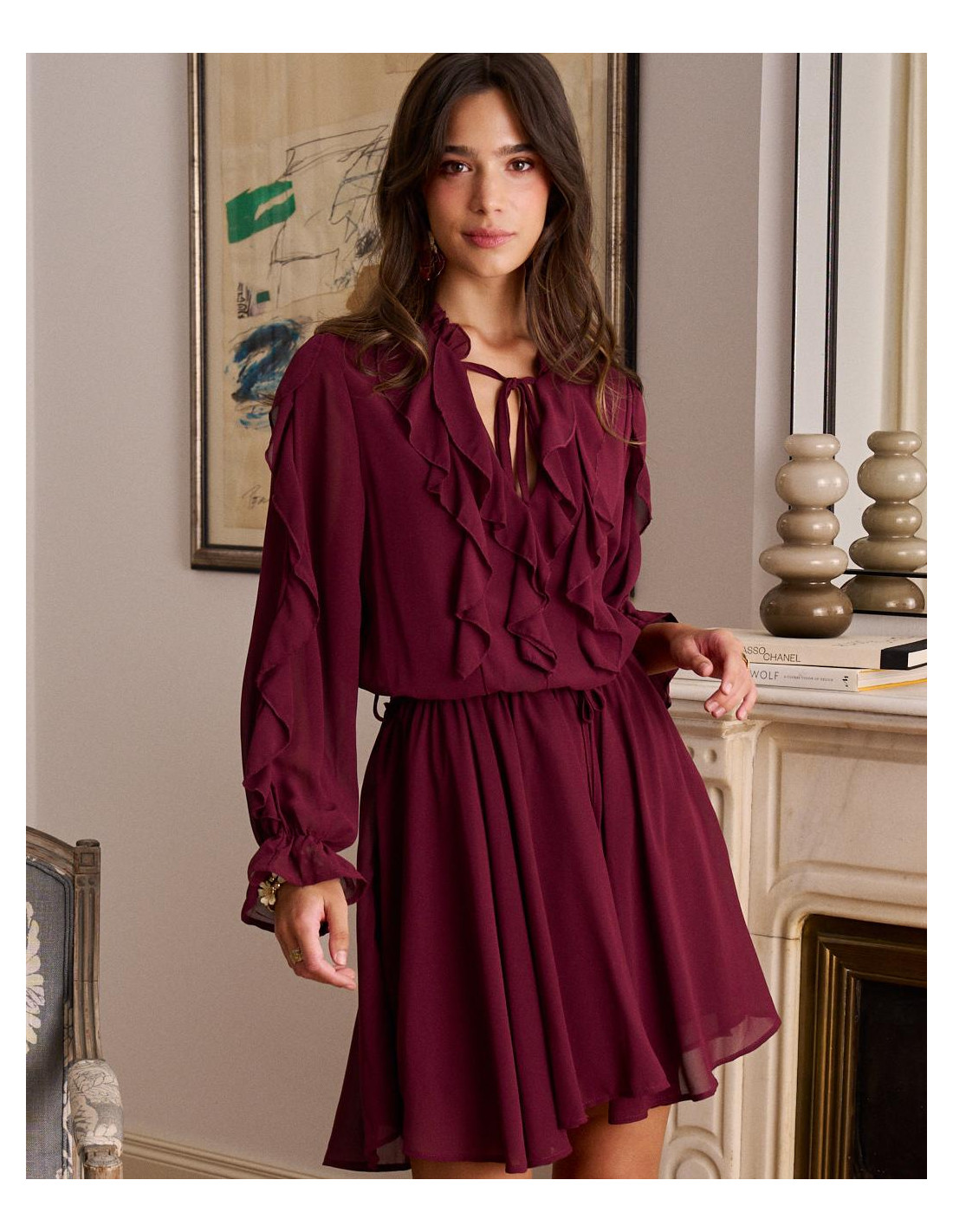 <p><span style="font-size: 10pt; font-family: Arial;">Vestido corto de color burdeos, con un elegante cuello en pico adornado con volantes. El vestido tiene una cintura de nido de abeja para un ajuste perfecto y la falda tiene un diseño de volante.</span></p>