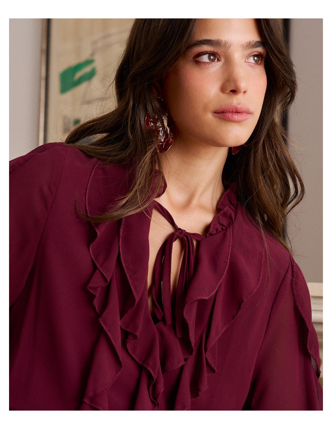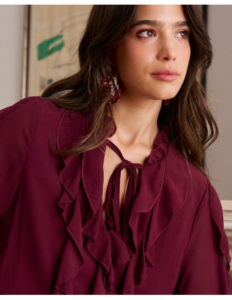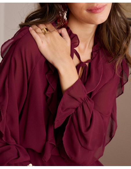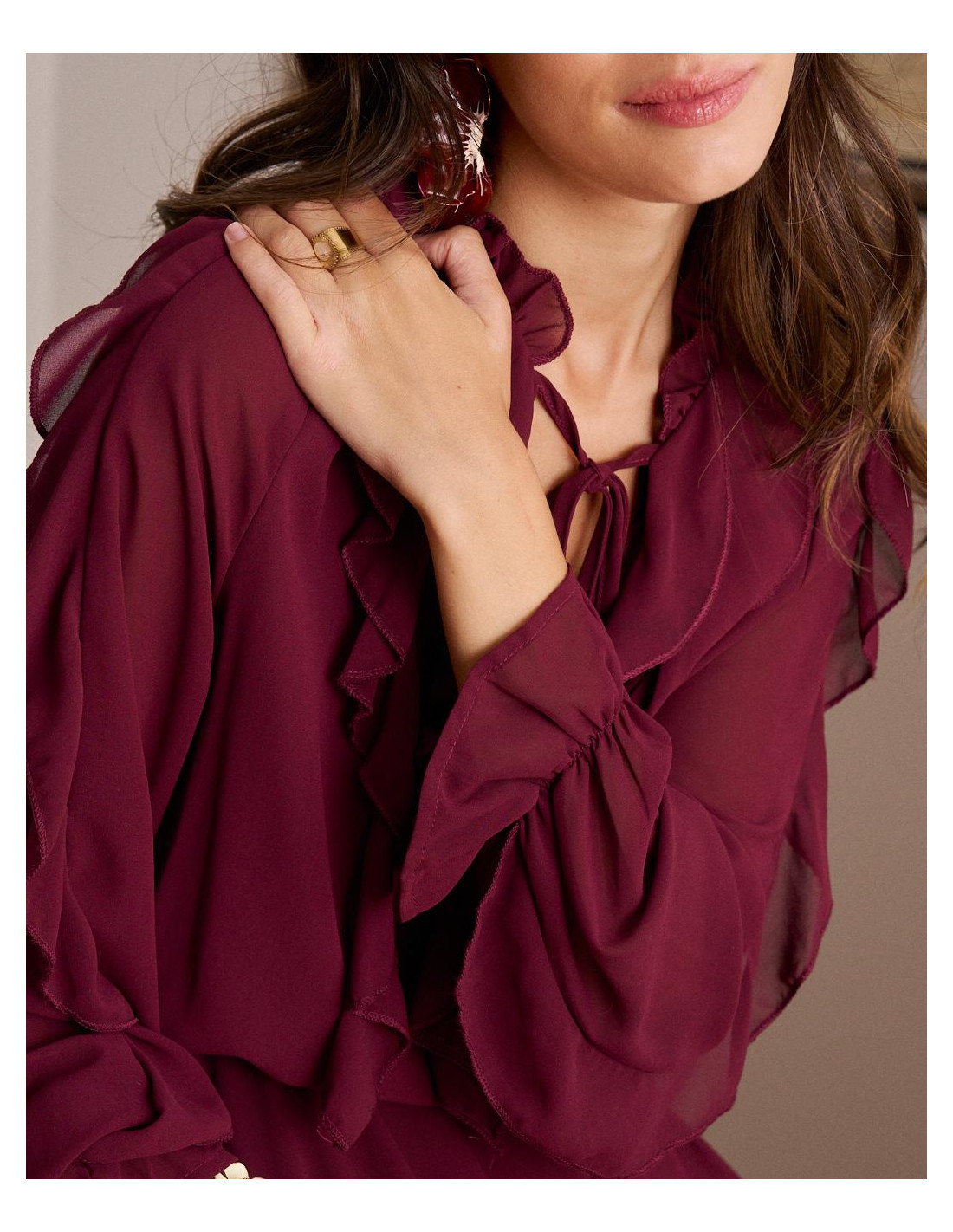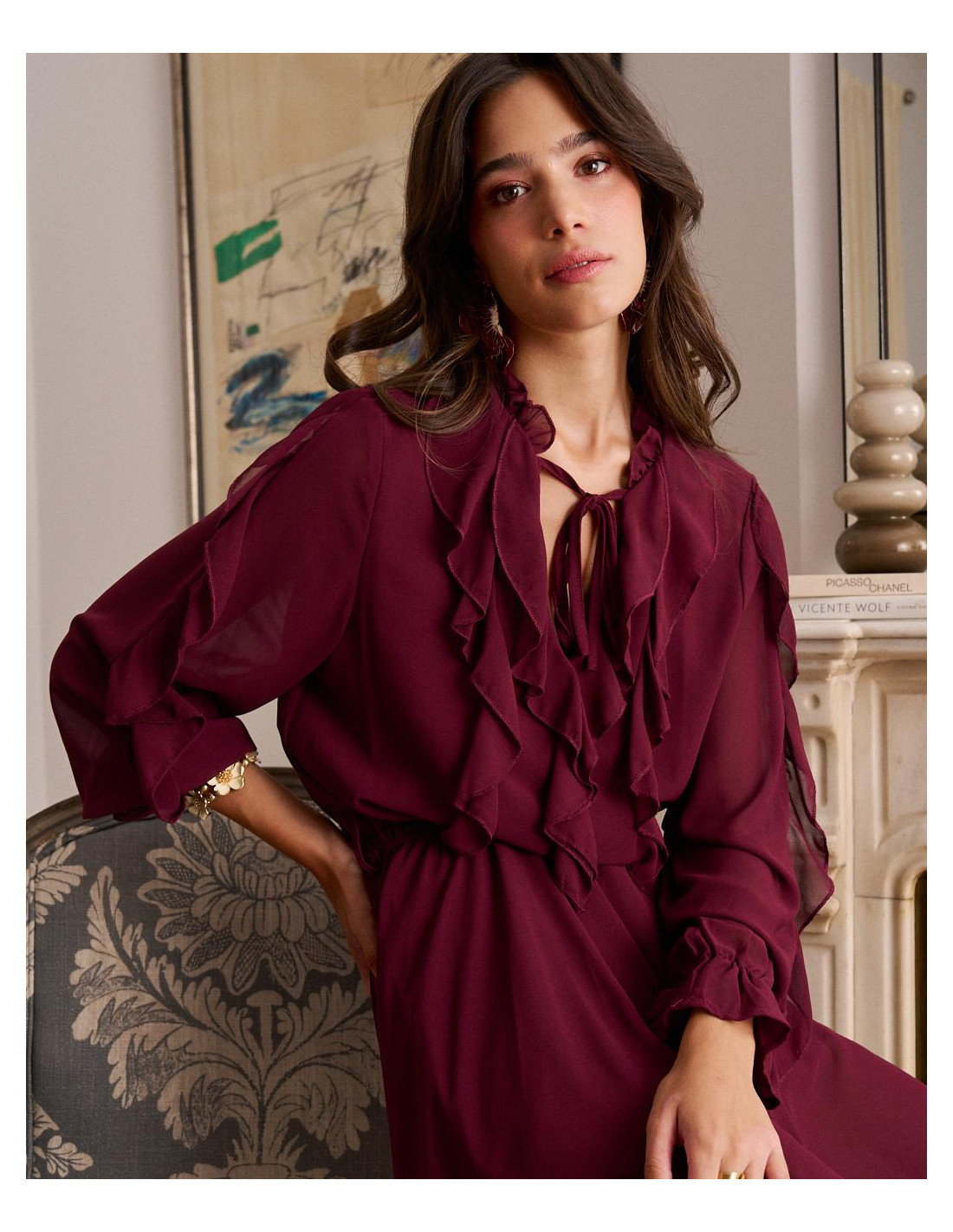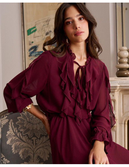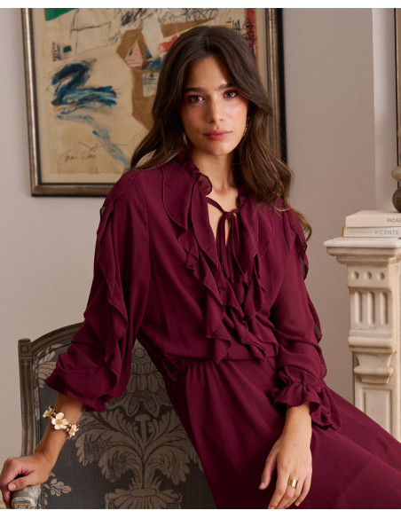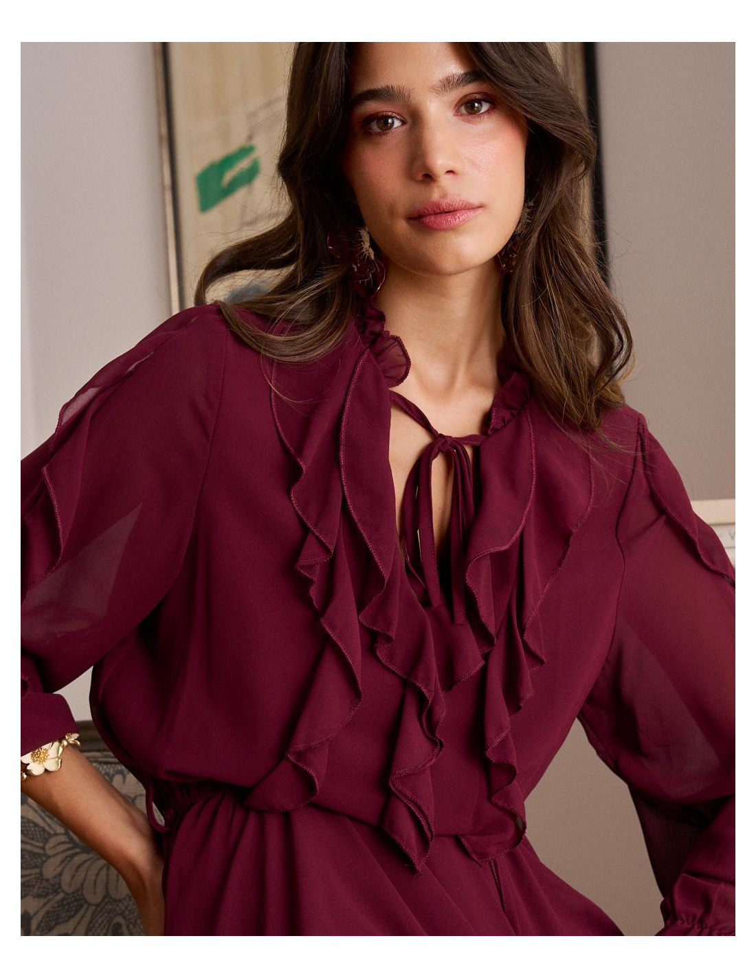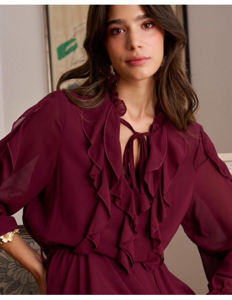 <p><span style="font-size: 10pt; font-family: Arial;">Vestido corto de color burdeos, con un elegante cuello en pico adornado con volantes. El vestido tiene una cintura de nido de abeja para un ajuste perfecto y la falda tiene un diseño de volante.</span></p>