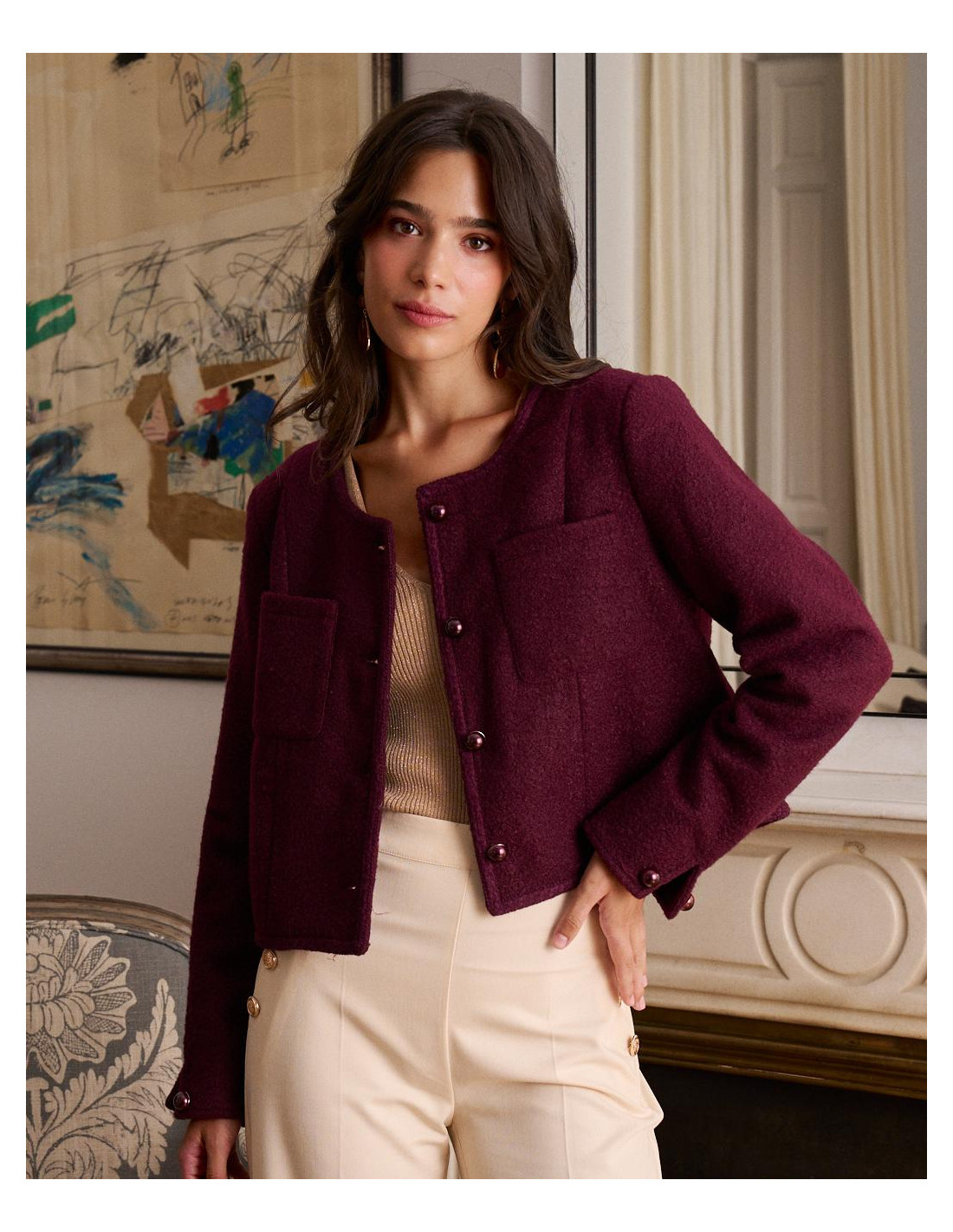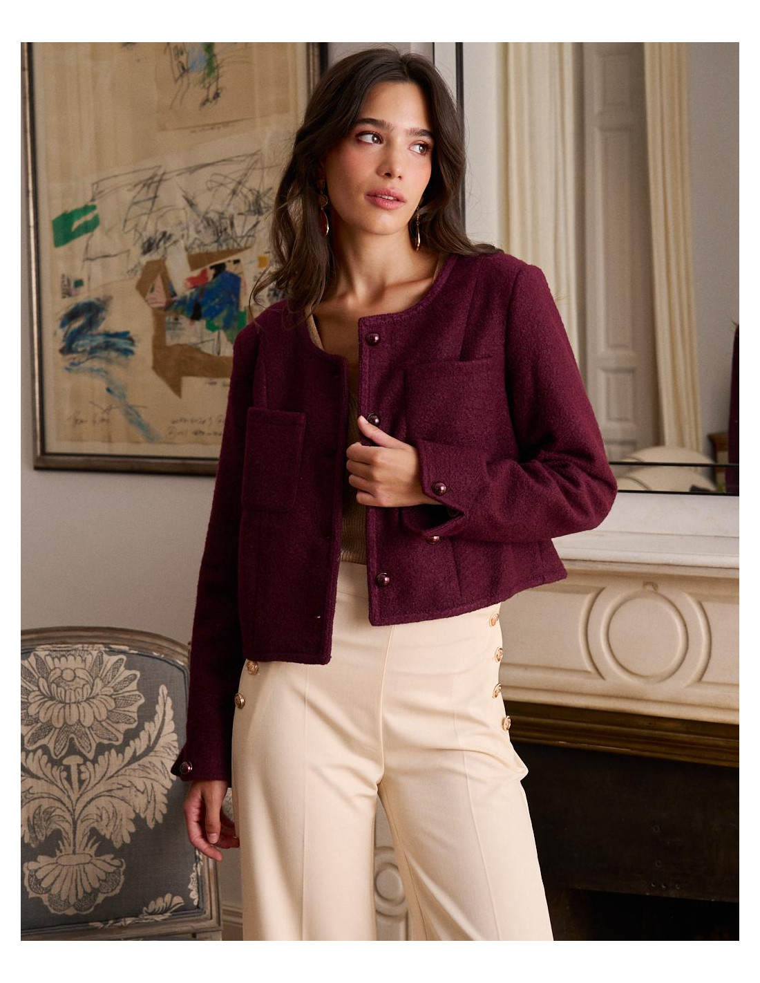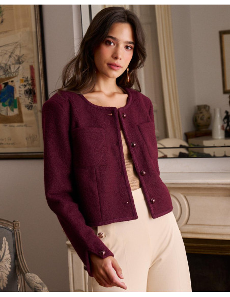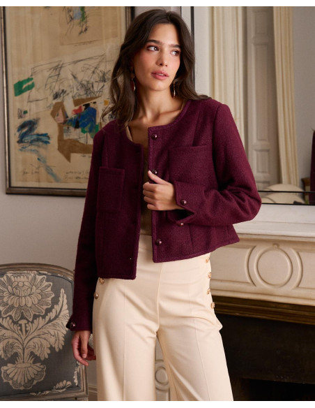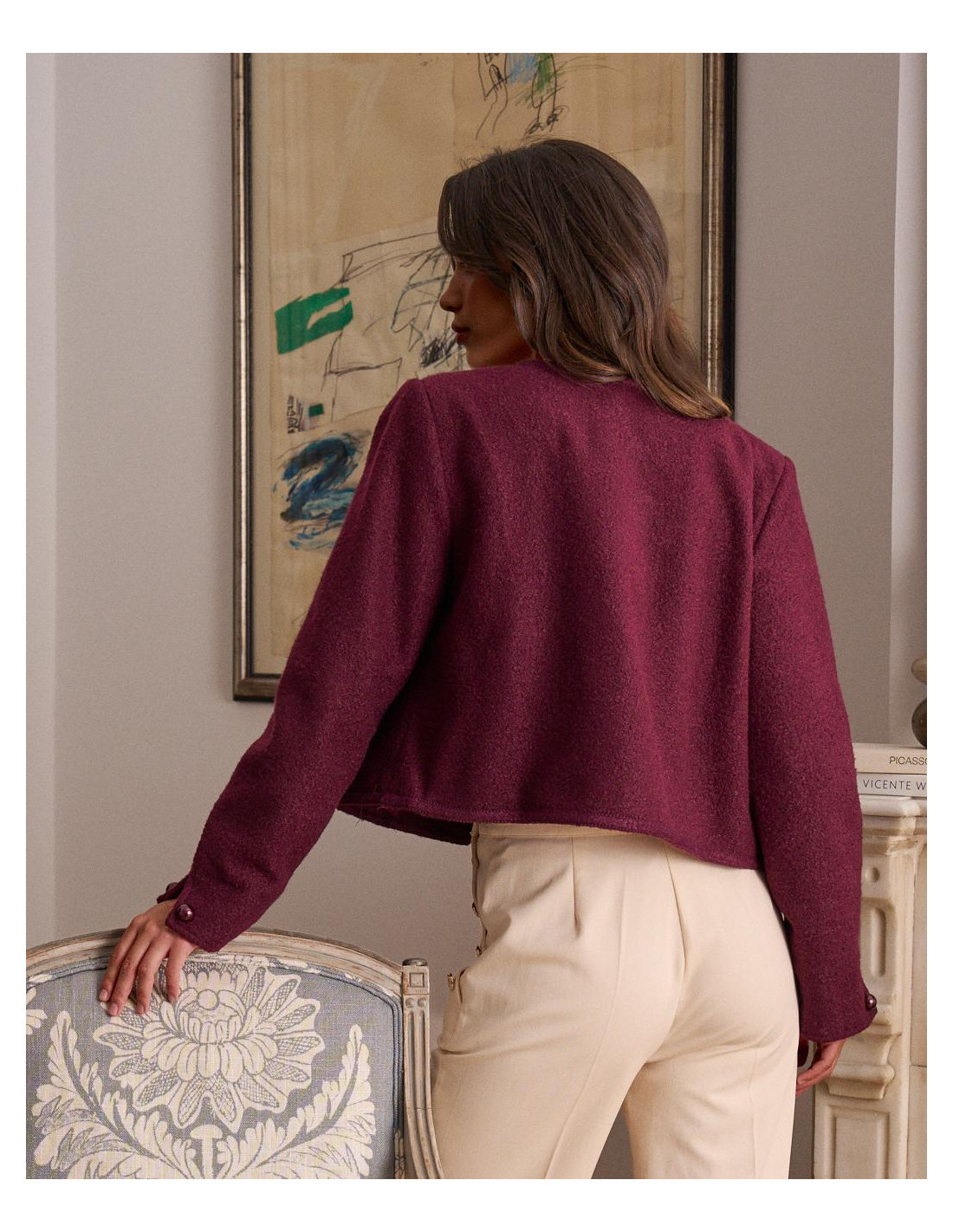 <p><span style="font-size: 10pt; font-family: Arial;">Chaqueta corta en color burdeos con cuello redondo. La chaqueta tiene manga larga, bolsillos en la parte delantera y un cierre con botones. El tejido tiene una textura que le da un toque sofisticado.</span></p>