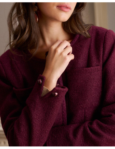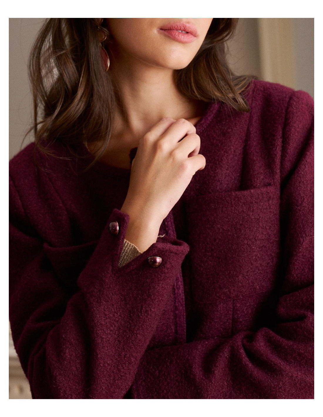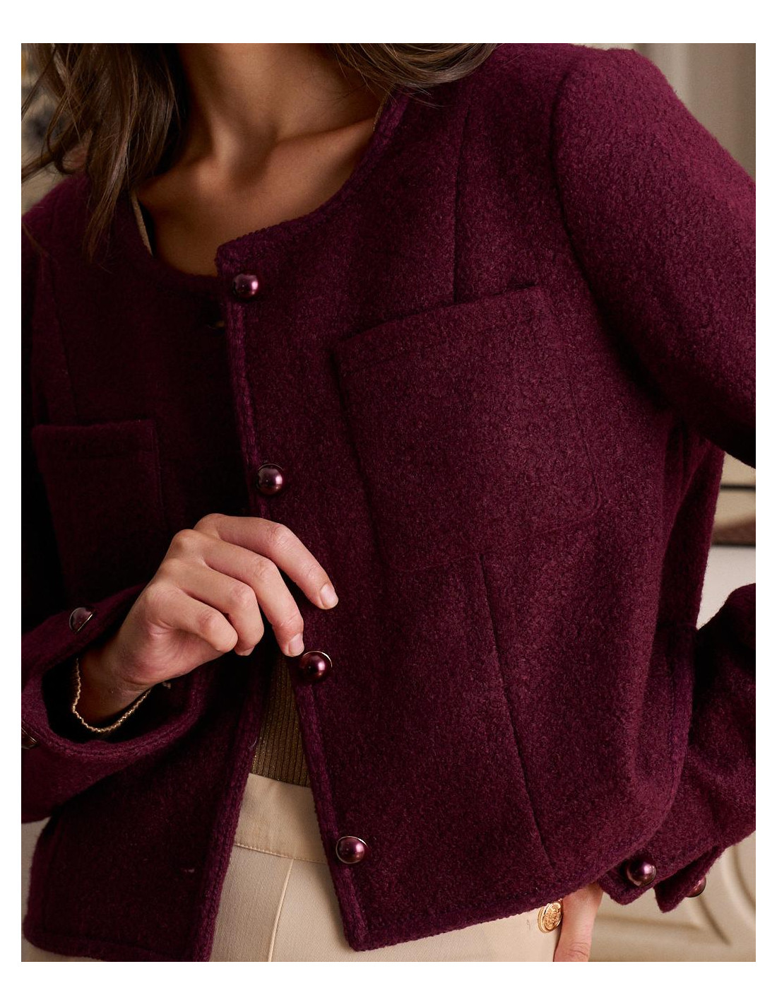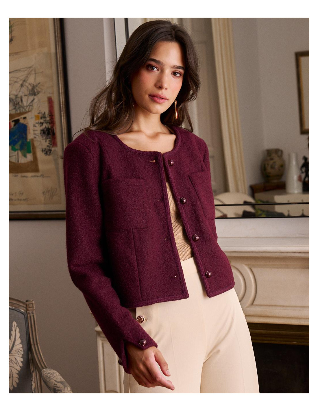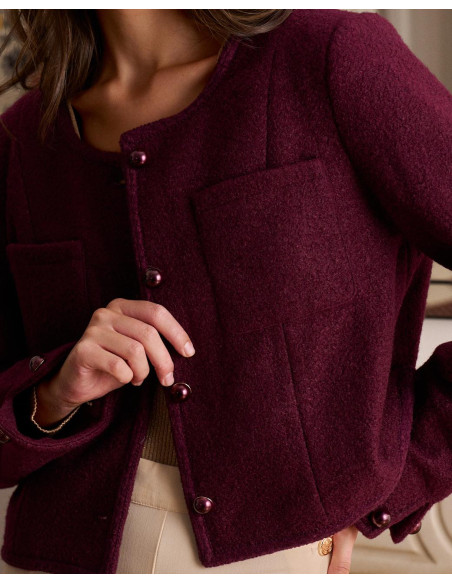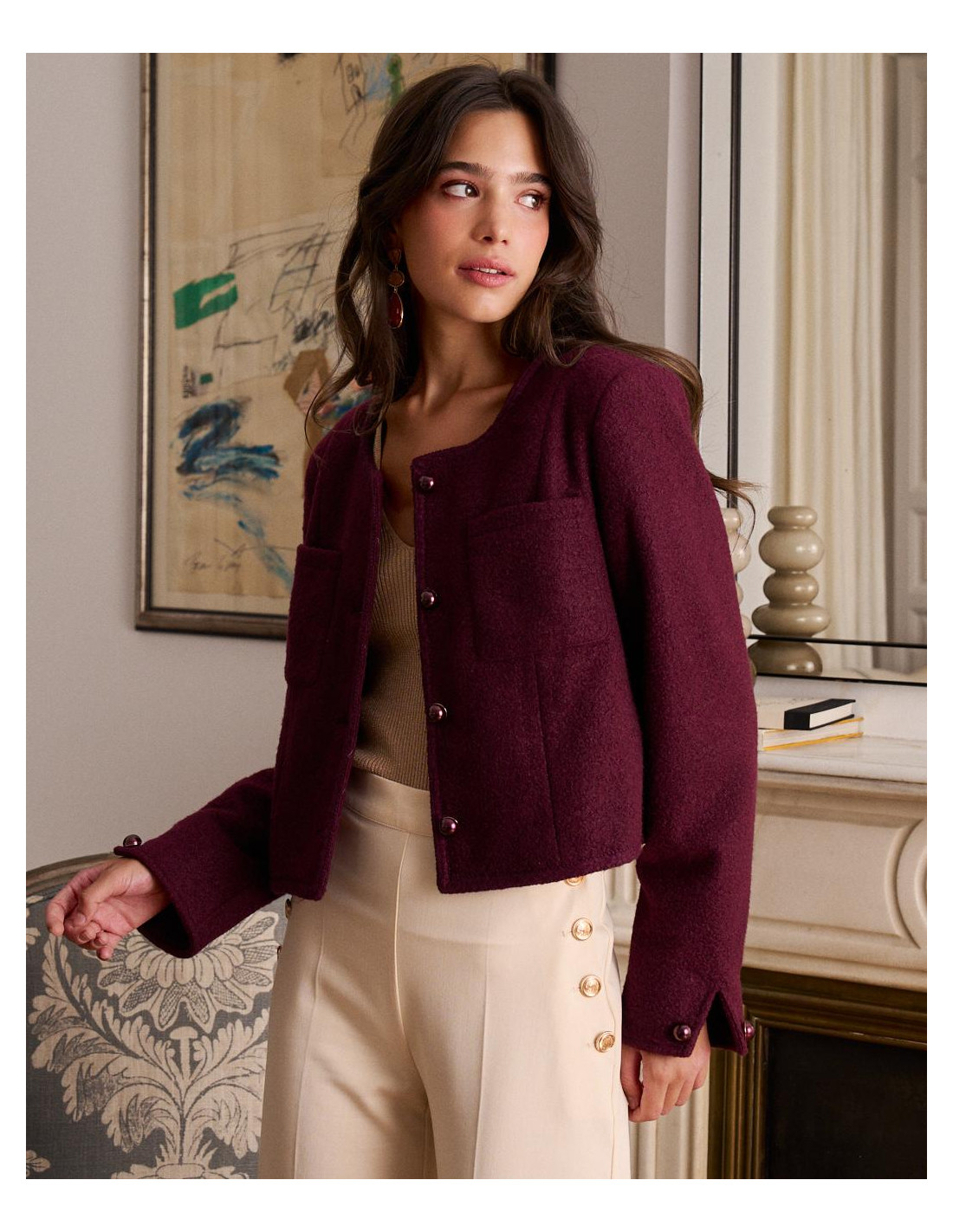 <p><span style="font-size: 10pt; font-family: Arial;">Chaqueta corta en color burdeos con cuello redondo. La chaqueta tiene manga larga, bolsillos en la parte delantera y un cierre con botones. El tejido tiene una textura que le da un toque sofisticado.</span></p>