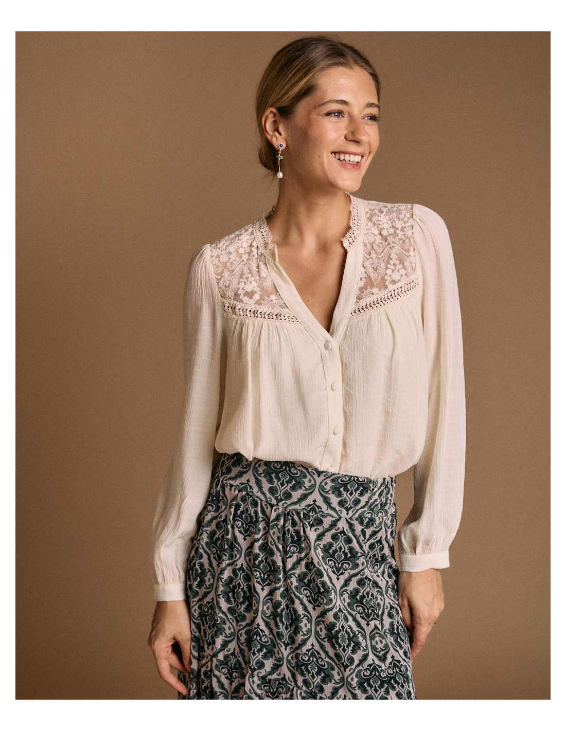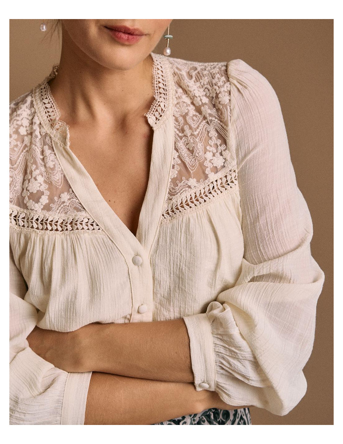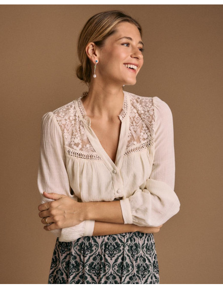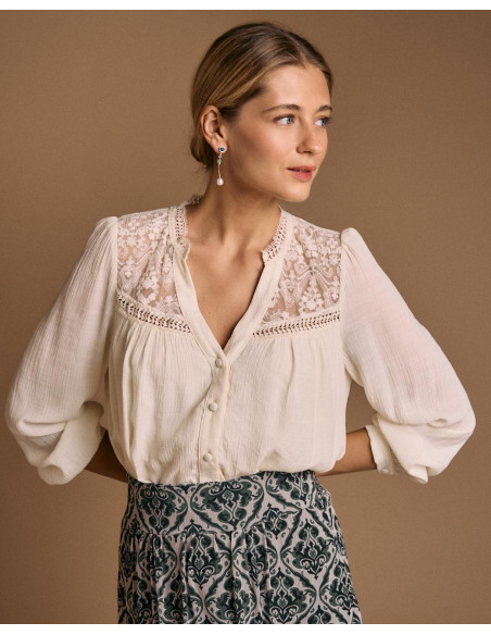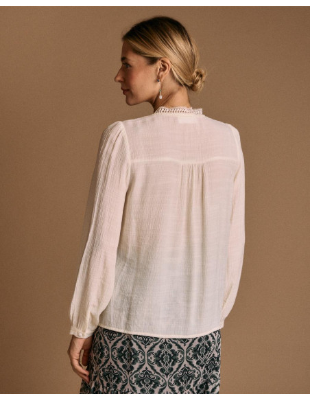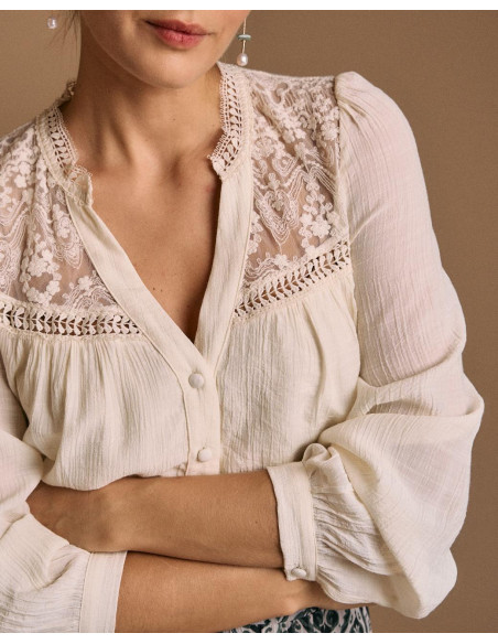 <p><span style="font-size: 10pt; font-family: Arial;">Blusa de manga larga en color crudo, con detalle de encaje en pecho, y cierre de botones en la parte delantera.</span></p>