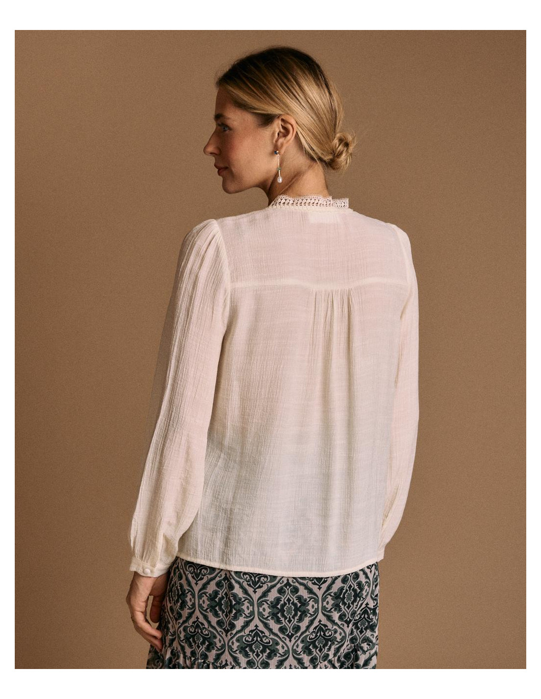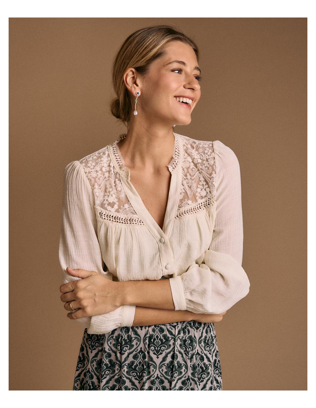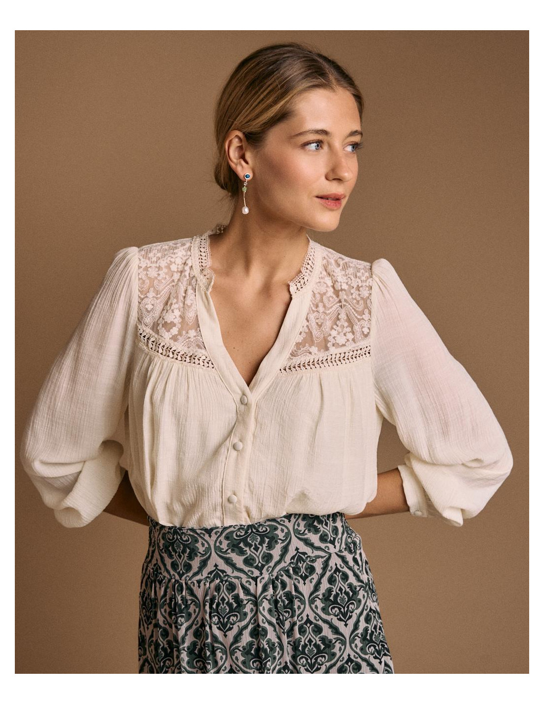 <p><span style="font-size: 10pt; font-family: Arial;">Blusa de manga larga en color crudo, con detalle de encaje en pecho, y cierre de botones en la parte delantera.</span></p>
