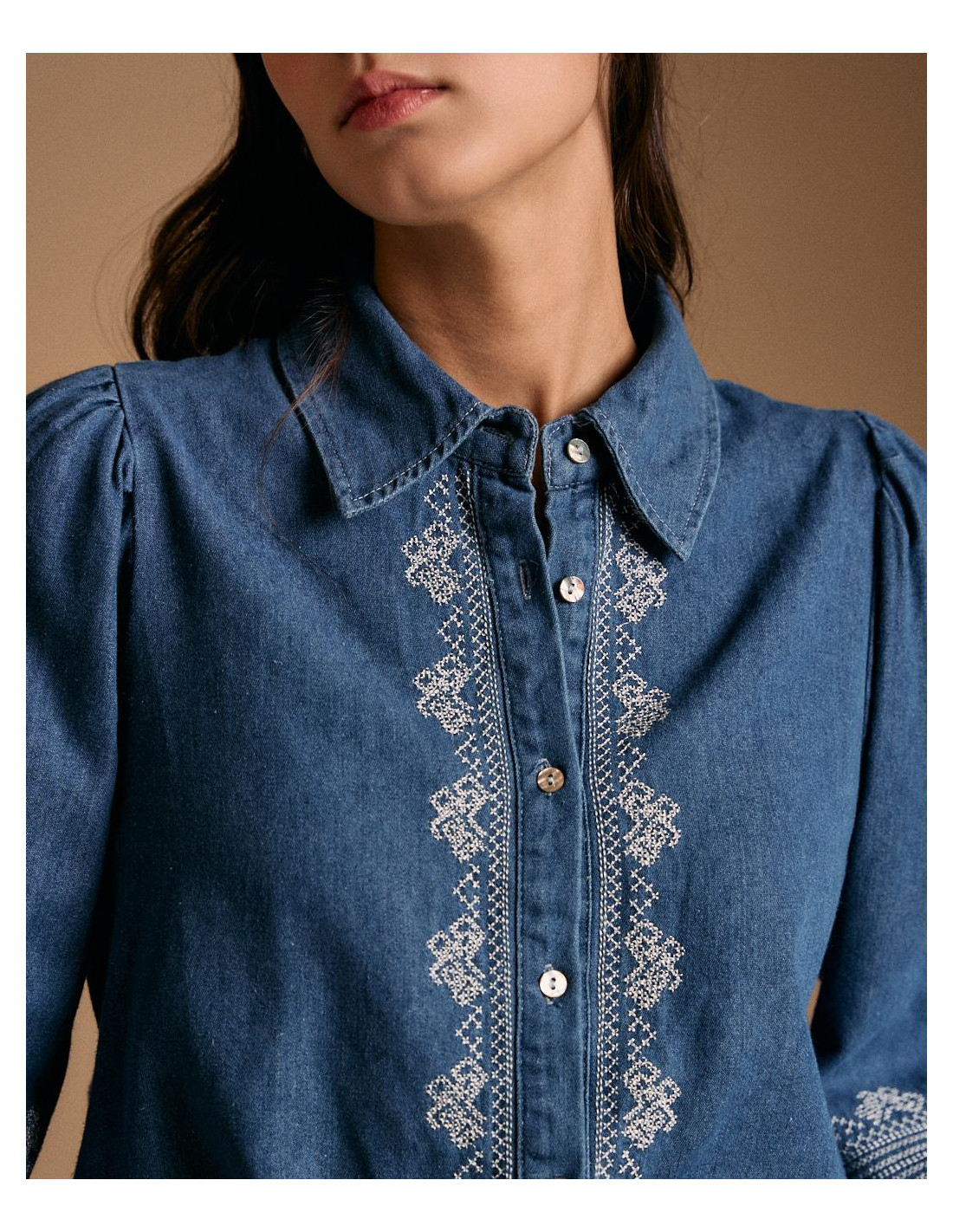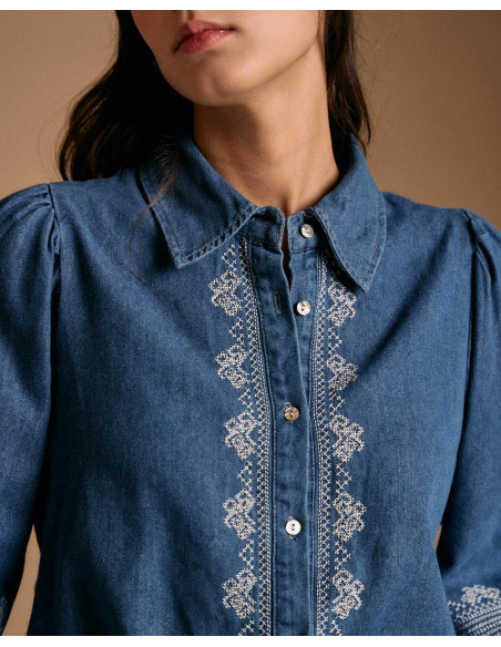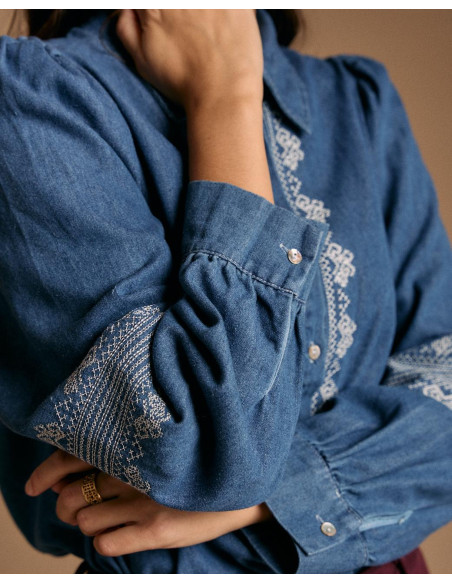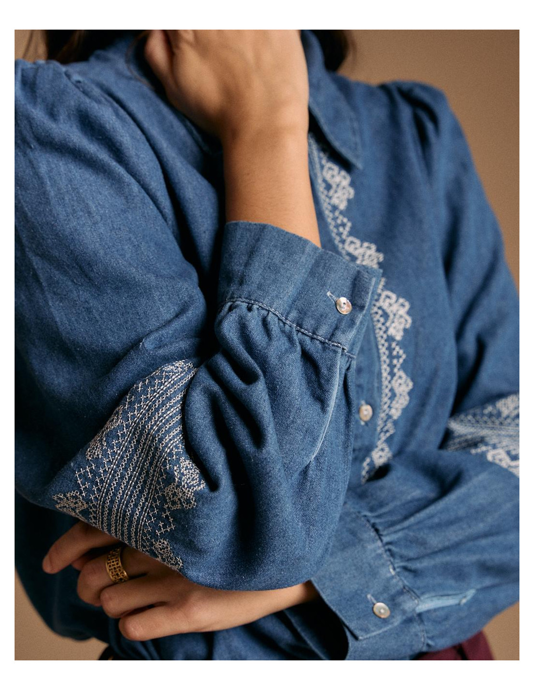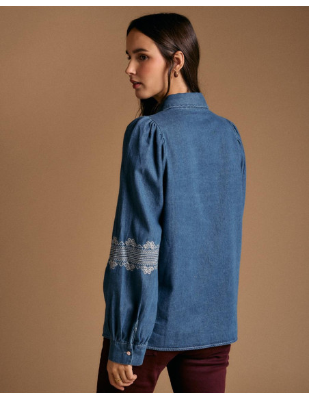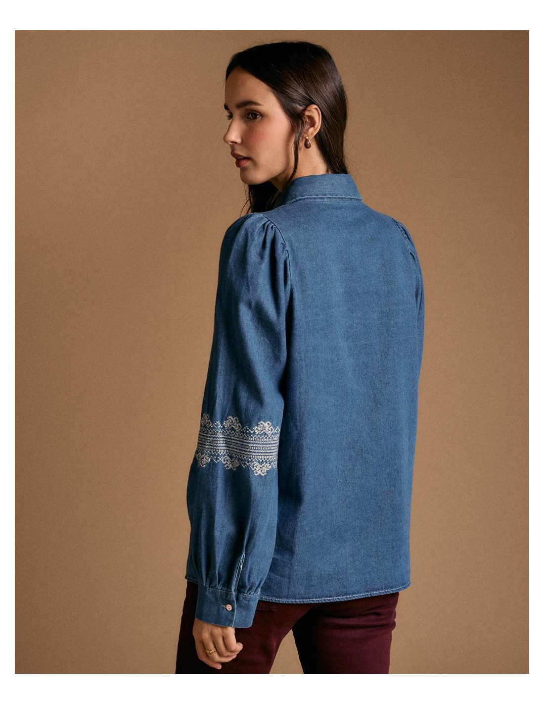 <p><span style="font-size: 10pt; font-family: Arial;">Camisa en color denim con delicados bordados florales en la parte delantera y en las mangas. Diseño con cuello clásico, cierre de botones y puños fruncidos.</span></p> <p><span style="font-size: 10pt; font-family: Arial;">Ideal para dar un aire desenfadado y con estilo a tus conjuntos de diario.</span>