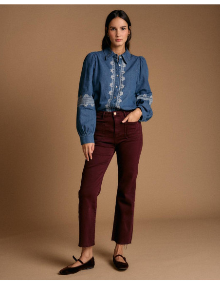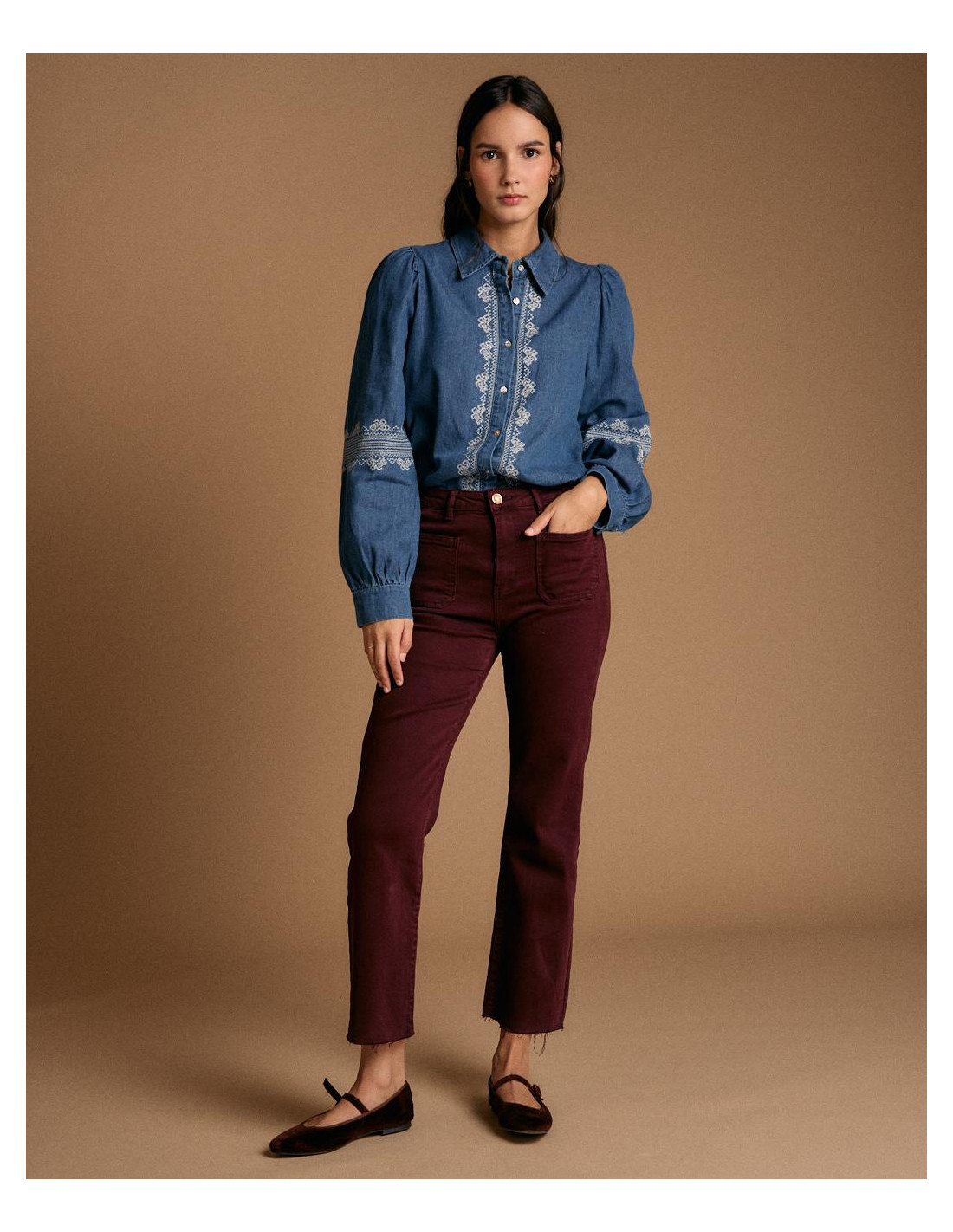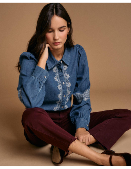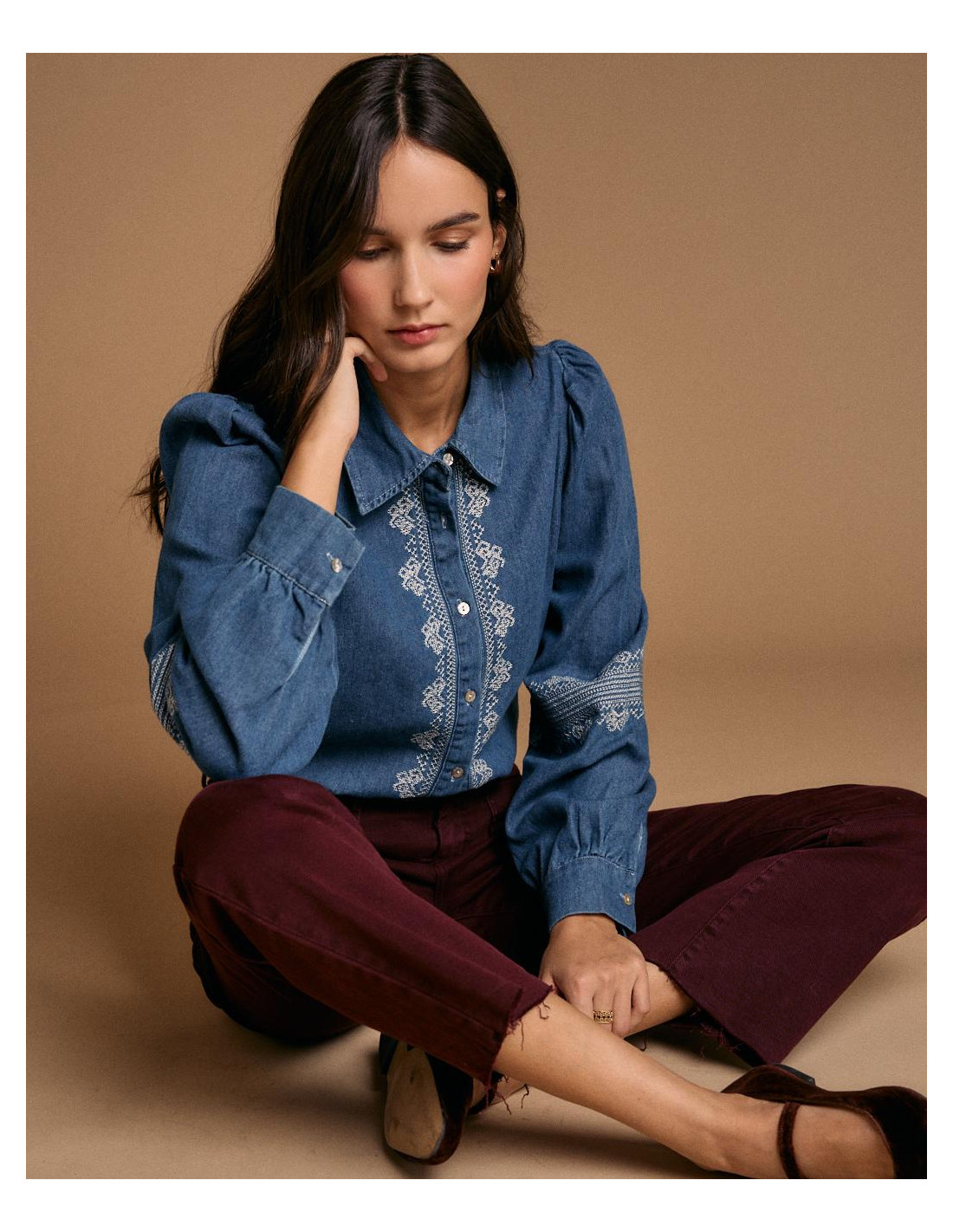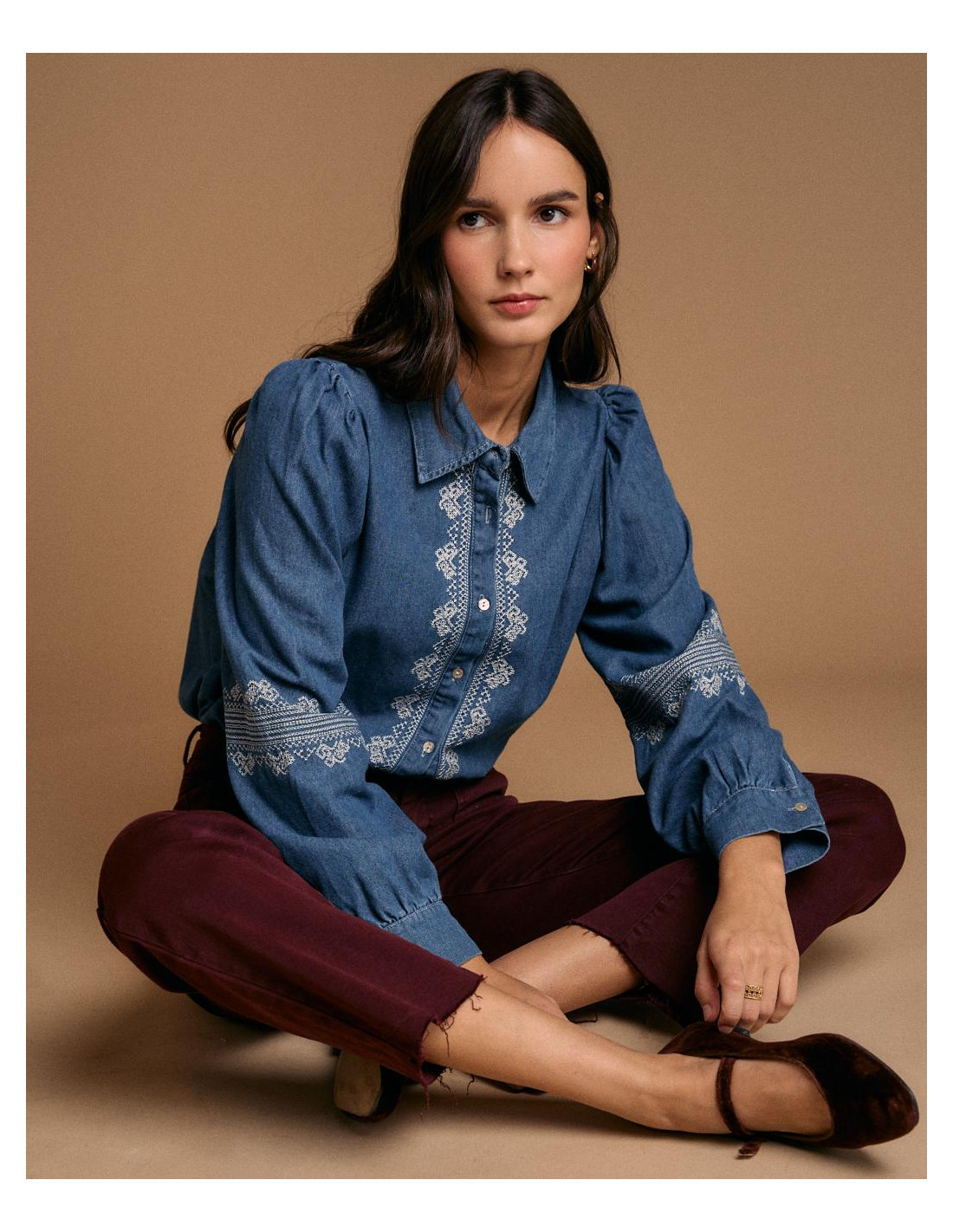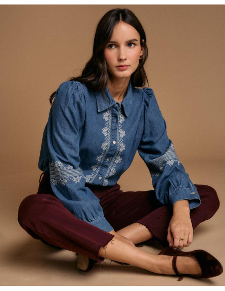 <p><span style="font-size: 10pt; font-family: Arial;">Camisa en color denim con delicados bordados florales en la parte delantera y en las mangas. Diseño con cuello clásico, cierre de botones y puños fruncidos.</span></p> <p><span style="font-size: 10pt; font-family: Arial;">Ideal para dar un aire desenfadado y con estilo a tus conjuntos de diario.</span>