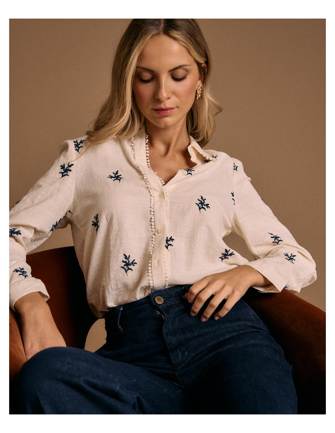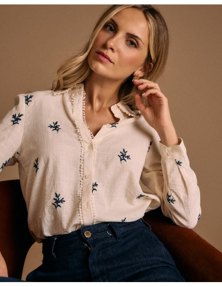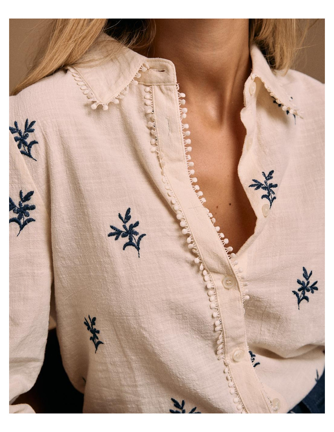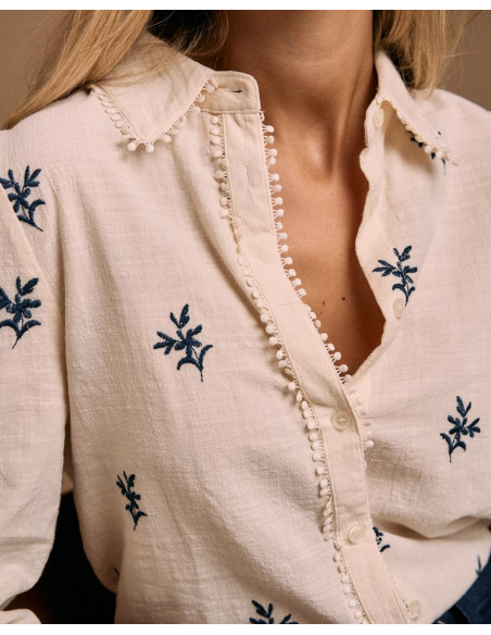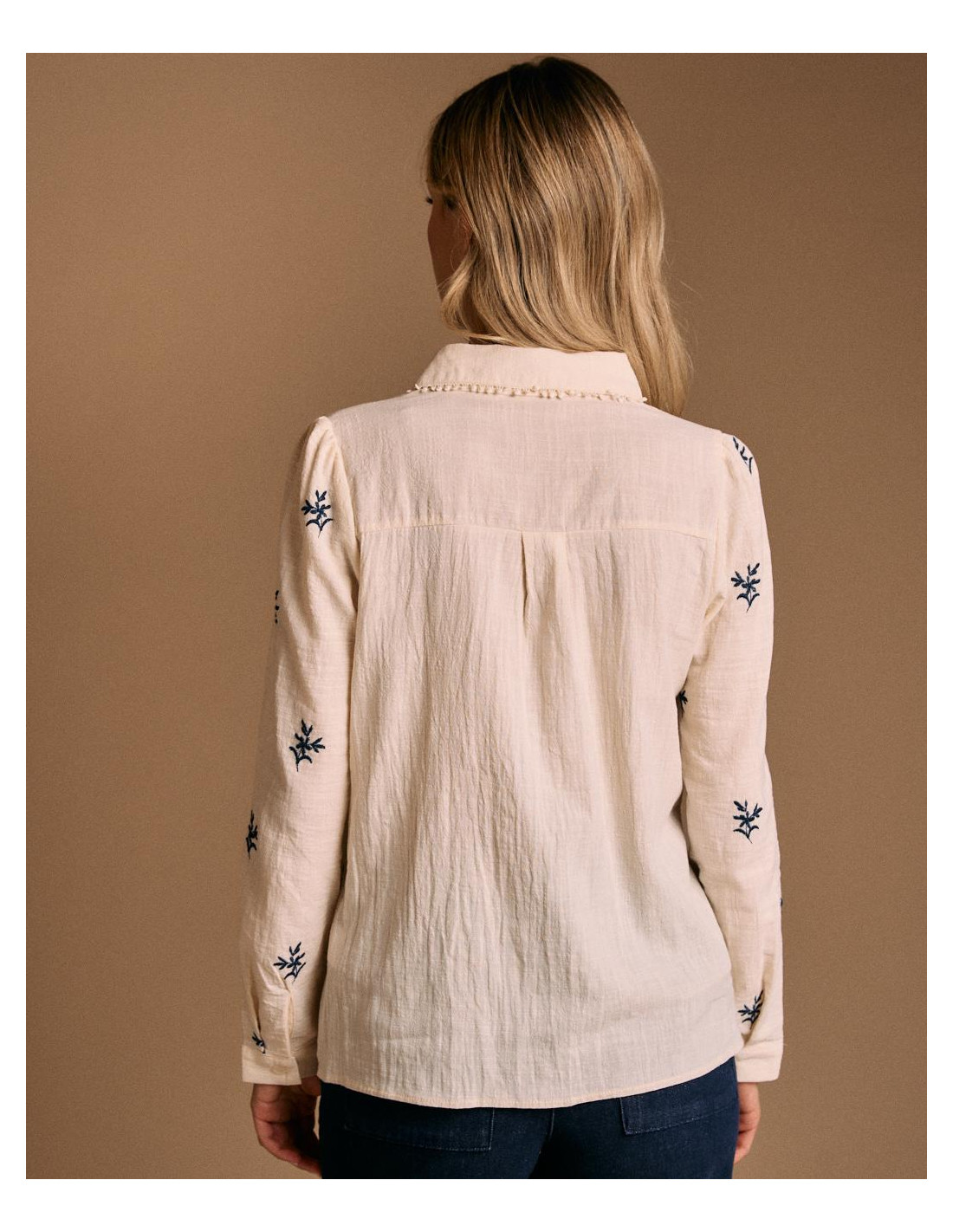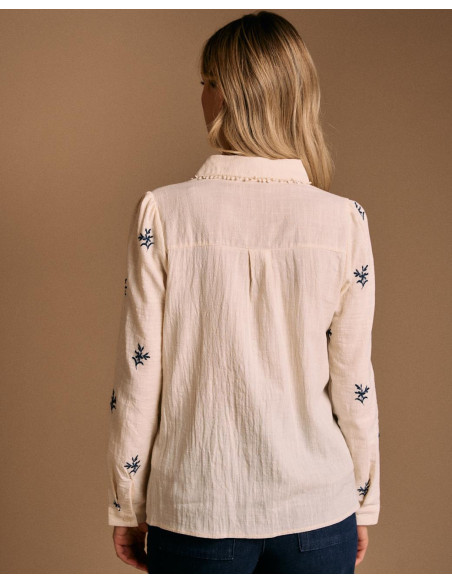 <p><span style="font-size: 10pt; font-family: Arial;">Camisa en color crudo con bordados en contraste. Diseño con cuello camisero adornado con puntilla, cierre de botones y manga larga con puños abotonados.</span></p>